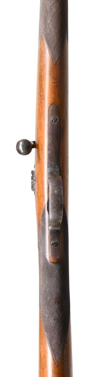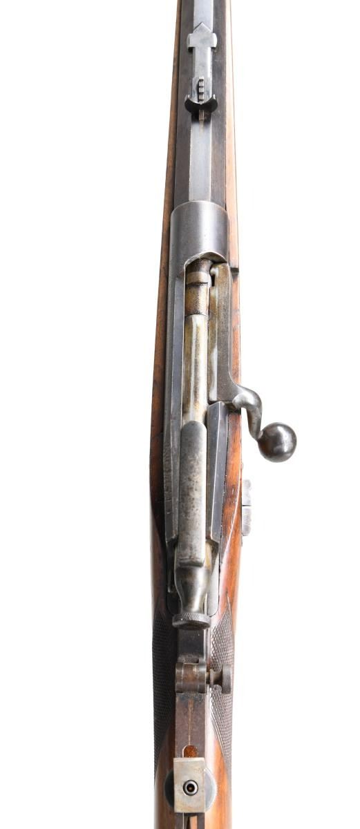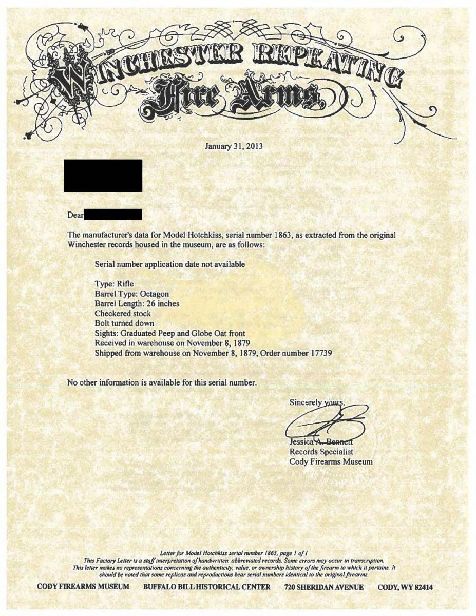 SPORTING RIFLE. Cal. 45-70. S# 1863. Winchester's first bolt-action rifle, approx. 84,555 of all types mfg. 1879-99. Bbl. 26" tapered octagon. German silver blade rocky mountain front sight, elevator adj. sporting rear sight & Vernier tang sight. Repeating rifle w/ tubular mag. in stock having safety/mag. cutoff button on right side. Turn down style round knob bolt handle. Sporting style straight grip walnut stock. Features include horn tipped schnable forearm & steel shotgun buttplate w/ hand checkered forearm & wrist. UNATTACHED ACCESSORIES: letter & records check both from the Cody Firearms Museum detail the following information, "Serial number application date not available / Type: Rifle / Barrel Type: Octagon / Barrel Length: 26 inches / Checkered stock / Bolt turned down / Sights: Graduated Peep and Globe Oat front / Received in warehouse on November 8, 1879 / Shipped from warehouse on November 8, 1879, Order number 17739". CONDITION: bbl. & action retain 80% lightly faded blue. Right side of receiver has series of dents on rear portion. Stock has moderately worn original finish showing numerous scratches, marks & small dents. Bore retains strong rifling. (01-24807/DS). ANTIQUE. $4,000-6,000.