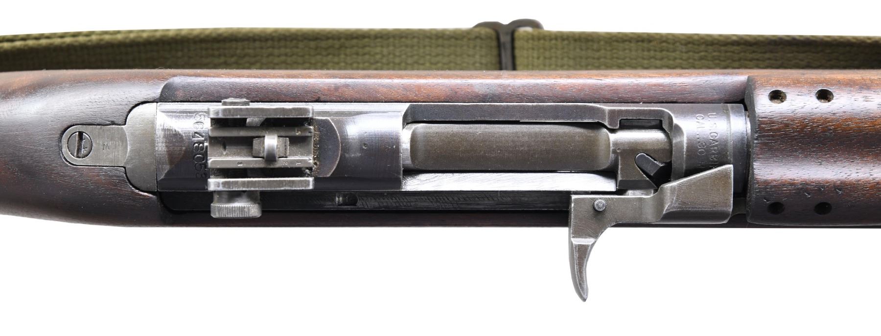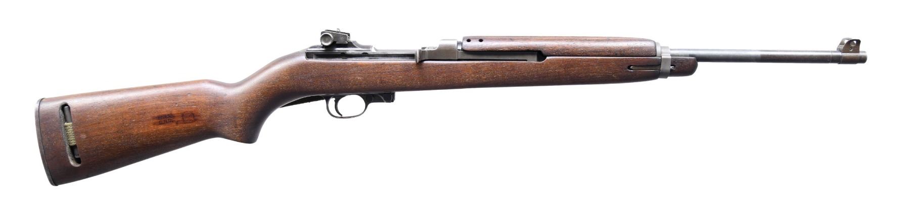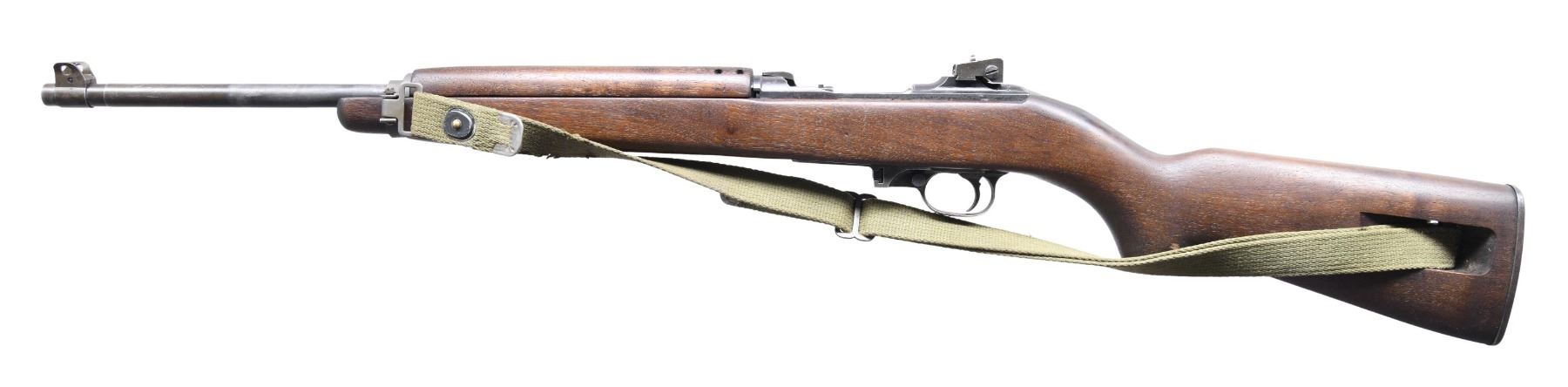 Cal. 30 Carbine. S# 5648053. Bbl. 18". Bbl. is marked mid-way between forend tip & front sight w/ "W" & is also marked on top w/ the "WP" proof. Milled adj. aperture rear sight marked w/ "H" in shield. Blade front sight w/ protective ears. Sight base marked "N". Narrow replacement bbl. band w/ vertical screw & stamped "SWIVEL". Straight cut slide marked "W". Flat bolt marked "W". Milled trigger guard marked "W". Push button safety marked "SW". Mag. catch marked "W". Straight hammer marked "WA". Walnut stock set. Low wood oval cut buttstock is marked on right side w/ faint "WRA / GHD" & "crossed cannons". Recoil plate marked "W". 4 rivet handguard appears unmarked. Green web sling w/ oiler. CONDITION: stock set has lightly worn arsenal rework finish w/ scattered small handling marks. Notable loss of wood in buttplate area. Metal retains 60% original finish w/ thinning & light wear. Very good shiny bore. (25-527/RW). CURIO. $1,000-1,500.