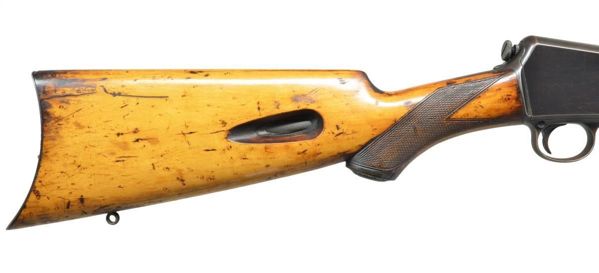 RIFLE. Cal. 22 Win. Auto. S# 25056. Bbl. 20" with bead front & No. 40A rear sight. Blue finish. Forend & Deluxe pistol grip stock of rarely seen Birds Eye Maple. Features include style "H" checkering, small hard rubber grip cap & uncommon eyes for Winchester sling hooks. Mag. tube inserts thru buttplate & loads on right side. UNATTACHED ACCESSORIES: Cody Firearms record check stating the following: "WINCHESTER MODEL 1903 - SERIAL NUMBER 25056 / Serial number applied on April 29, 1905 / Caliber: 22 Auto / Checkered stock, Pistol Grip / To Russ November 28, 1905 / Birds-Eye Maple stock / Received in warehouse on December 08, 1905 / Shipped from warehouse on December 11, 1905, Order number 37765". CONDITION: Over 80% blue fading to brown on action showing edge & carry wear. Maple stock have worn finish & checkering showing dark spots & handling marks. Stock has a small crack near buttplate peak. Bright bore has sound rifling. (22-4810/ds). curio. $3500-5000.