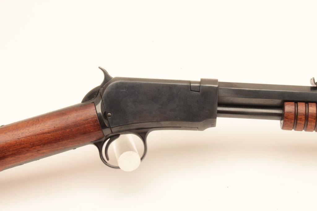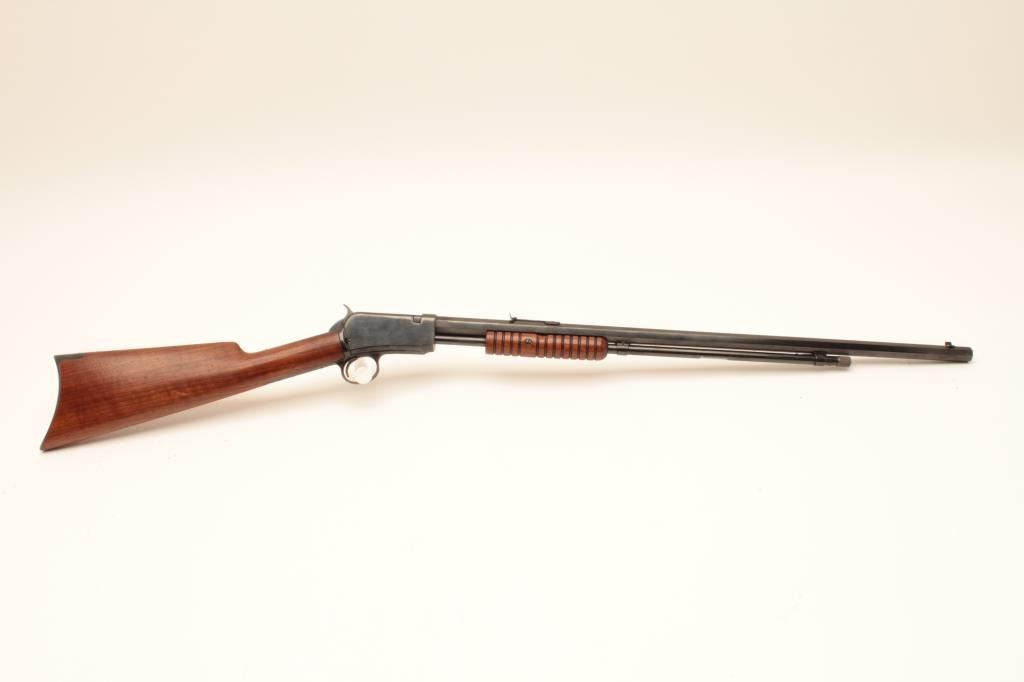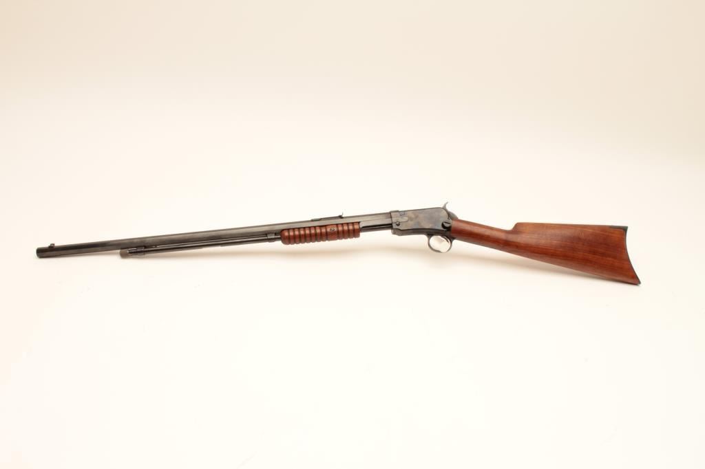 Winchester Model 1890 Pump Action rifle with a 24” octagon barrel in .22 WRF caliber with 4 boxes of Winchester WRF ammo, S/N 433808. Professionally restored with good action and good bore. Sharp markings and attractive wood with a nice appearance. (C&R) Est.: $400-$800
