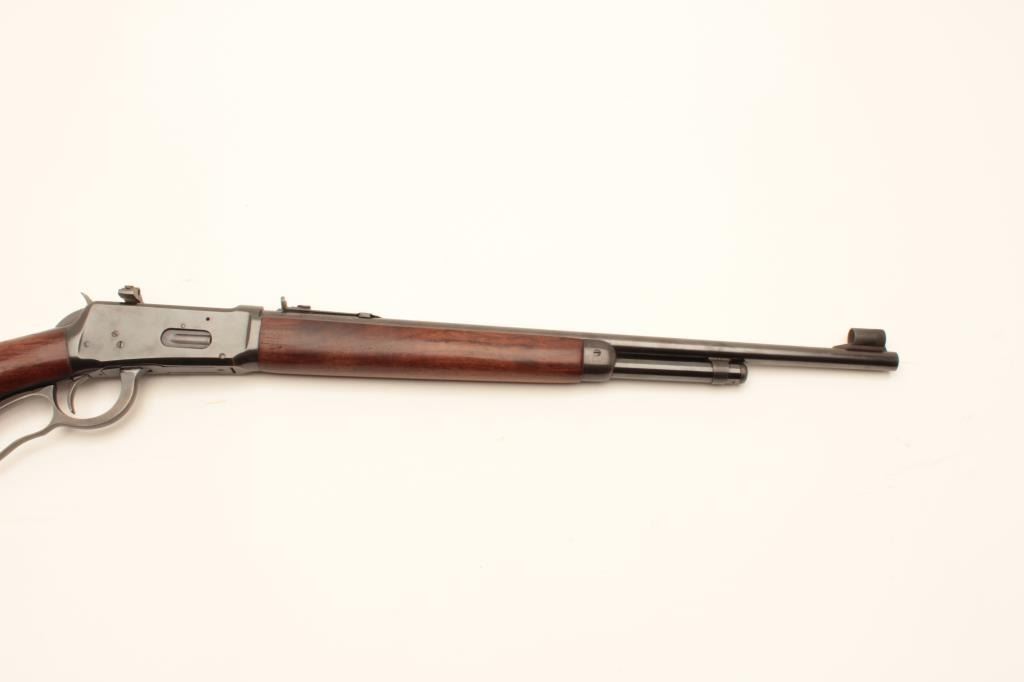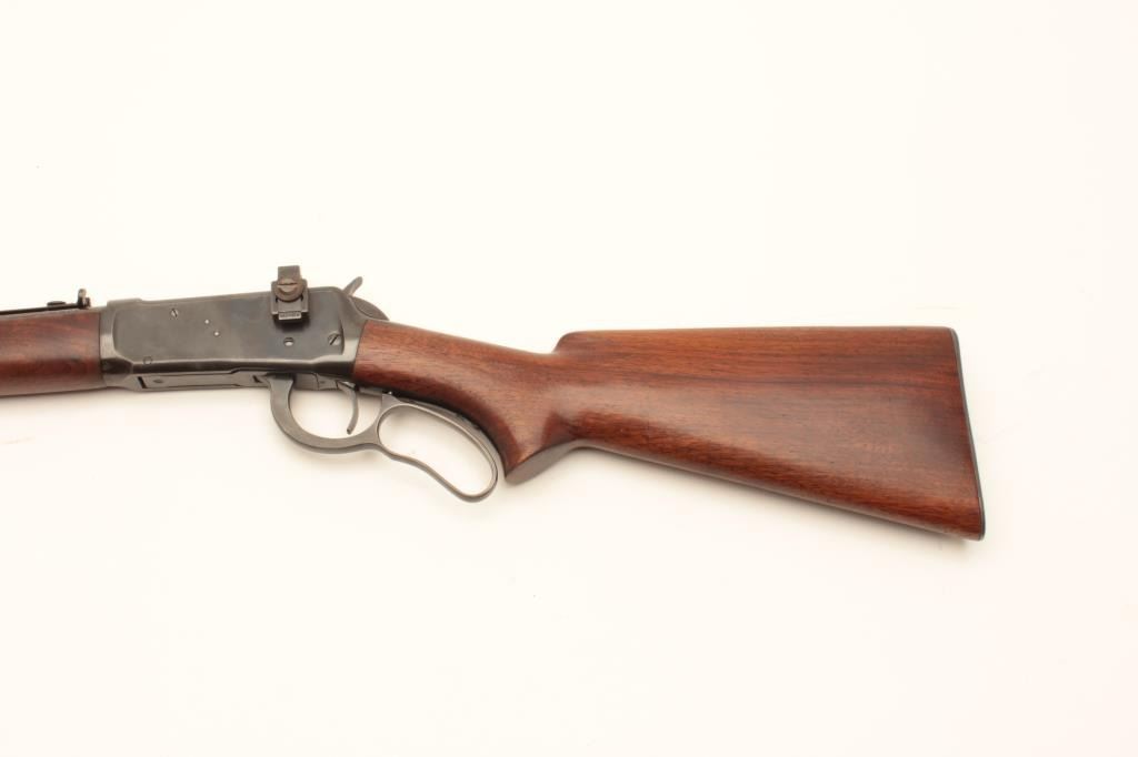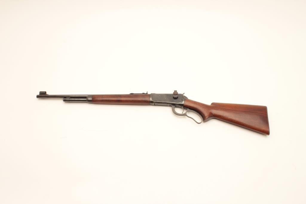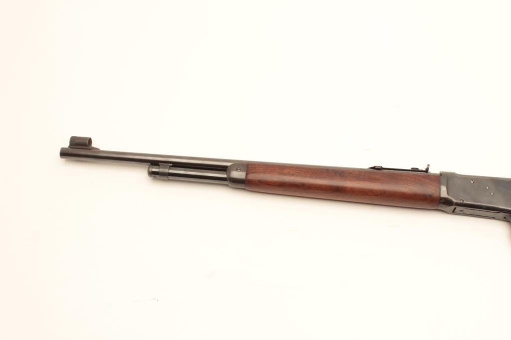 Winchester Model 64 Carbine with Factory 20" bbl, #1308329, made in 1943. 30-30 cal. remaining in very good plus condition with 90-95% toning original blue showing minor loss at muzzle and normal aging, stocks aregood to very good with excellent fit and light cleaning (steel wool-not sanded). 50-60% varnish remains. Sound action, excellent bore, Redfield receiver sight added. Scarce to rare in 20". Est:$900-1800