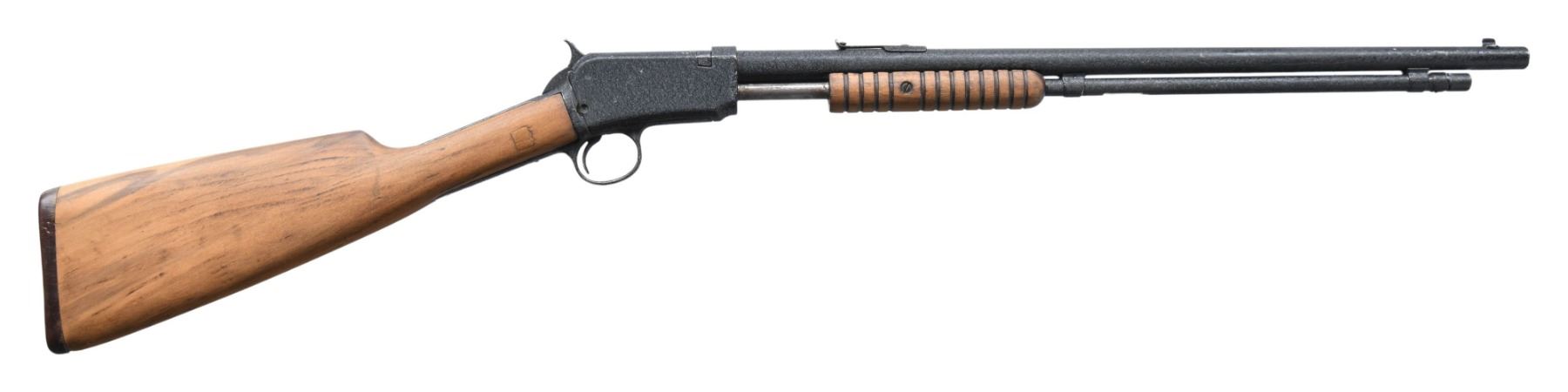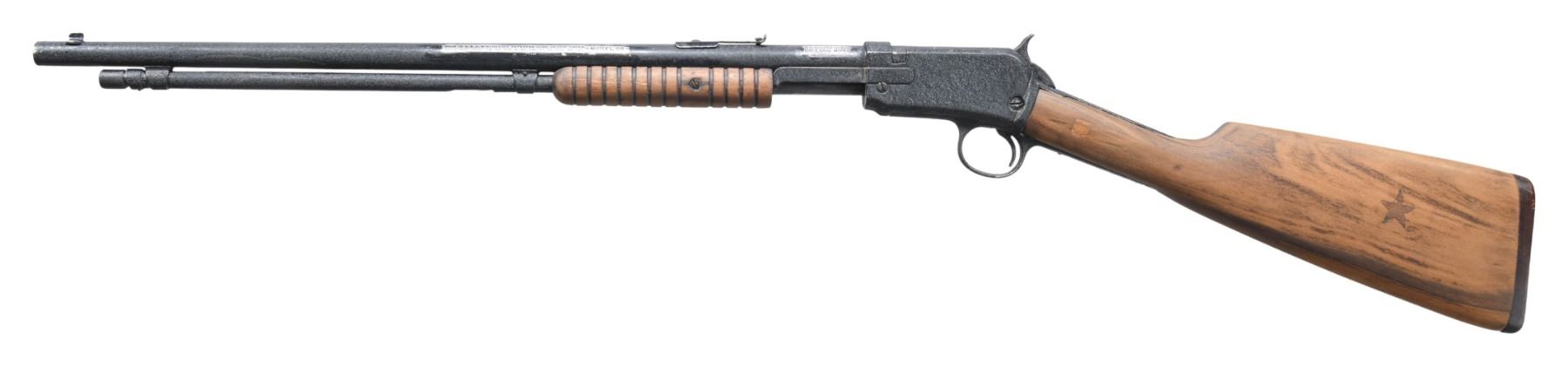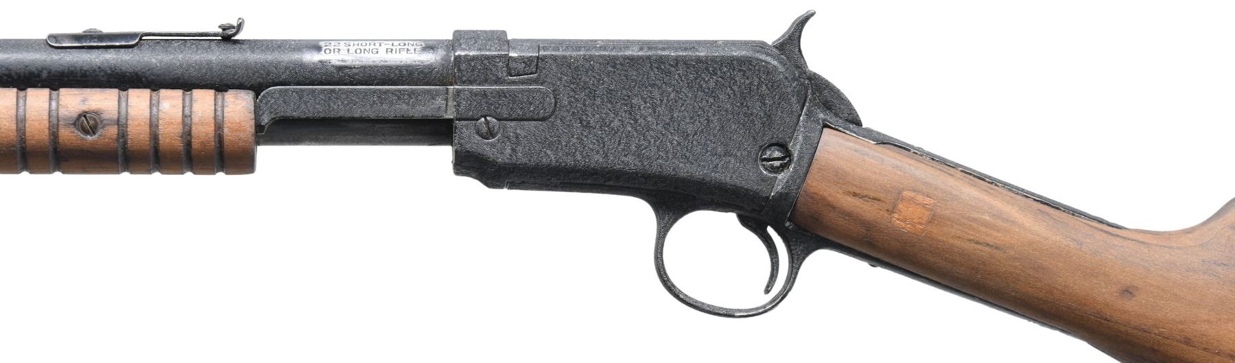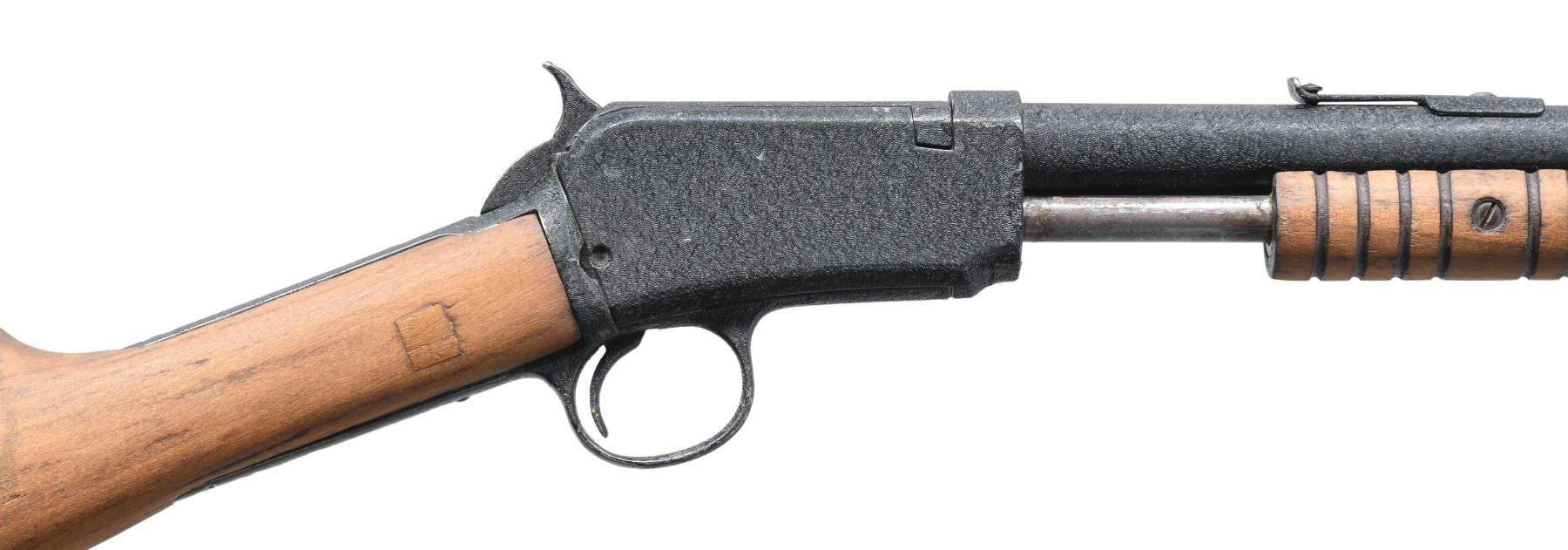 Cal. 22 S, L, LR. S# 826479. Bbl. 20". Model 06 slide action rifle mfg. by Winchester post-1935. Left side of the bbl. exhibits cleaned sections of finish showing original factory markings. Metal components exhibit a black "wrinkle" finish. Sanded grooved wood forearm and plain buttstock. Sides of buttstock exhibit replaced square sections of wood at the wrist, with a wood star also present on the left. Smooth unmarked brown hard rubber buttplate. Blade front sight with V-notch rear sight. S# on forward assembly is not visible beneath the finish. CONDITION: metal components retain the majority of their black "wrinkle" finish, showing scattered spots of flaking that show through to gray patina. Very bright bore, retaining strong rifling throughout. Proper manual mechanics. Wood furniture shows a few scratches and marks, but otherwise remains sound. (25-4364/MLW). CURIO. $100-150.