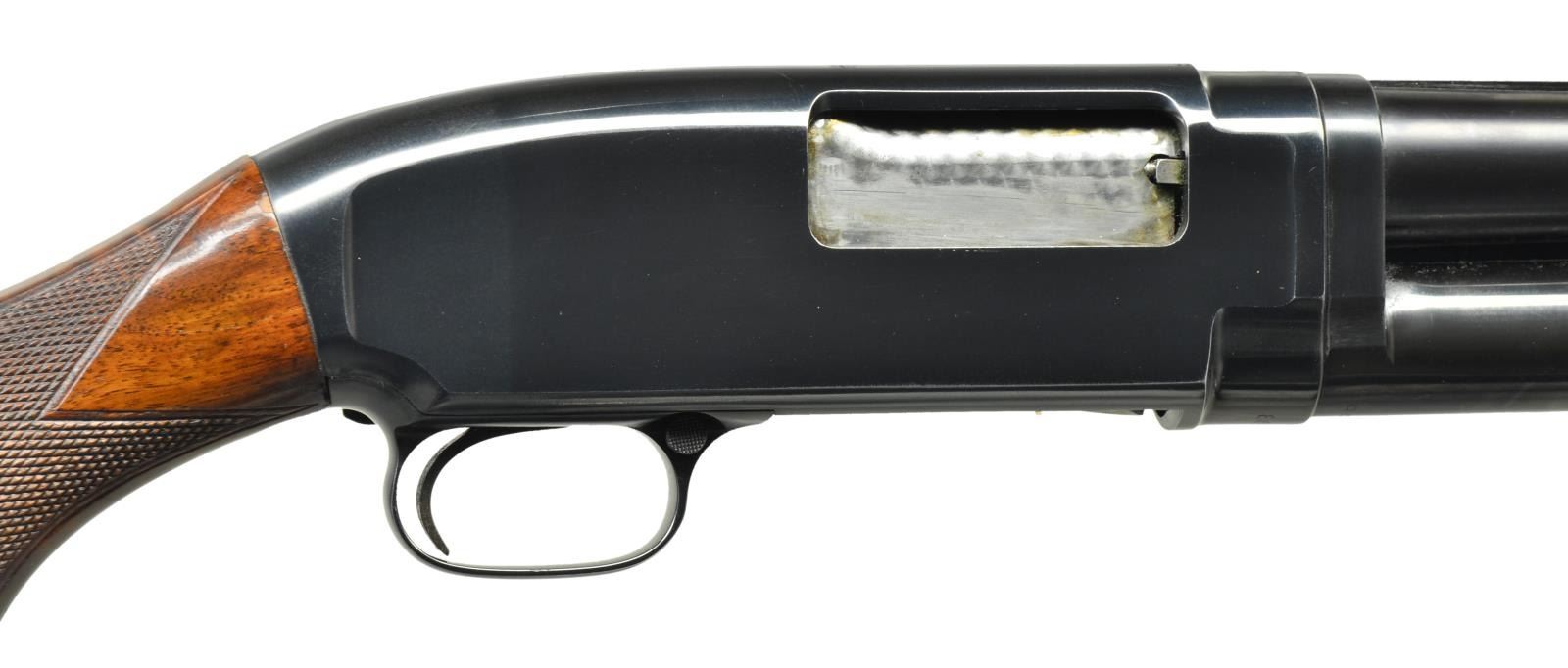SHOTGUN. Cal. 12 Ga., 2 3/4". S# 865704. Bbl. (1) original 30" of Winchester Proof Steel w/ solid rib & red target front sight. Fixed Full choke. Bbl. (2) added 26" of Winchester Proof Steel w/ solid rib having the rare "WS-2" fixed choke. Red target front sight w/ steel mid bead. Receiver extension is numbered to match the gun. Both bbl. assemblies have post WWII vintage beavertail forearms of fancy walnut w/ standard target checkering. Action has added hand jeweling on bolt & carrier. Hard rubber capped pistol grip stock of fancy black walnut w/ post WWII Pigeon grade hand checkering. LOP: 14" over original buttplate. 1941 Mfg. UNATTACHED ACCESSORIES: leather covered 2 bbl. set luggage case w/ green velour fitted interior. Inside lid has Winchester Model 21 label. CONDITION: receiver retains 97% blue showing light edge wear w/ sm. takedown marks on left side. Bolt & carrier retain 50% worn jeweling. Both bbls. retain over 97% original blue w/ bright near excellent bores. Mag. tubes show slide wear. The WS-2 bbl. has 2 notches taken up on headspace ring. Receiver extension has odd bulge on right sight. Both forearms & stock have lightly worn factory finish showing scattered sm. dents & scratches. (21-2302/DS). CURIO. $1,200-1,800.