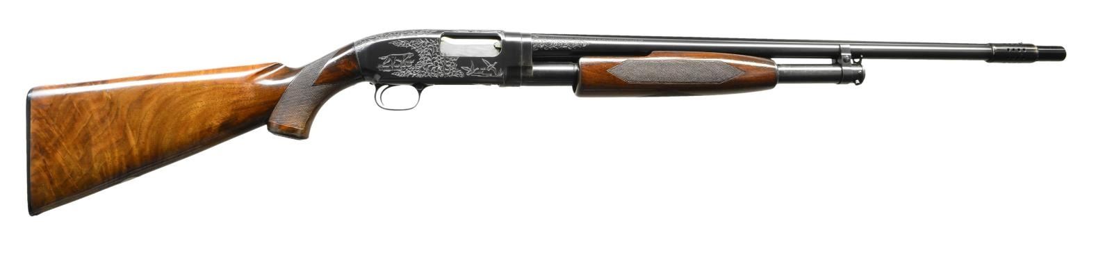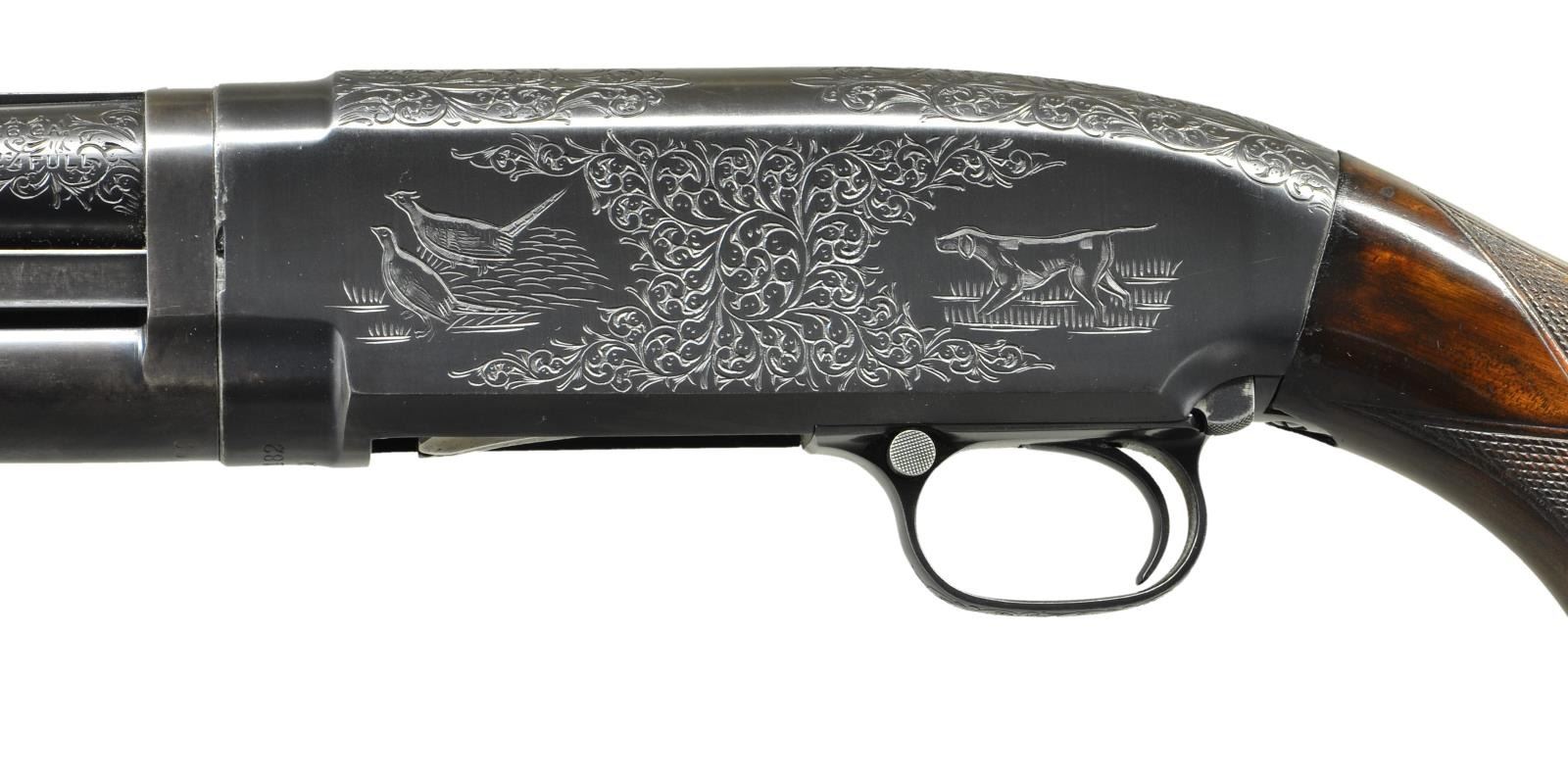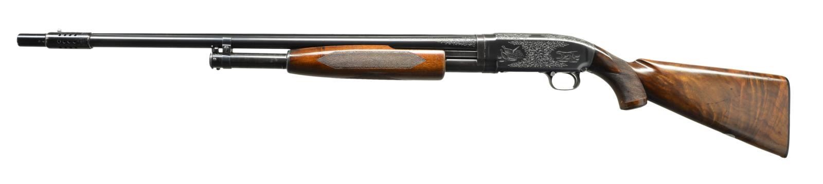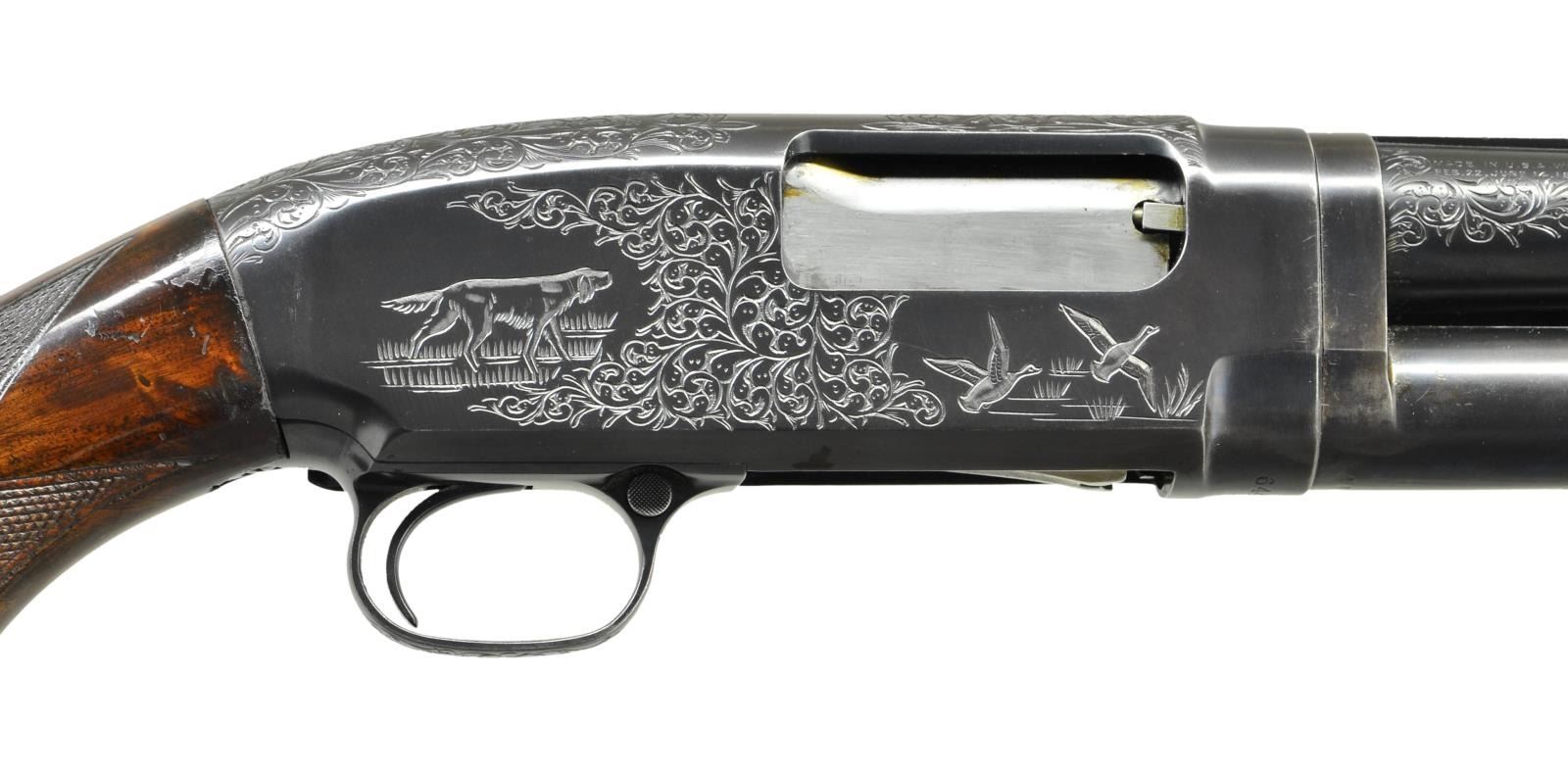 Cal. 16 Ga., 2 3/4". S# 644482. Solid rib bbl. of Winchester proof steel measures 26 5/8" over an aftermarket Weaver choke w/ 3/4 tube & steel bead. Original choke marking is "FULL". Unsigned custom engraving. Right side features a pointing dog & 2 flying mallards. Left side depicts 2 pheasants & a pointing dog. Figures are separated by lg. wedges of foliate scroll w/ complimenting scroll extending to top portions of receiver, trigger guard bow & breech end of bbl. Factory beavertail forearm & hard rubber pistol grip Skeet style stock of fancy walnut w/ target pattern checkering & original buttplate. Toeline of stock has added oval nameplate w/ initials that appear to be "CR". Mfg. 1931. CONDITION: over 80% rust style reblued finish showing slide wear & sm. handling marks. Forearm has lightly worn original finish & checkering showing sm. marks. Stock has lightly worn checkering w/ touched up finish in butt section showing sm. dents, scratches & marks. Sound action. Very good bright bore. (21-2293/DS). CURIO. $900-1,350.