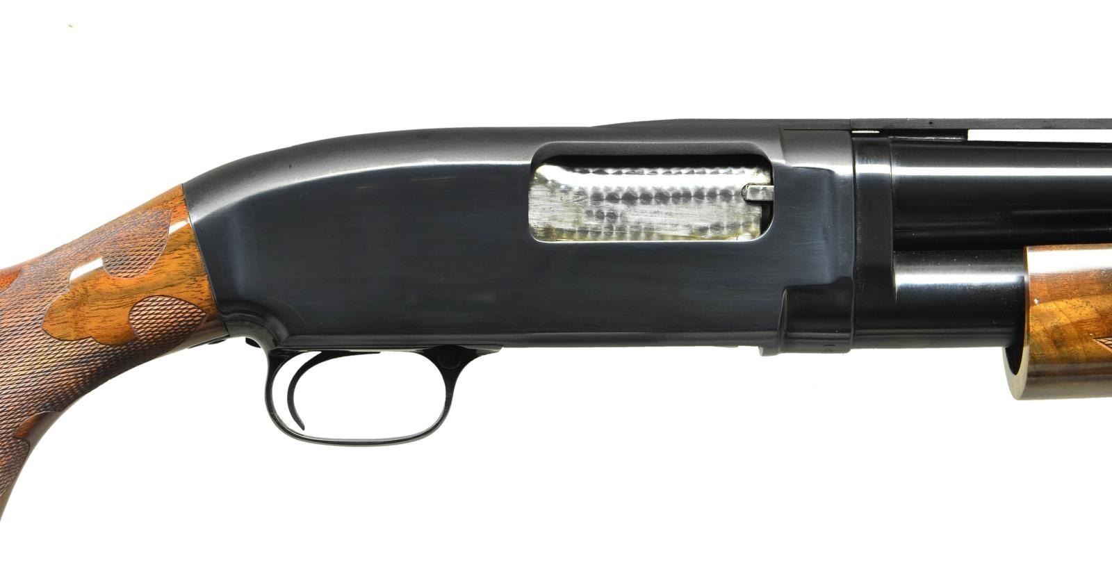 Cal. 12 ga., 3". S# 1416824. Bbl. 30" with large oval post aftermarket Simmons vent rib. Fixed full choke. White target front sight and white mid bead. Action has jeweled bolt and carrier. Custom beavertail forearm and Monte Carlo stock with engraved steel grip cap and gloss finish. Borderless fleur de lis wraparound hand checkering. LOP: 14 3/8" over a solid brown Old English pad. DAC: 1 1/2". Drop at MC: 1 1/4". DAH: 2". Weight: 8 lbs., 9.8 oz. Mfg. 1954. CONDITION: over 98% Simmons reblue showing small takedown marks. Wood has very good custom gloss finish. Bright near excellent bore. (22-2728/DS). CURIO. $1,000-1,500.