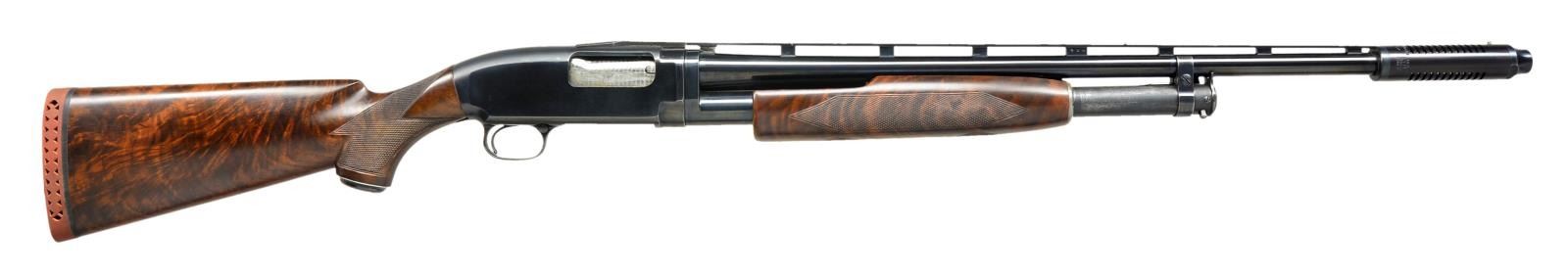SHOTGUN. Cal. 20 Ga., 2 3/4. S# 1924475. Bbl. has factory new style 3 pin VR & is shortened to 25 5/8" over an aftermarket Cutts compensator w/ spreader tube. Steel front & mid beads. Original choke marking is "WS-1". Receiver extension has engraved pigeon. Action has duck bill extension w/ jeweled bolt & carrier. Factory beavertail forearm & steel capped pistol grip stock of fancy walnut w/ pigeon grade checkering. LOP: shortened to 13 7/8" over an added Winchester red ventilated pad. Mfg. 1961. CONDITION: over 90% blue showing slide wear on mag. tube. Wood has good refinish w/ freshened checkering showing sm. marks. Steel grip cap shows sanding around edge. Good mechanics. Very good bright bore. (21-2429/DS). CURIO. $1,250-1,750.