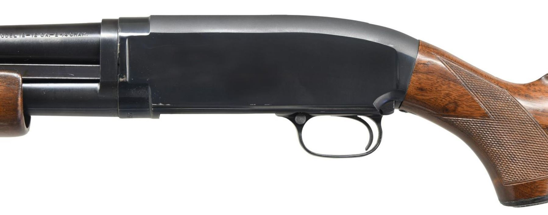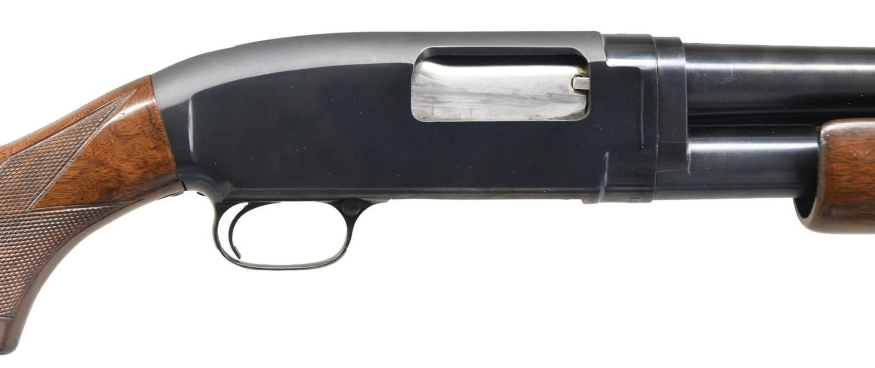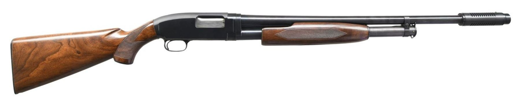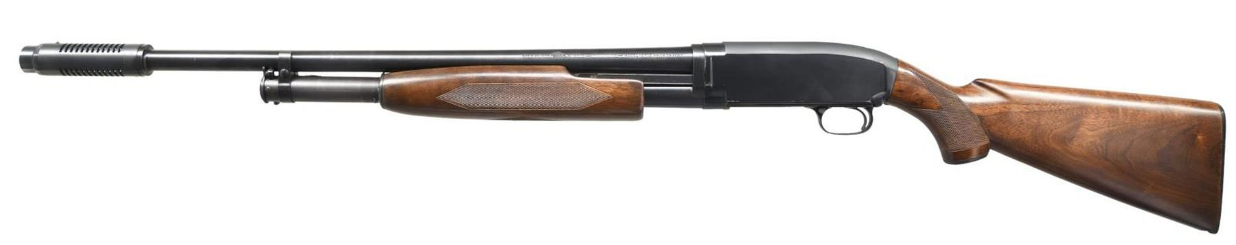 FACTORY INSTALLED CUTTS COMPENSATOR. Cal. 12 GA, 2 3/4". S# 1328557. Bbl. 26" (with compensator). Model 12 pump action shotgun mfg. by Winchester in 1953. The left side of the bbl. is marked with Winchester's mfg. information, followed by the Winchester trademark logo, as well as the model and cal. designations. Metal components exhibit a blued finish overall. Top of receiver exhibits a matte blue finish. Checkered wood pistol grip buttstock and pump. Bbl. features a factory forged shoulder mounted with a blued steel Cutts compensator that features an aluminum bead front sight. Matching numbers are present on the receiver and bbl. CONDITION: metal components retain the majority of their original factory blue finish, exhibiting some mild wear, with a small area of pitting on the left side of the bbl. Mirror bore. Wood furniture shows some minor nicks and marks from handling and storage, but is otherwise good overall. (23-5524/MLW). CURIO. $300-400.