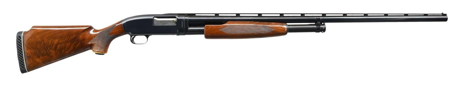Cal. 12 Ga. S# 806015. Bbl. 32" Simmons VR for Super Speed & Super X 3" w/ fixed "FULL" choke. White front & mid beads. Matching S#s on receiver & Bbl. assembly. Fancy burl checkered forend & high comb pistol grip buttstock. Ebony capped pistol grip & added recoil pad give a 14" LOP to aftermarket trigger shoe. CONDITION: metal has been professionally reblued; retaining about 97% coverage w/ the markings only slightly washed. Stock set has an added glossy finish over scattered dings, scratches & some light chipping. Bore is very good, bright & shiny. (23-1283/CW). CURIO. $500-800.
