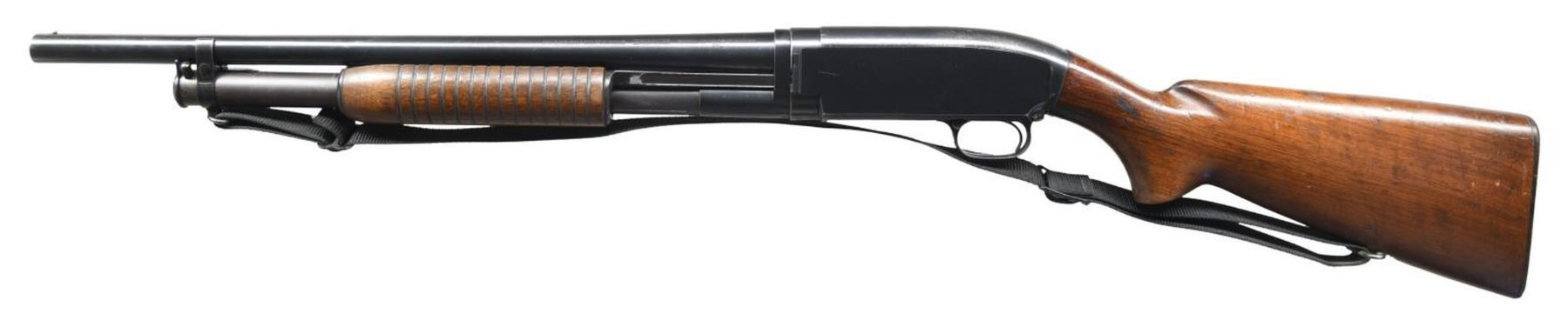 Cal. 12 GA, 2 3/4". S# 1243089. Bbl. 20 7/8". Model 12 pump action shotgun in Riot configuration mfg. in Winchester in 1950. The left side of the bbl. is marked with Winchester's mfg. information, followed by the Winchester trademark logo, as well as the model and cal. designations. Metal components exhibit a blued finish overall. Plain wood straight grip buttstock and grooved forend. Aluminum bead front sight. Underside of butt and bbl. band feature sling swivels that are fitted with a black nylon sling. Matching numbers are present on the receiver and bbl. CONDITION: metal components retain large amounts of their original factory blue finish, exhibiting wear, thinning, and scattered handling marks overall. Mirror bore, exhibiting some scattered firing residue throughout. Wood furniture shows scattered marks and dings, with areas of wear and flaking to the varnish. (23-5487/MLW). CURIO. $400-600.