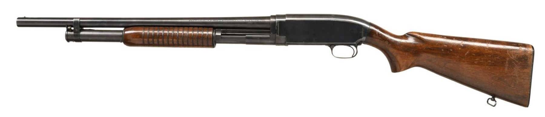 Cal. 12 GA, 2 3/4". S# 1330613. Bbl. 20 3/4". Model 12 pump action shotgun in riot configuration mfg. by Winchester in 1953. The left side of the bbl. is marked with Winchester's mfg. information, followed by the Winchester trademark logo, as well as the model and cal. designations. Metal components exhibit a blued finish overall. Wood pistol grip buttstock with grooved forend. Aluminum bead front sight. Underside of buttstock is fitted with a sling swivel. CONDITION: metal components retain the majority of their original factory blue finish, exhibiting areas of wear and thinning, some scattered handling marks, as well as some spots of mild surface oxidation. Mirror bore. Wood furniture shows scattered marks from handling and storage, with wear and flaking to the varnish finish, but otherwise is sturdy and serviceable. (23-5463/MLW). CURIO. $300-400.
