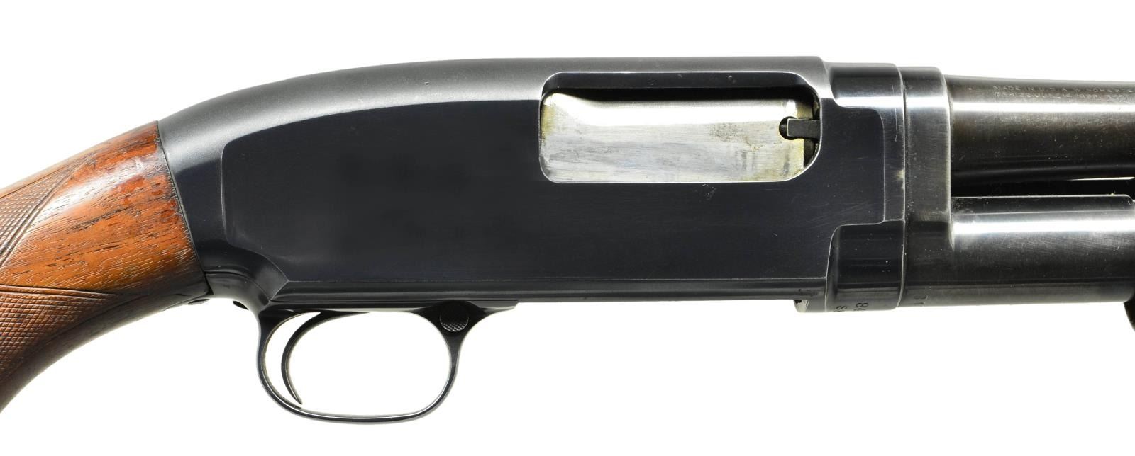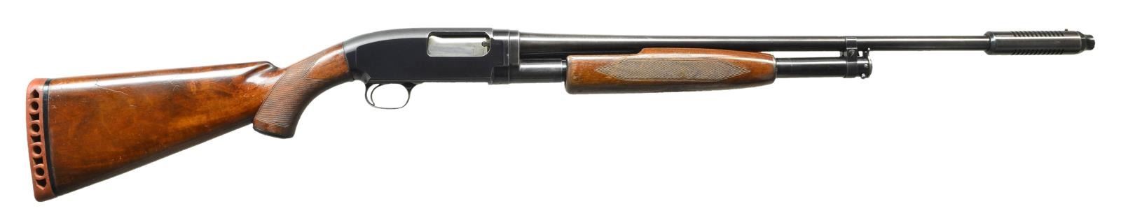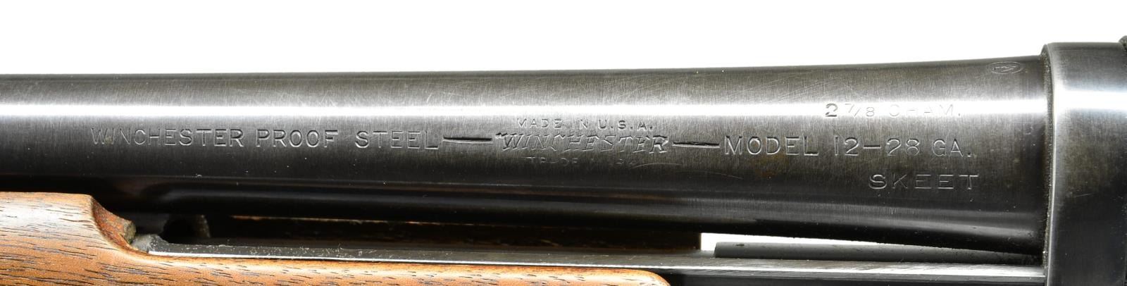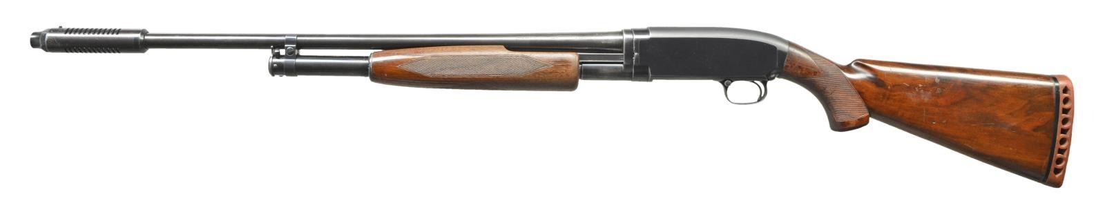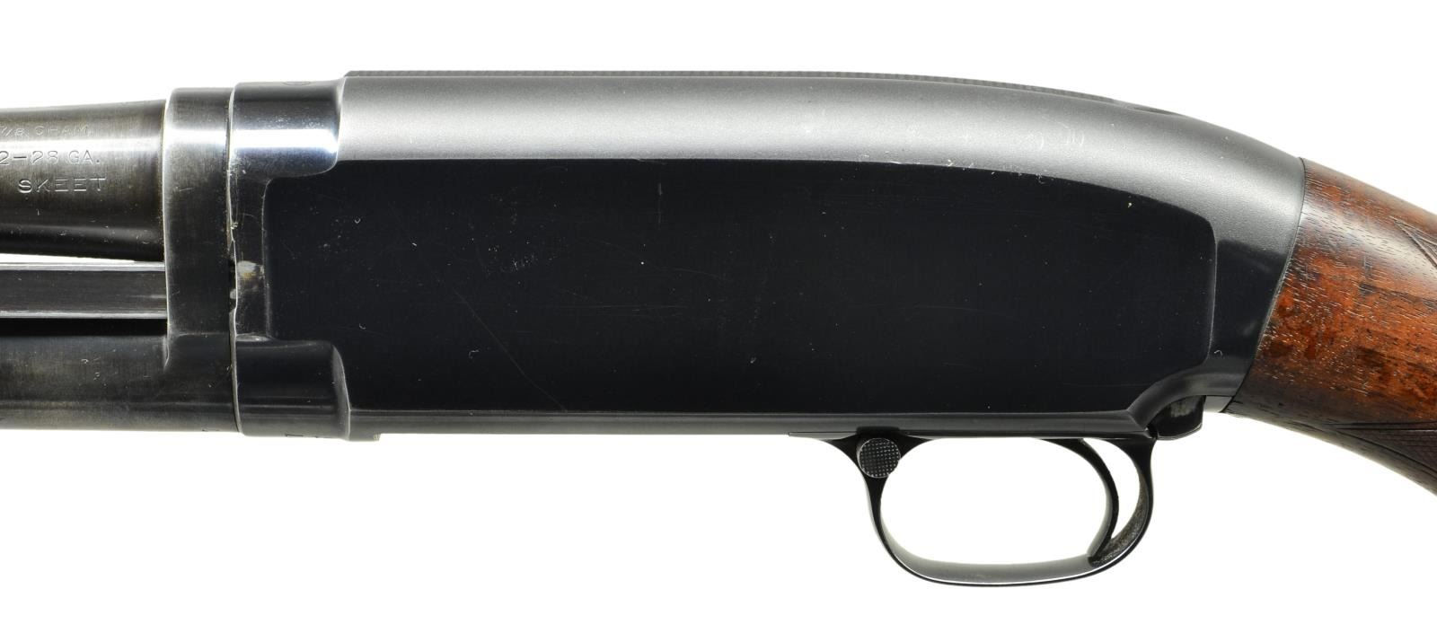 Cal. 28 Ga. 2-7/8". S# 842607. Bbl. plain, 26" over an after market Cutts compensator w/ spreader tube. Original choke marking is skeet. Receiver below S# is marked "SKEET". Original beavertail forearm & hard rubber capped pistol grip stock of checkered walnut. LOP.: altered to 14" over an after market Red Head pad. Mfg. 1940. CONDITION: 80% lightly faded blue showing slide & carry wear. Original wood finish shows areas of wear & finish loss w/ scattered scratches & marks. Sound action. Good bright bore. (21-2419/DS). CURIO. $2,250-3,000.