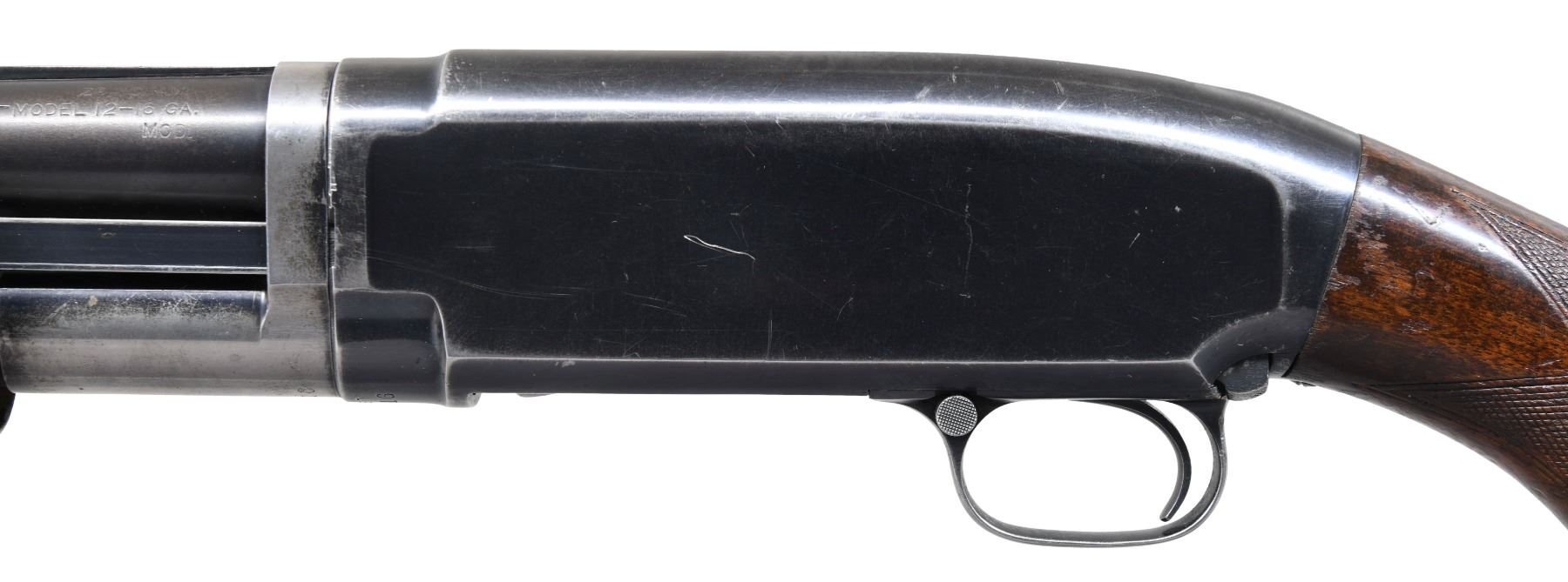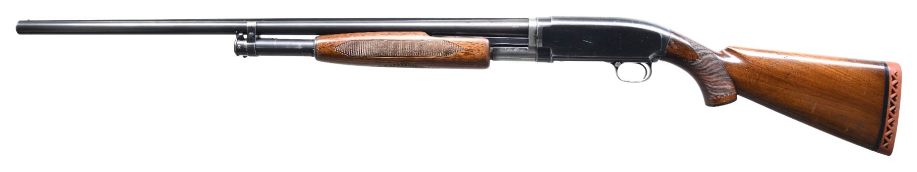 Cal. 16 ga. 2 3/4". S# 698516. Bbl. 28" of Winchester proof steel w/ solid rib & steel bead. Fixed Mod choke. Receiver above serial number is marked "SKEET". Beavertail forearm & hard rubber capped pistol grip stock w/ target style factory checkering. LOP: shortened to 13 1/2" over an aftermarket Hawkins pad. Mfg. 1936. CONDITION: 80% original blue showing slide & carry wear w/ scratches. Receiver extension is flaking to gray. Original wood finish shows wear w/ dents, scratches & marks. Good mechanics. Very good bore. PROVENANCE: The estate collection of Don "Duck" Combs. (24-2531/DS). CURIO. $800-1,200.