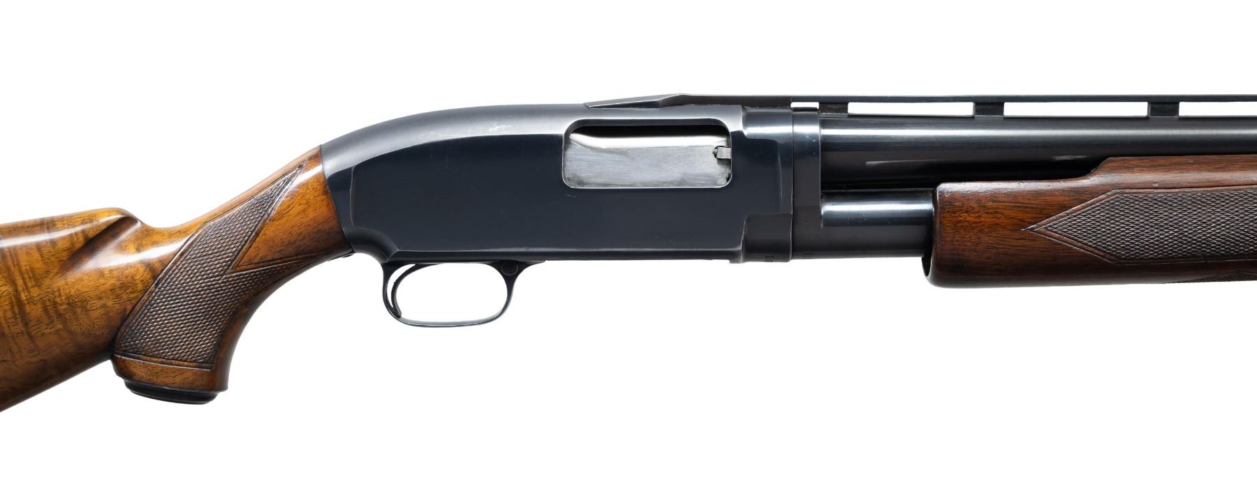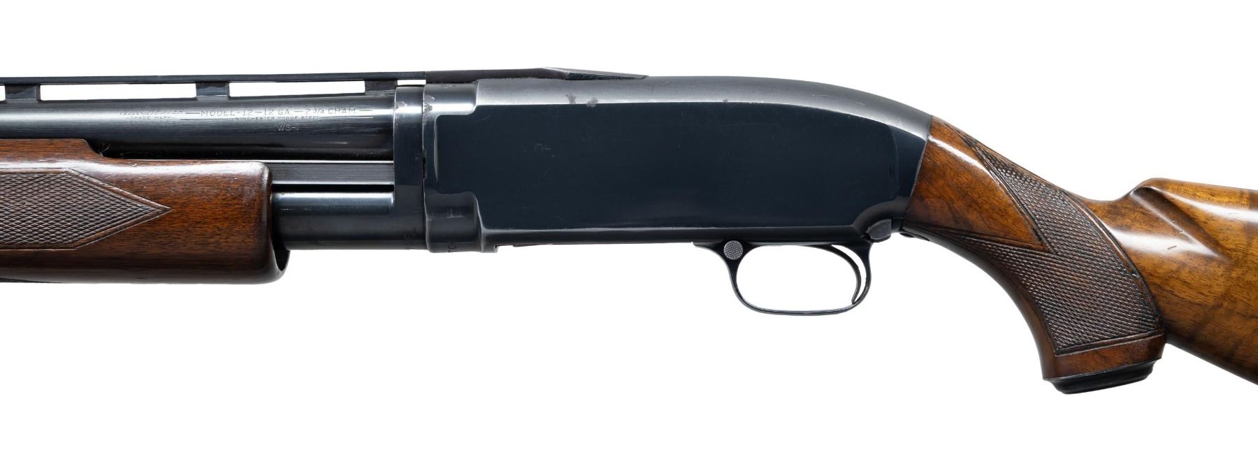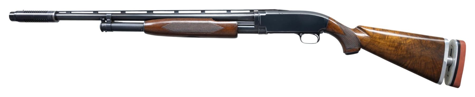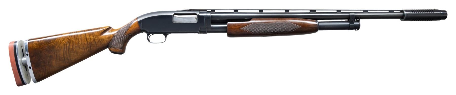Cal. 12 GA, 2 3/4". S# 1927706. Bbl. 26" over ventilated Cutts compensator with spreader tube. New Style Winchester factory vent rib. Steel front bid, mid bead is missing. Blue finish. Checkered beavertail target forearm and steel capped pistol grip stock of fancy fiddle grained walnut. LOP: altered to 14 7/8" over an aluminum adj. buttplate fitted with a solid red Winchester pad. Mfg. in 1963. CONDITION: 80% original blue showing slide and carry wear with small spots of corrosion on the receiver. Stock and forearm have lightly worn original finish and checkering showing scattered handling marks. Sound mechanics. Bore is generally bright with some plastic fouling forward of the chamber. (25-4443/DS). CURIO. $800-1,100.