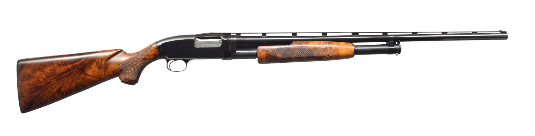 SHOTGUN. Cal. 20 Ga., 2 3/4". S# 1935074. Bbl. 26" w/ new style 3 pin VR having duck bill extension. Fixed WS-1 choke. White target front sight w/ white mid bead. Beavertail forearm & steel capped pistol grip stock of very fancy black walnut have Pigeon grade checkering w/ 3 diamonds on bottom of forearm. LOP: 14" over original buttplate. UNATTACHED ACCESSORIES: hand written letter from George Madis author of "The Winchester Book" giving his assessment of the gun & the condition it was in at the time. CONDITION: metal retains over 90% original blue. Stock & forearm are sanded & have semi gloss refinish. Very good bright bore. (19-4335/DS). CURIO. $2,000-4,000.