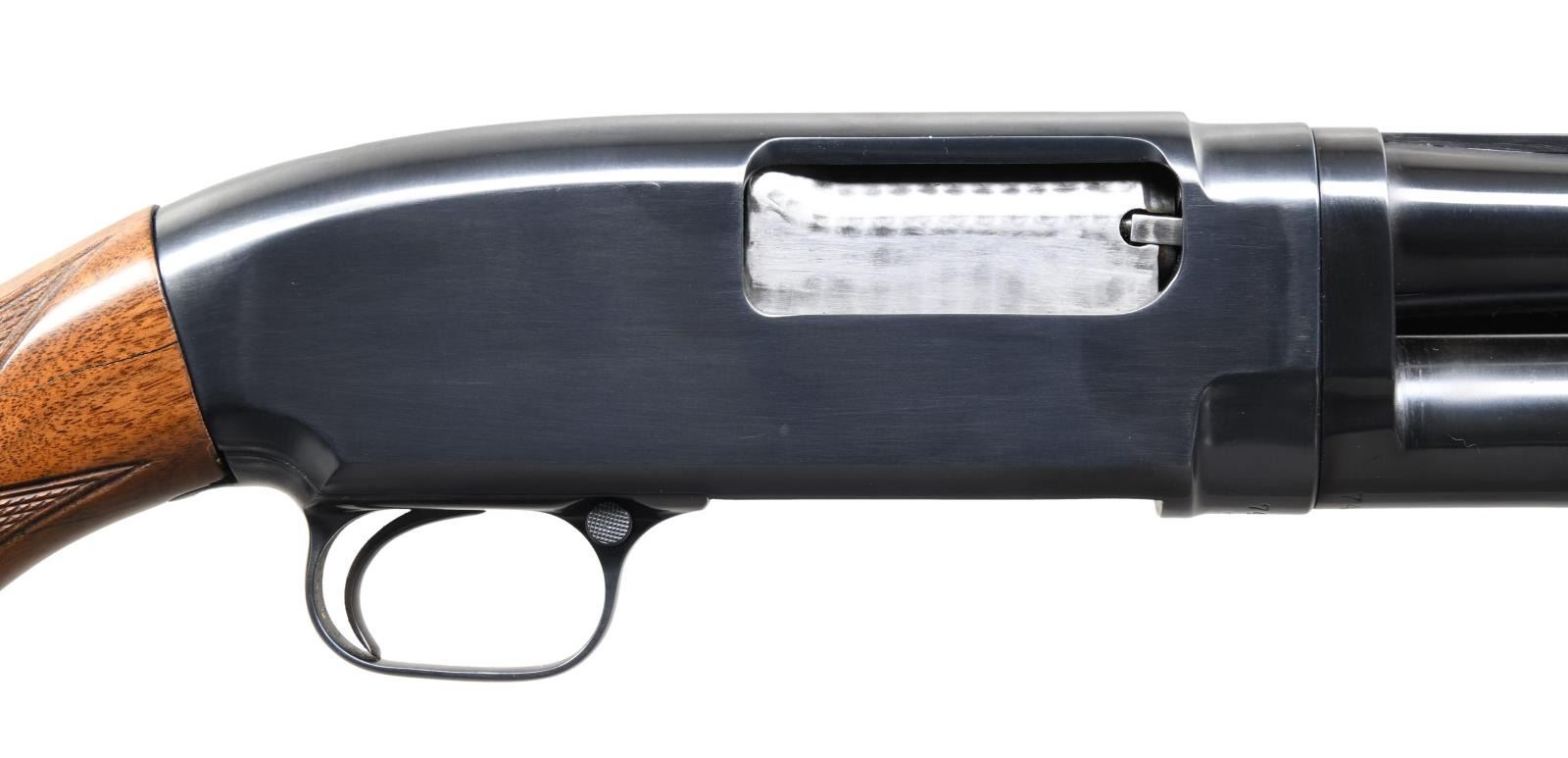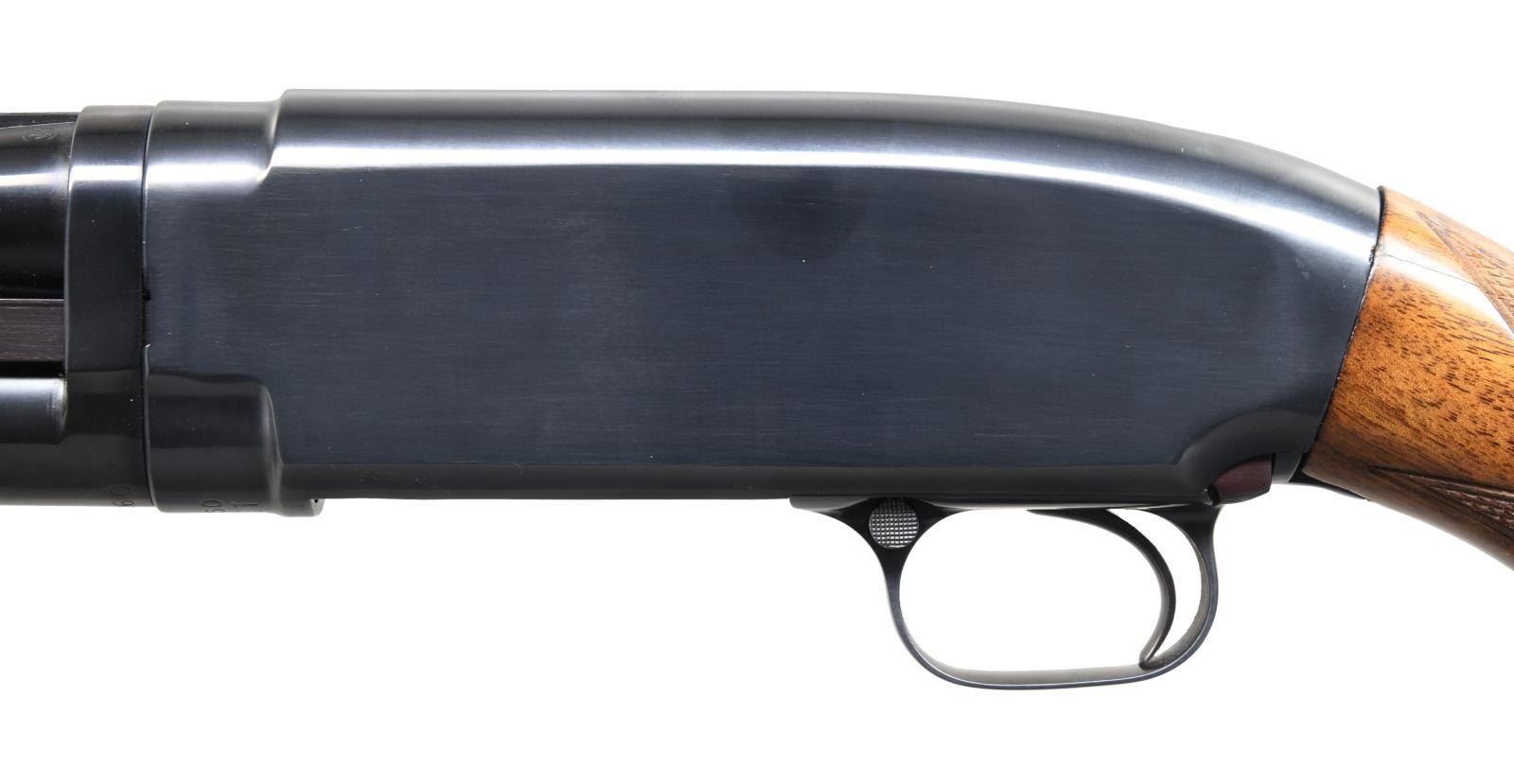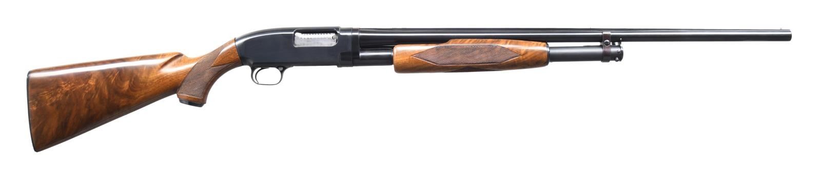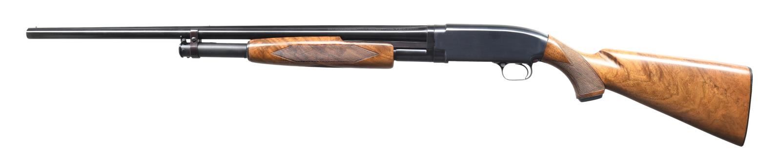 Cal. 28 ga. 2 7/8". S# 748260. 28 ga. conversion shotgun. Bbl. 26" w/ solid rib, steel front & mid beads. Hand stamped skeet choke marking. Receiver has added skeet marking below S#. Receiver is stamped "28" at rear. Correct 28 ga. mag. tube. Shell stop is stamped "28". 20 ga. marked mag. band. Carrier has added shell guide & hand jeweling. Breech lock has added jeweling w/ unusual copper finish on other sides. Replacement beavertail forearm & skeet dimension stock of fancy walnut have target pattern checkering, steel grip cap w/ red "W" & late style buttplate. CONDITION: 98% reblued finish. Stock & forearm are refinished w/ freshened checkering. Stock has small cracks extending from receiver. Takedown is stiff. Very good bore. (23-7381/DS). CURIO. $2,000-3,000.