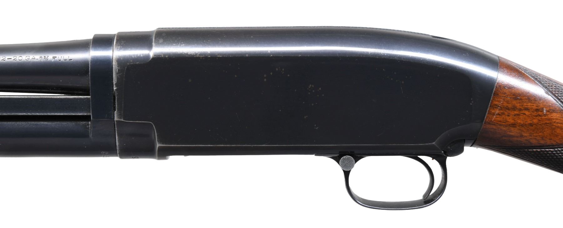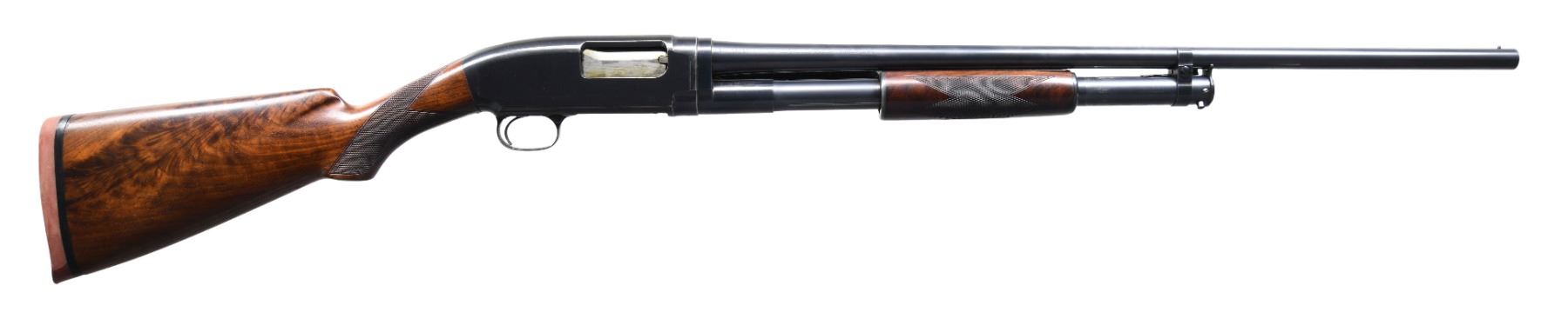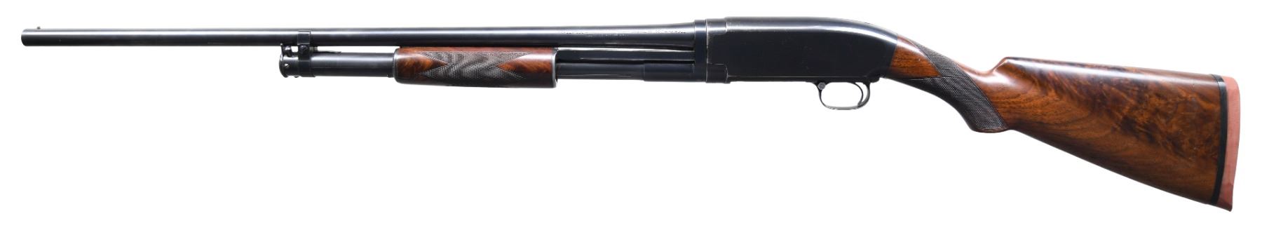Cal. 20 ga. 2 3/4". S# 473526. Bbl. 26" plain of Nickel Steel w/ steel front bead. Fixed full choke. Small round grooved forearm w/ trap style hand checkering. Early style uncapped pistol grip stock of fancy walnut w/ tournament style hand checkering. LOP: altered to 14 1/8" over a poorly fit reproduction Winchester solid red pad. Mfg. 1927. CONDITION: over 90% lightly worn original blue showing slide & edge wear w/ spotting on receiver. Stock & forearm have good refinish & checkering showing a few small marks. Sound action. Very good bright bore. PROVENANCE: The estate collection of Don "Duck" Combs. (24-2528/DS). CURIO. $800-1,200.
