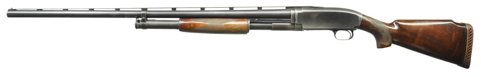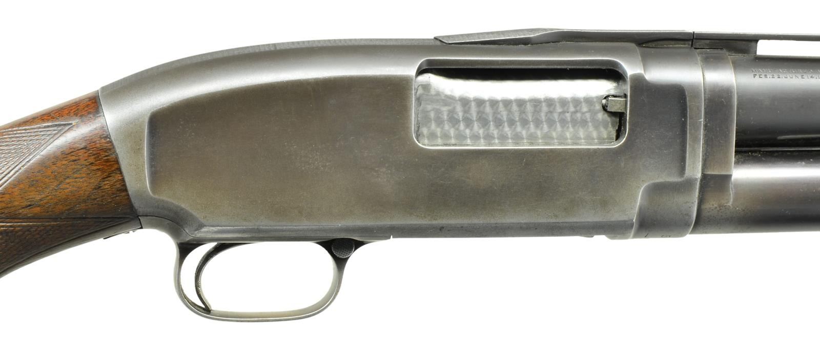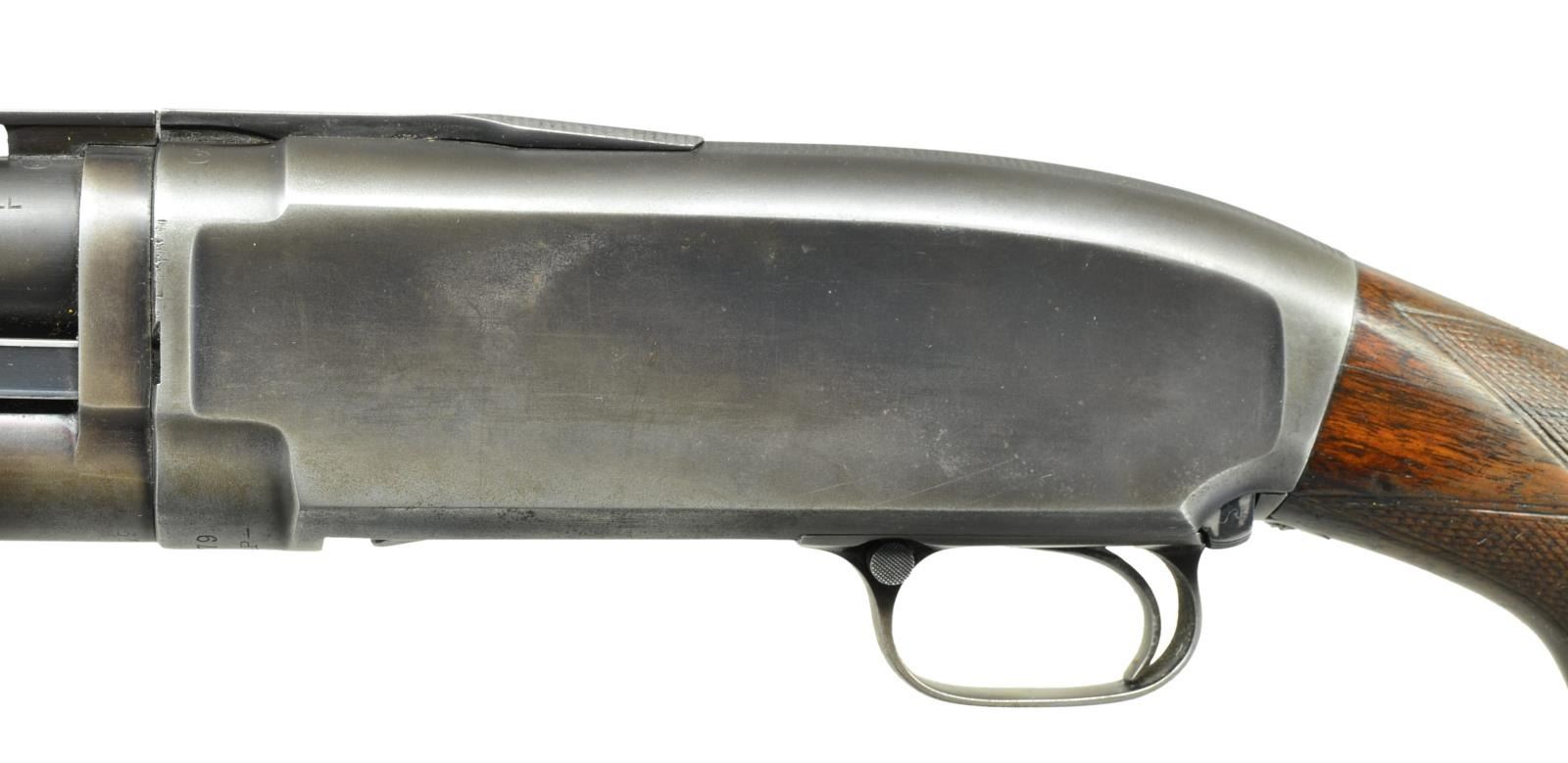 Cal. 12 Ga. S# 552879. Bbl. 30" Nickel Steel w/ factory milled VR & duckbill extension. Fixed full choke. White target front sight w/ steel mid bead. Receiver below S# marked "TRAP". Bolt has custom jeweling. Semi Beavertail aftermarket forearm w/ wrap around checkering. Aftermarket Monte Carlo pistol grip stock w/ fluted plastic grip cap & hand checkering. LOP is 13 5/8" over a poorly fit Pachmayr pad. Mfg. 1928. CONDITION: 70% lightly worn blue showing slide & carry wear. Wood has worn finish & checkering, showing dents & marks. Sound action. Bore shows some fouling. (21-2260/DS). CURIO. $400-600.
