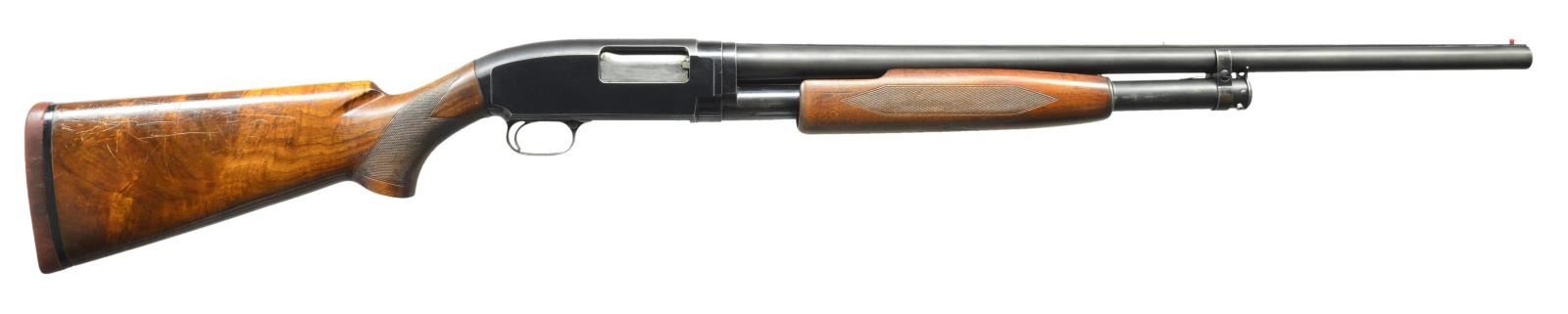 Cal. 12 Ga., 2 3/4". S# 822403. Bbl. shortened to 26 3/8" w/ solid rib. Cyl. bore, original choke marking "FULL". Red target front sight w/ steel mid bead. Receiver extension is marked "MODEL-12-TRAP". Beavertail forearm & uncapped straight comb trap dimension stock of checkered fancy walnut. LOP: 14 1/4" over original solid red Win. pad. 1940 Mfg. CONDITION: 80% lightly faded blue showing carry wear w/ handling marks & takedown scratches. Wood has worn finish & checkering showing scratches & marks. Stock is chipped around action. Very good bore. (21-2019/DS). MODERN. $400-550.