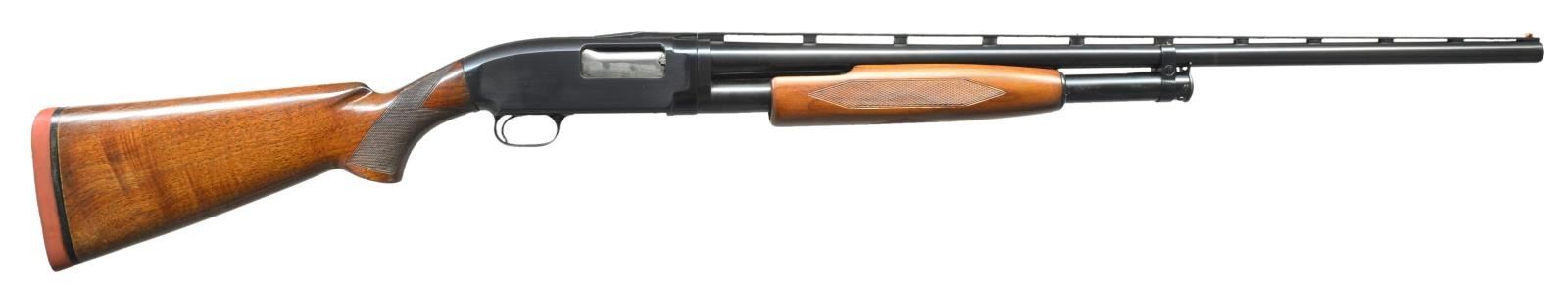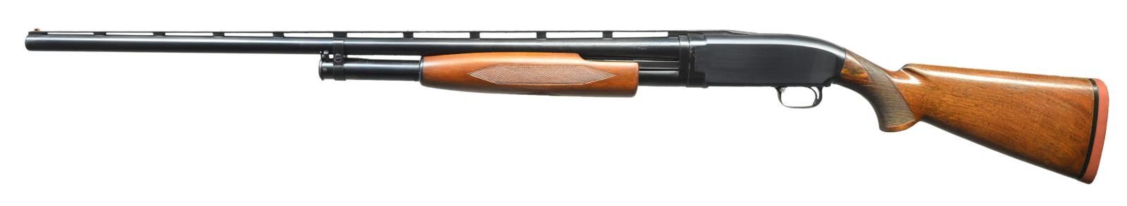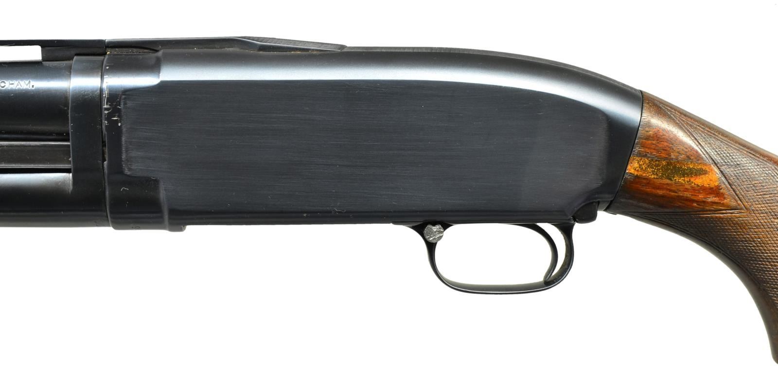 Cal. 12 Ga., 2 3/4". S# 951776. Bbl. 30" of proof steel w/ factory milled VR. Choke is opened to Imp-Mod, original choke marking "FULL". Orange target front sight w/ brass mid bead. Receiver extension is marked "MODEL-12-TRAP". Post War factory beavertail walnut forearm w/ checkering. Uncapped pistol grip Trap dimension target walnut stock. LOP: 14 1/2" over solid red Win. pad. 1942 Mfg. CONDITION: over 98% reblued finish showing takedown marks on left side. Forearm has good refinish w/ recut checkering. Stock has lightly worn finish & checkering w/ hairline crack extending from right side of receiver & plastic wood repair on left side. Stock bolt is missing. Headspace ring is taken up by 3 notches. Very good bright bore. (21-2127/DS). CURIO. $450-700.