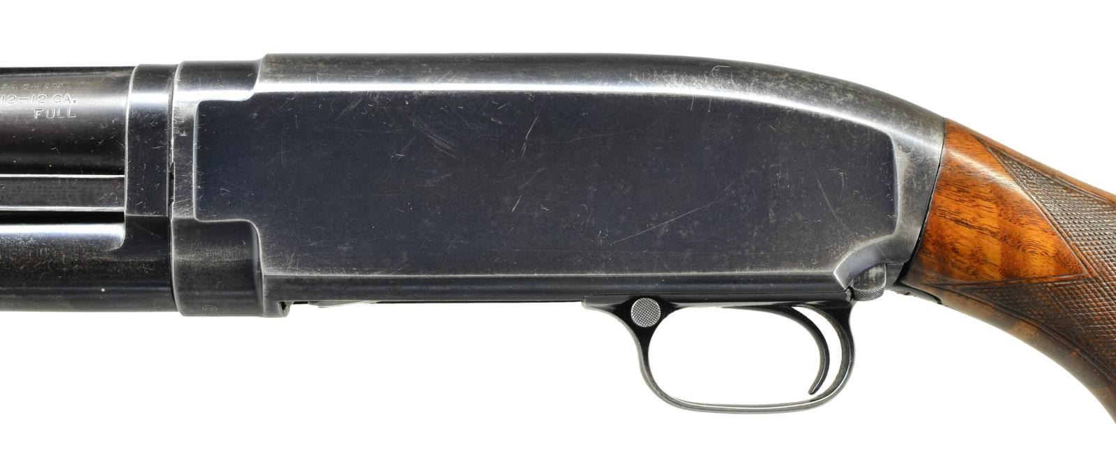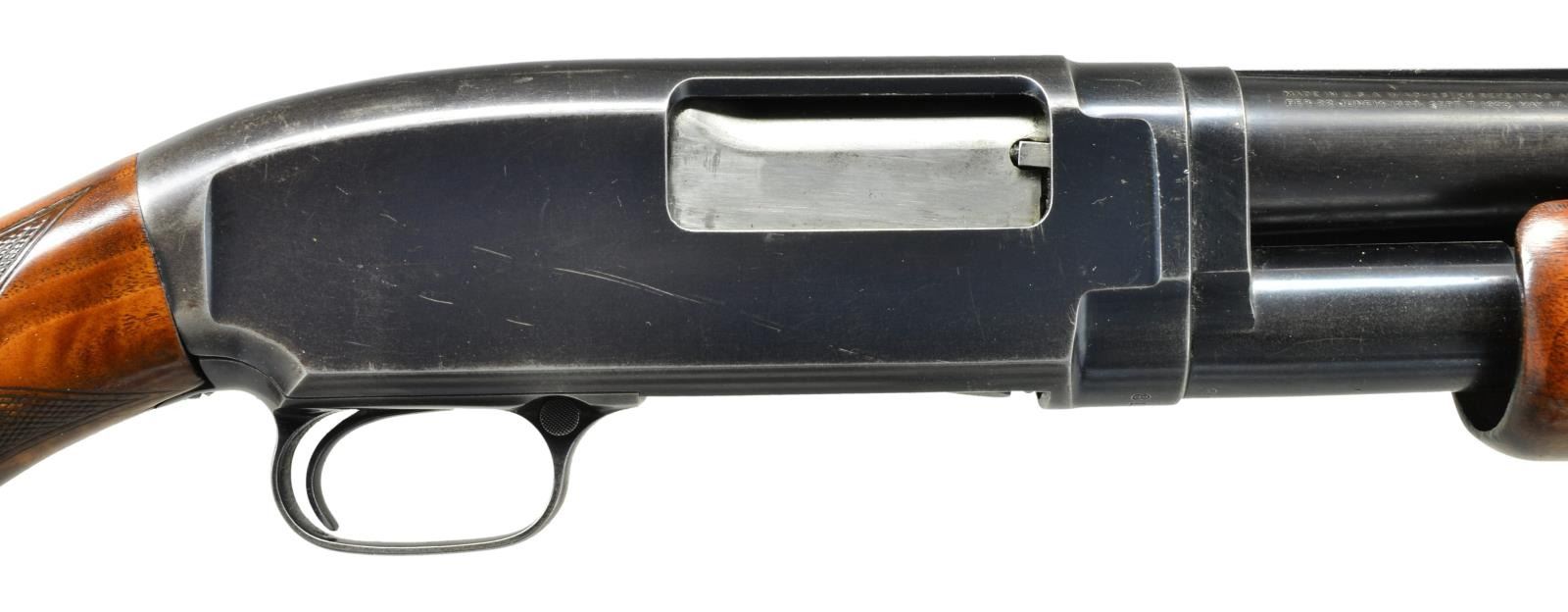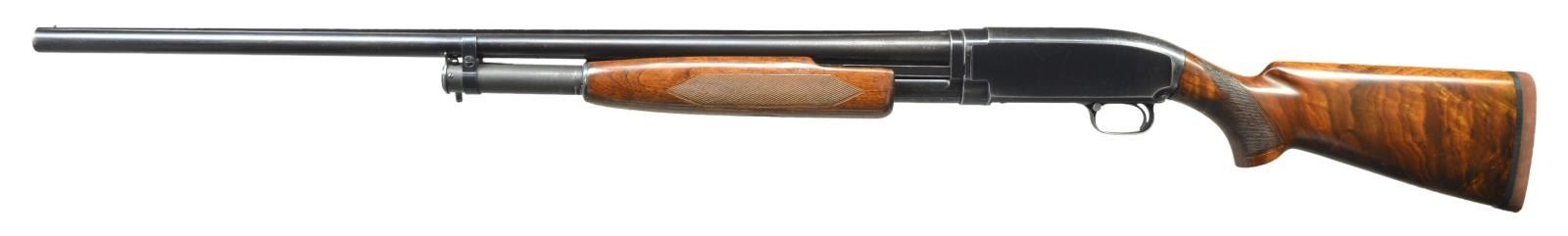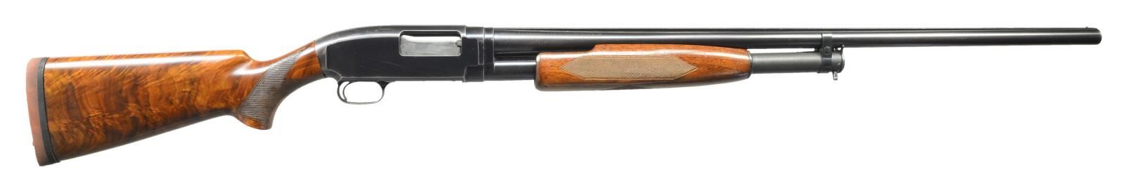 Cal. 12 Ga., 2 3/4". S# 812809. Bbl. 30" of proof steel w/ solid rib, fixed Full choke & steel mid bead. Beavertail forearm & uncapped pistol grip trap dimension stock of fancy walnut w/ factory checkering. Stock is shortened to LOP: 13 5/8" over aftermarket solid red Win. pad. 1939 Mfg. CONDITION: over 80% lightly faded blue showing slide & carry wear. Forearm has moderately worn finish & checkering showing scratches & marks. Sanded & refinished stock has partially filled checkering. Bbl. has bright bore w/ lengthened forcing cone. (21-2098/DS). CURIO. $350-500.