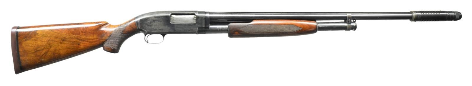 Cal. 12 Ga., 2 3/4". S# 707576. Bbl. 29 1/2" over aftermarket adj. Cutt's Compensator. Proof steel bbl. has factory solid rib w/ steel front & mid beads. Factory choke marking "FULL". Factory beavertail forearm & straight comb trap dimension fancy walnut stock w/ hard rubber grip cap & factory checkering. LOP: 14 1/8" over original Win. solid red pad. 1936 Mfg. CONDITION: 60% dull blue showing evidence of cold blue touch up. Trigger guard bow is polished bright. Wood has heavily worn finish w/ spots of oil darkening showing scratches & handling marks. Good bright bore. (21-2318/DS) CURIO. $350-550.