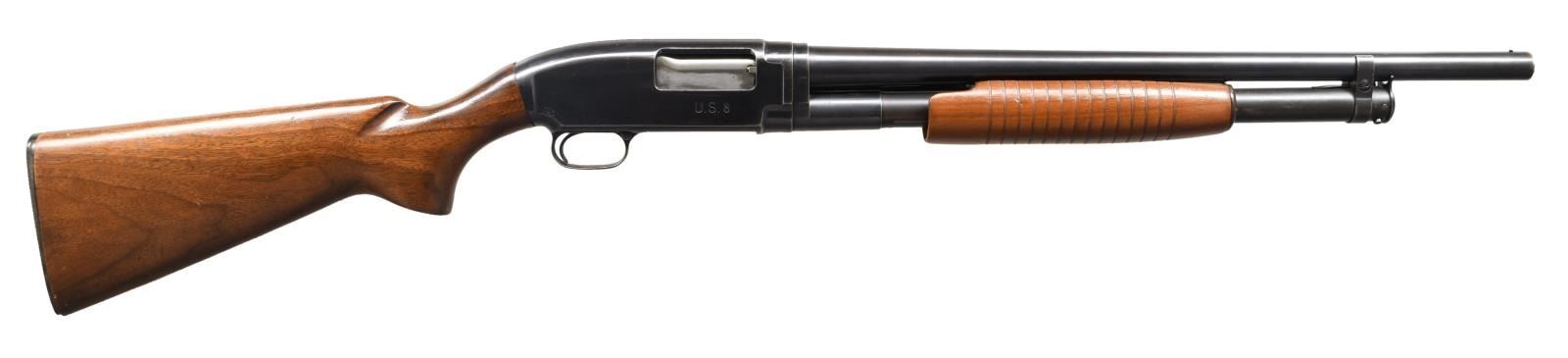Cal. 12 Ga. S# 959873. Bbl. 20 3/4" w/ "CYL" marked fixed choke & 2 3/4" chamber. Mfg. in 1942, S#'s on the frame & bbl. assembly match & bbl. is dated "42". Right side frame "U.S. (FLAMING BOMB)" & breech end bbl. top (FLAMING BOMB). Forend has 14 grooves & smooth pistol grip buttstock is NOT marked. Shotgun features a fixed front bead & commercial blued finish. CONDITION: metal surfaces retain about 80% finish, scattered dings, scratches & light spots of pitting. Stock set has an added coat of varnish w/ dings, heaviest on the stock & small crack at butt left side. Buttplate is undersized & fits poorly. (23-2251/CW). CURIO. $600-900.