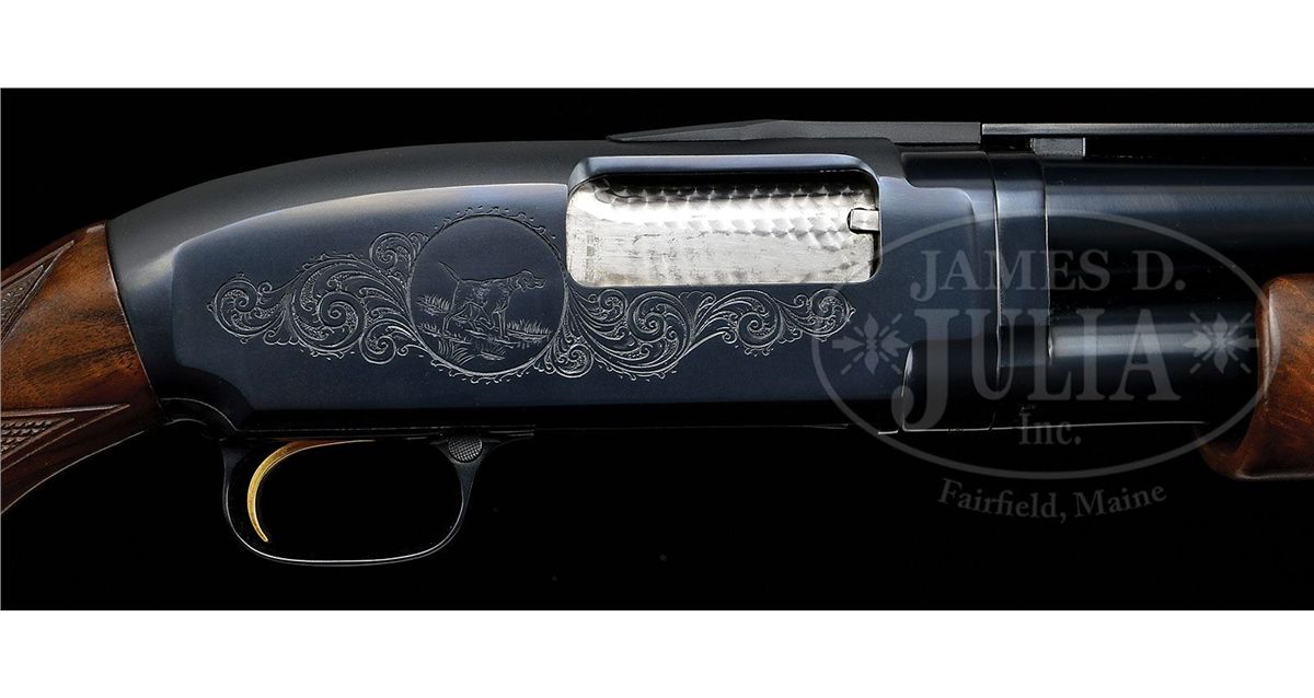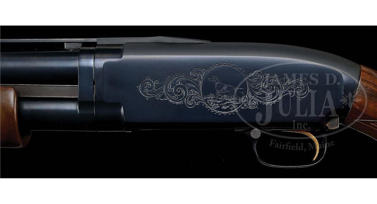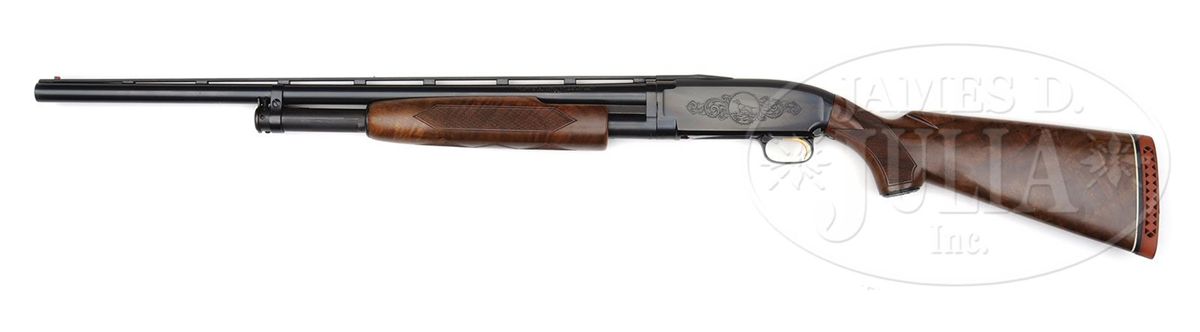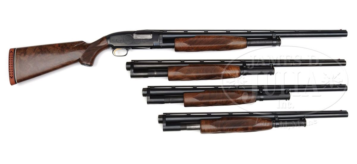 SN 1370044. Cal. 12 ga. 2-3/4" Chambers. 26" bbls choked skeet, 26" choked improved cylinder, 28", choked modified, and 30" bbls, choked full. All are fitted with raised ventilated ribs having rectangular posts, with two beads, silver mids and Bradley red fronts. Typical standard type action with gold-plated trigger, and engine turned bolt and follower, is engraved in Model 12-1C style with large, shaded scroll flanking circular vignettes of pointing pointers on left and right sides of action. XXX flame figured American walnut steel capped pistol grip buttstock measures 14-1/4" over open sided, red Winchester pad over 1/16" white line spacer. Point pattern checkering with heavy beaded border is at grip. Steel cap is embossed "WINCHESTER REPEATING ARMS". Each bbl set has its own matching checkered extended beavertail forend. Drop at heel: 2-9/16", drop at comb: 1-1/2". Weight with IC bbl set: 8 lbs. 3 oz. LOP: 14-1/4". Accompanied by red, white, and blue Winchester marked boxes; one marked "Gun and Mod", another marked "Imp Cylinder", and the last marked "Skeet and Full", all in brown corrugated cardboard shipping box with UPS labels. PROVENANCE: Email from consignor with history of this gun as he knows it, stating "I was told the gun originally belonged to Spencer Olin" and "I purchased the gun in 1978, it was in the carton used to ship it from the factory when it was redone. The gun has remained unfired since it was restored." CONDITION: Excellent, originally made in 1954 as a three bbl set, gun was returned to Winchester for 4th bbl. In the early 1970's the gun was returned to the factory and completely redone to include new forends and stocks. It currently retains all of these factory finishes, with only some marks and rubs on magazine tubes from contact with tube retainers and forends during assembly and disassembly. Bores are excellent. Action is crisp. Boxes are excellent, outer shipping box shows some wear. 4-48707 MGM187