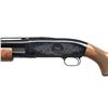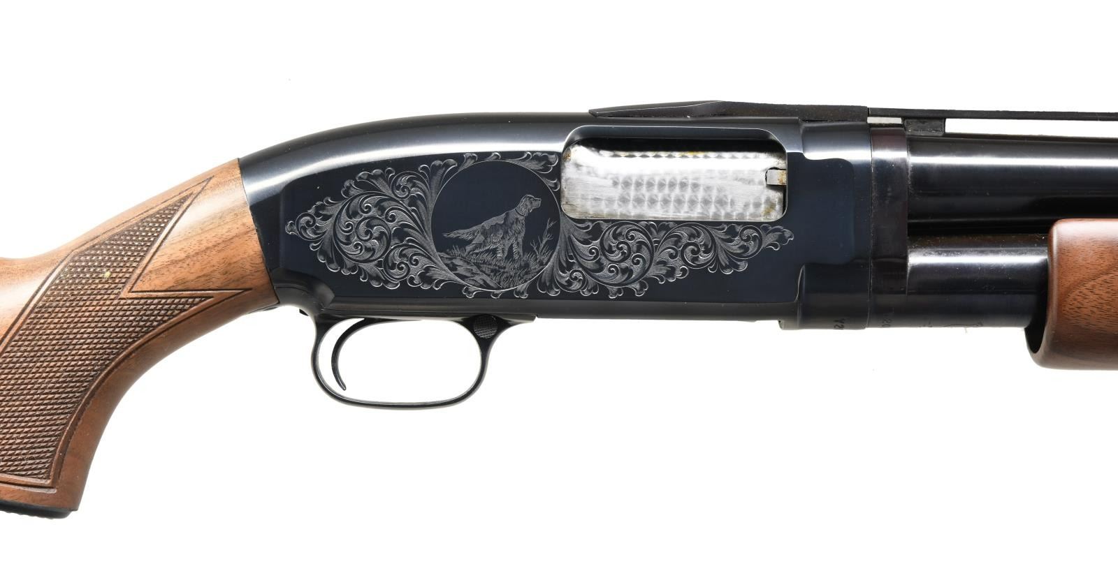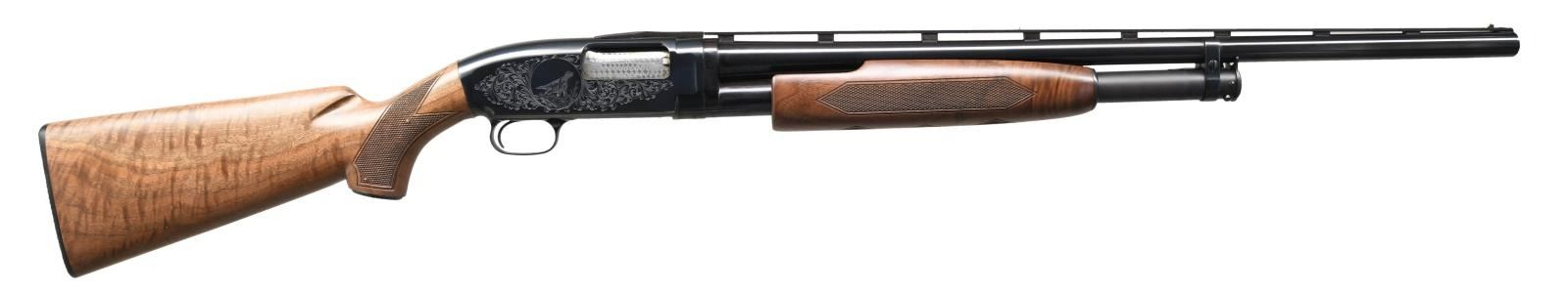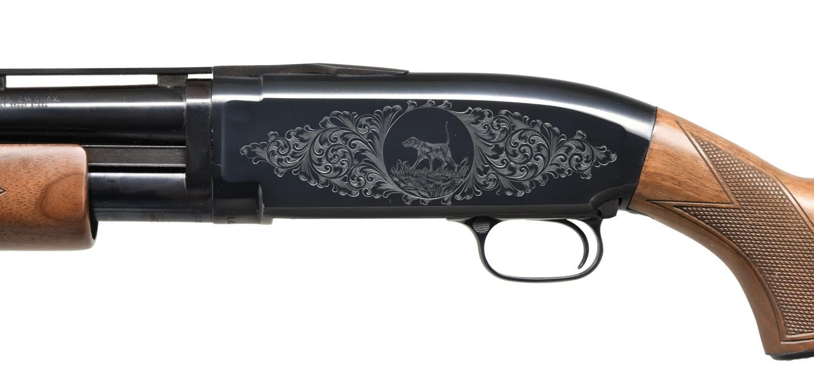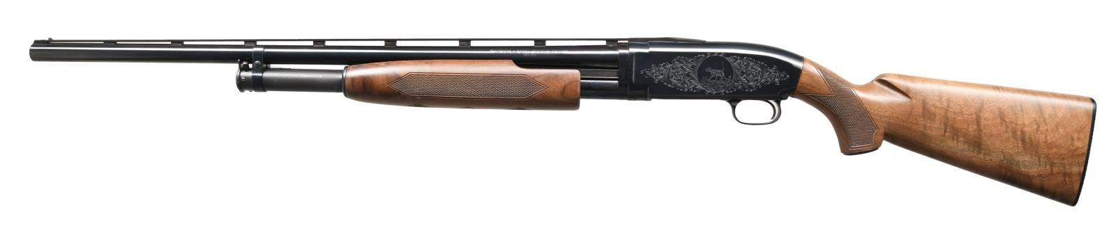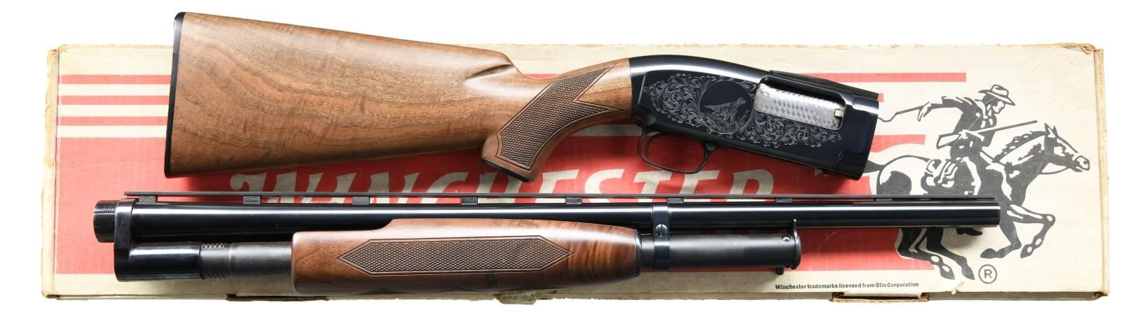 PIGEON GRADE PUMP SHOTGUN. Cal. 12 ga. 2 3/4". S# Y2027276. In 1985 a limited issue of 480 model 12 Pigeon Grade shotguns were assembled in the custom shop. By 1985 Winchester no longer had in house engravers & the receivers were sent to Bottega Giovenelli of Italy for engraving. Grades 1-5 were offered w/ gold inlays as an option. Pigeons on the receiver extensions were engraved under contract by Pauline Muerrle. This special shotgun has 12-1B engraving. Right side vignette features a pointing setter. Left side shows a pointer. Scenes are surrounded by vine type foliate scroll. Jeweled bolt & carrier. Bbl. 26" vent rib. Fixed IMP-Cyl. choke. White target front sight w/ steel mid bead. Beavertail forearm & capped pistol grip stock of satin finished fancy walnut w/ cut checkering. LOP: 13 3/4" over original buttplate. UNATTACHED ACCESSORIES: original box containing warranty & service center papers. Also includes a congratulations letter dated June 27, 1985. Letter certifies that this is one of the last of the Y series shotguns produced in the custom shop. CONDITION: near new retaining 98% blue showing slight wear on the mag. tube w/ slight wear on the jeweled breechblock. Very good wood finish. Bright near excellent bore. (23-4888/DS). CURIO. $2500-3500.