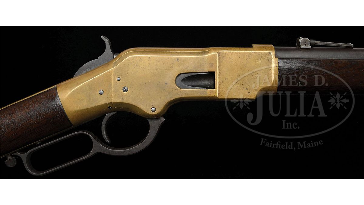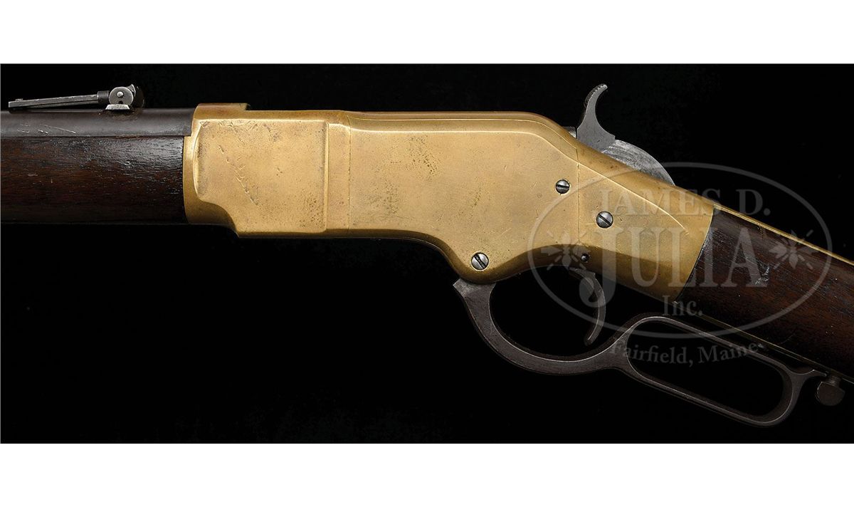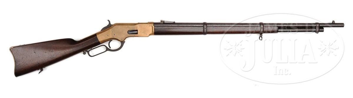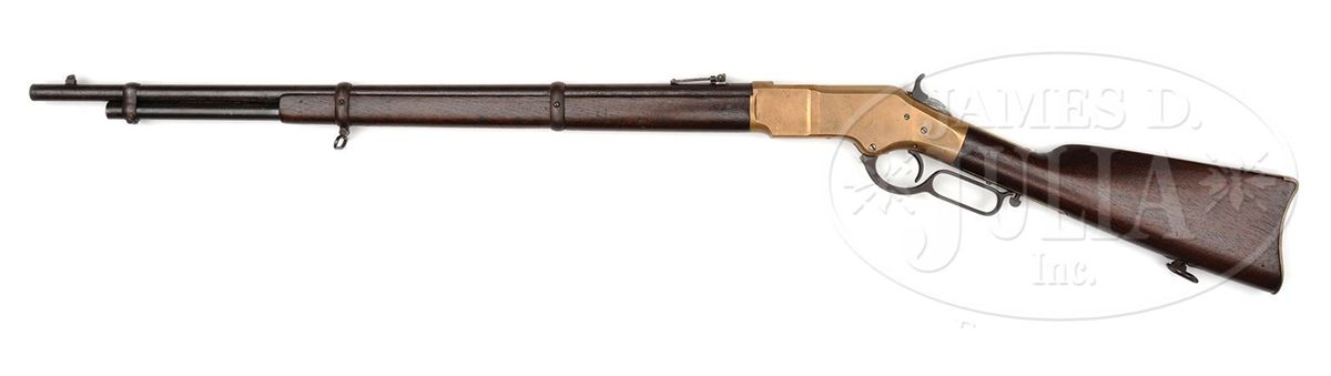 SN 32647. Cal. 44 RF Henry. Standard musket with 27" rd bbl, full magazine & square base front sight/bayonet lug with 900 yd Henry style ladder rear sight. Mounted with uncheckered straight grain American walnut with 3/4" length forearm and straight stock with brass carbine/musket buttplate with trap. Rifle has 3 bands with a sling wire on the middle band. Bottom of the stock has a corresponding factory sling swivel. Winchester had hoped to get large military contracts for the '66 musket & although the government did buy a few the large contracts never materialized. Muskets remained in production right through the end of this model with most being sold for Guard & Security forces. Turkey did buy a few of them to arm their military but never followed through with a large contract. CONDITION: Fine. Bbl, magazine tube & steel parts retain a dark, even plummy brown patina with traces of orig blue in sheltered areas. Receiver & buttplate retain good edges with a few light nicks & scratches and a series of small dings on the front side flats. Receiver & buttplate at one time were polished & are now beginning to acquire a light patina. Wood is sound with a few light nicks & dings and retains about all of a recent refinish. Mechanics are fine. Strong, sharp bore with moderate pitting. 4-47642 JR141