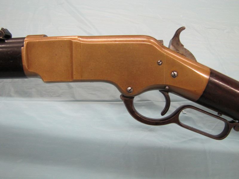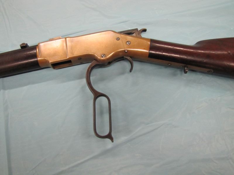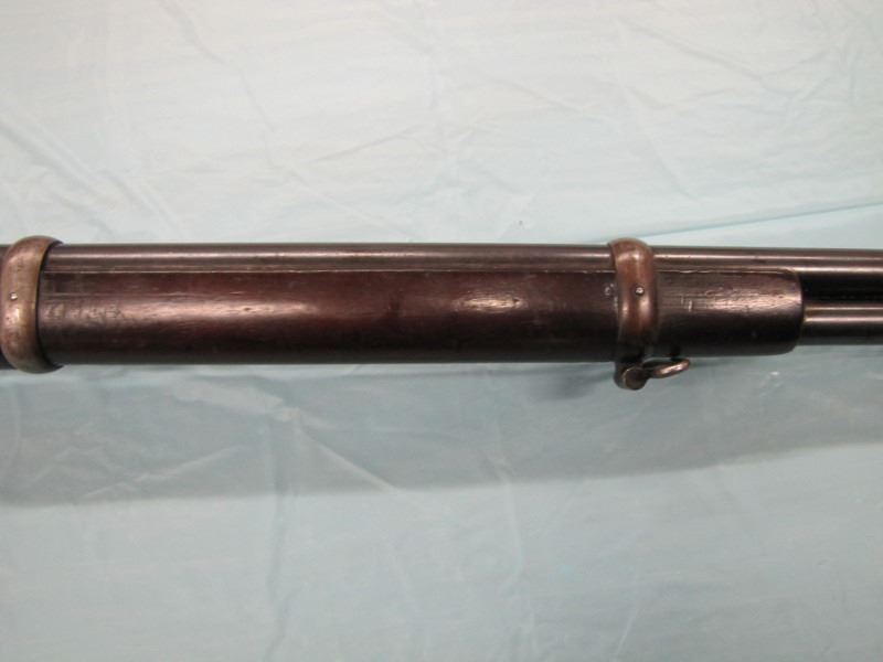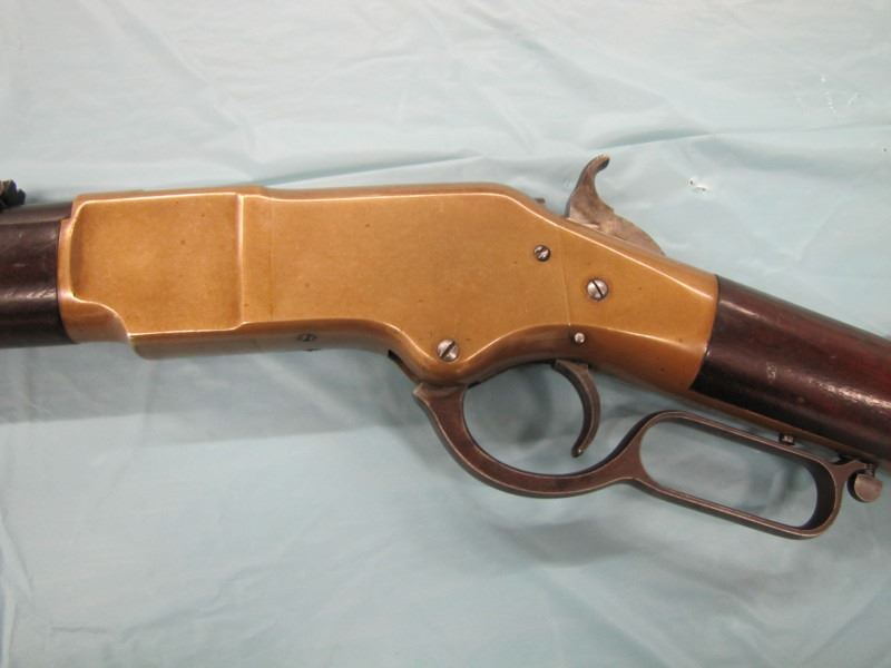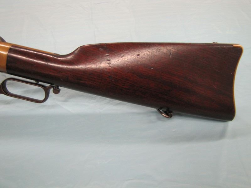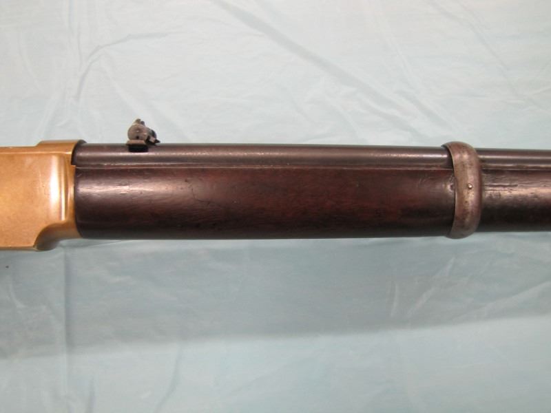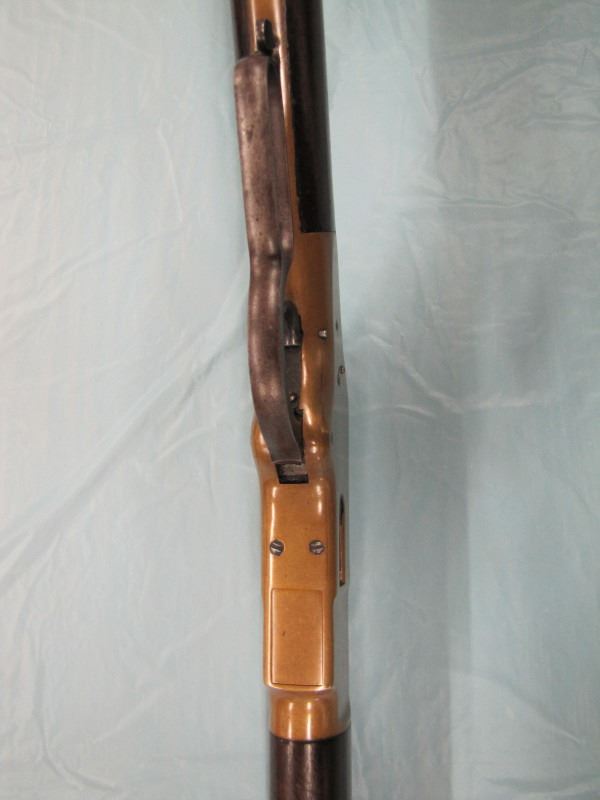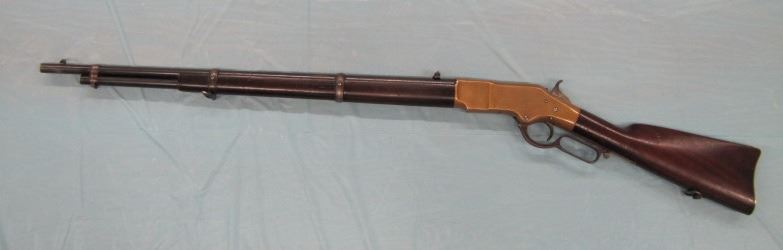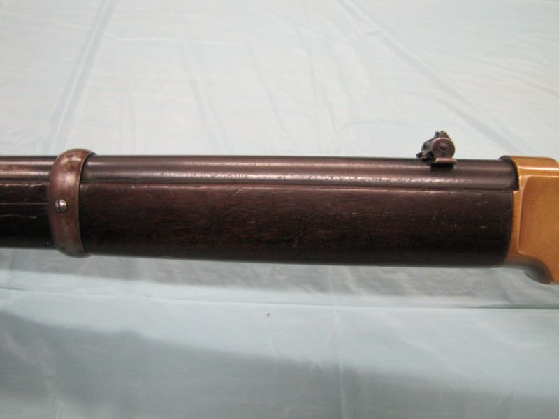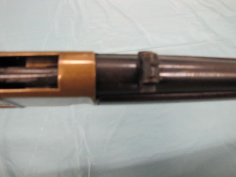 WINCHESTER MODEL 1866 MUSKET. .44 Caliber Rim fire. In 1866, New Haven Arms Company changed its name to Winchester Repeating Arms Company. The first firearm to be produced under the Winchester name was the Model 1866. Made in 1870 ( Serial # below 35XXX ). This antique firearm is still in beautiful condition. Its brass receiver and butt plate are in new condition. A lot of the original blue still remains on the barrel, mag and loading gate. It has bright rifling - almost never seen on guns of this age. A few screw slots are somewhat burred, proving only that it was punctually cleaned after firing ( the old ammo ruined rifling if briefly neglected.) Fore end and butt stock show only minor bruises, with almost all original varnish intact. According to The Blue Book of Gun Vales, this firearm is appraised at above $35,000 U.S. dollars because it is not in " above average " condition, but in " far above average " condition. This firearm can enter the USA without hindrance because U.S. Customs has assigned it genuine antique status.