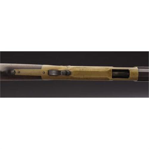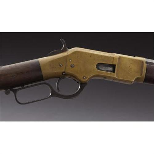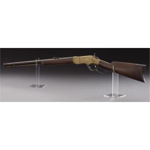 <B>WINCHESTER MODEL 1866 RIFLE</B></I> - Serial number 156423, circa 1882. 24” octagon barrel in .44 rimfire calibre. All features as standard for this model including iron butt plate and forend cap. Legible barrel address with functioning action. Appropriate 1873 style rear sight. Walnut wood stocks.<BR><BR><B>Condition:</B></I> Brass frame has a mellow untouched patina with the exception of the left side plate. During the rifle's period of use someone lightly sanded the left side plate. The light sanding marks are visible under the patina the rifle acquired since the sanding. Barrel has been lightly cleaned and toned down with a chemical. The barrel doesn't appear to have been pitted prior to cleaning. Barrel finish blends nicely with the brown patina on the magazine tube. Lever, trigger, hammer and butt plate all have pleasing dark patina. Walnut wood stock and forend are very good showing normal wear. A very pleasing looking '66 rifle.<BR><BR><b>Shipping:</b> Bats, Clubs, Sticks, Swords, Rif (<a target="_blank" href="http://www.heritageauctions.com/common/shipping.php">view shipping information</a>)