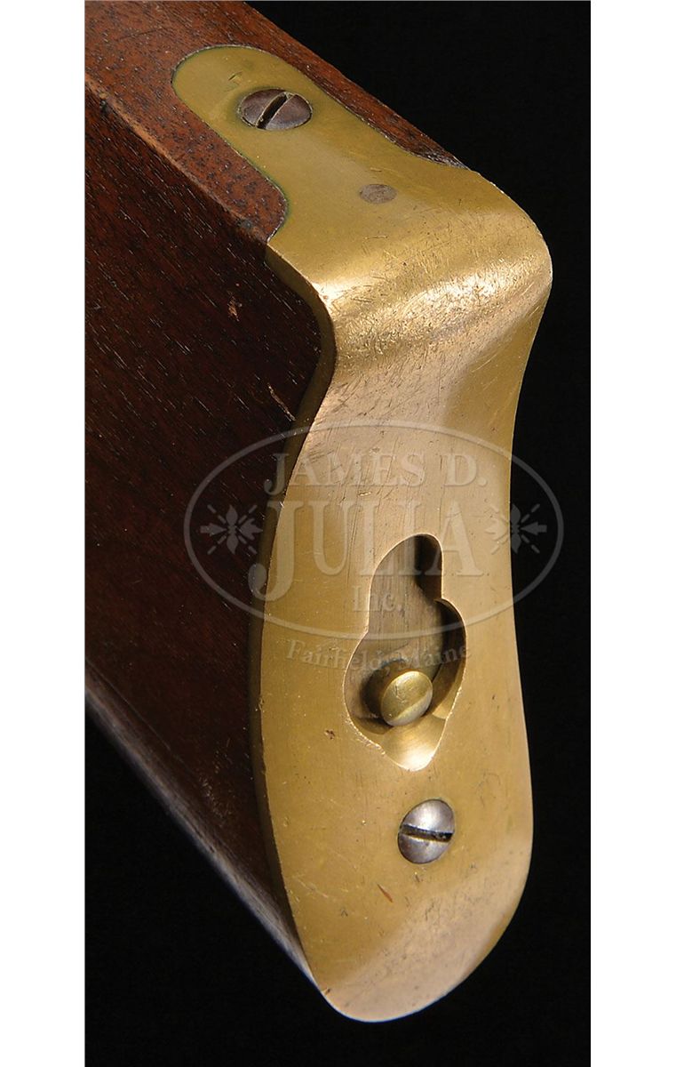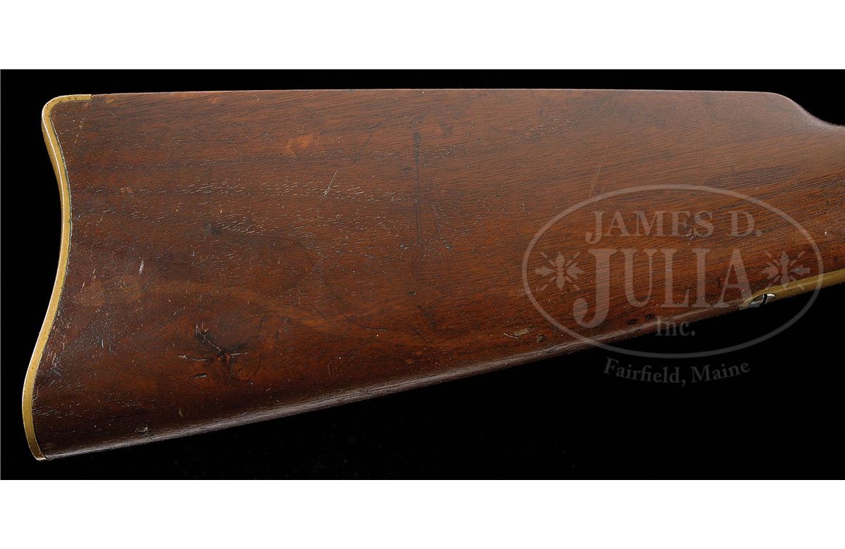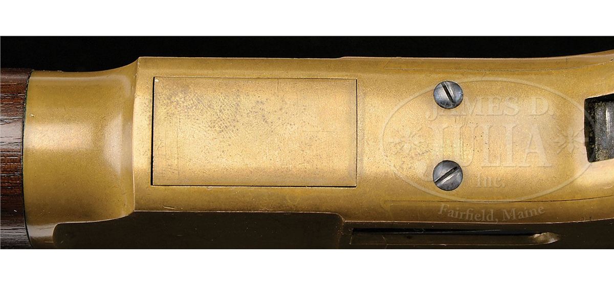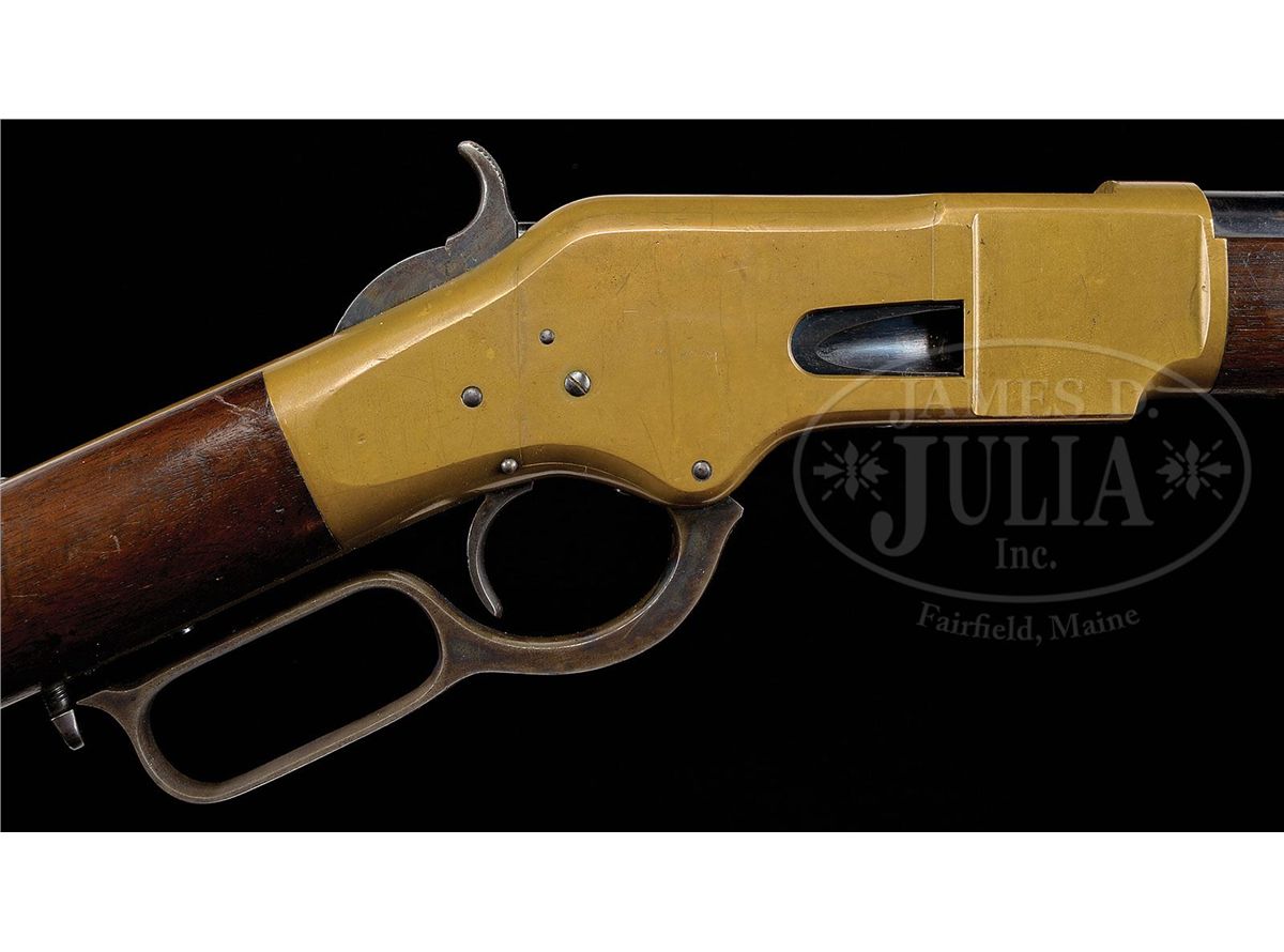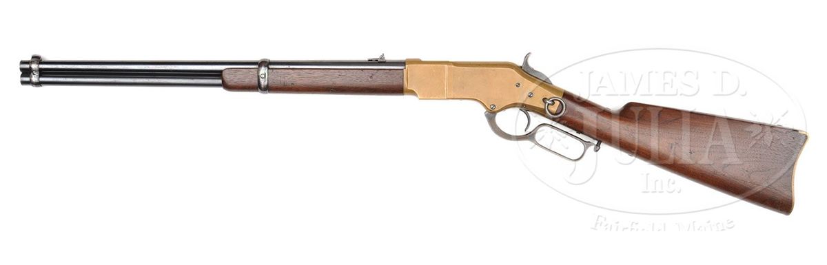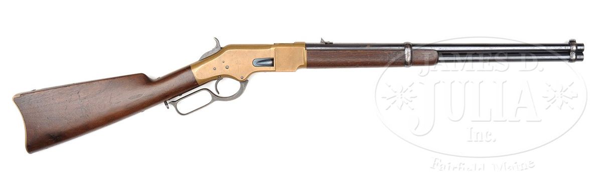 SN 128296. Cal. 44 RF Henry. Standard grade carbine with 20" rnd bbl, full magazine, integral front band/front sight & 2 position flip rear sight. Left side of receiver has a staple and ring. Bbl marking is Winchester & Kings patent in 2 lines. Mounted with nicely figured, slab sawed, uncheckered, American walnut with straight stock and brass buttplate with trap, containing an orig 3-pc brass & iron cleaning rod. Top tang channel of buttstock & inside toe of buttplate are marked with the last 4 digits of matching SN. This carbine was produced in 1876 at the height of the great westward expansion when any cartridge repeating firearm was in great demand especially carbines for use on horseback. They usually saw hard and continuous service on the frontier, generally under extreme harsh conditions and are rarely found today with high orig finish. PROVENANCE: Woody Frey Collection. CONDITION: Extremely fine plus, all orig and matching. BBl & magazine tube retain 96-97% strong orig bright blue with some minor surface freckling and one small area of staining around the bbl address. Front band/sight retains about 60% orig blue and the forearm band about 70%. Receiver and side plates are crisp and sharp with fine edges and retain a dark mustard patina. Hammer retains about all of its orig case colors and the lever bright case colors on the sides and in sheltered areas, fading on the outer faces. Loading gate retains most of its bright fire blue. Wood is sound with a few light nicks, scratches & dings and overall retains about all of its fine factory oil finish. Mechanics are crisp, brilliant, shiny bore, may be unfired. Cleaning rod is equally new. This is one of the better '66 carbines to come to market in many years. 4-48406 JR198