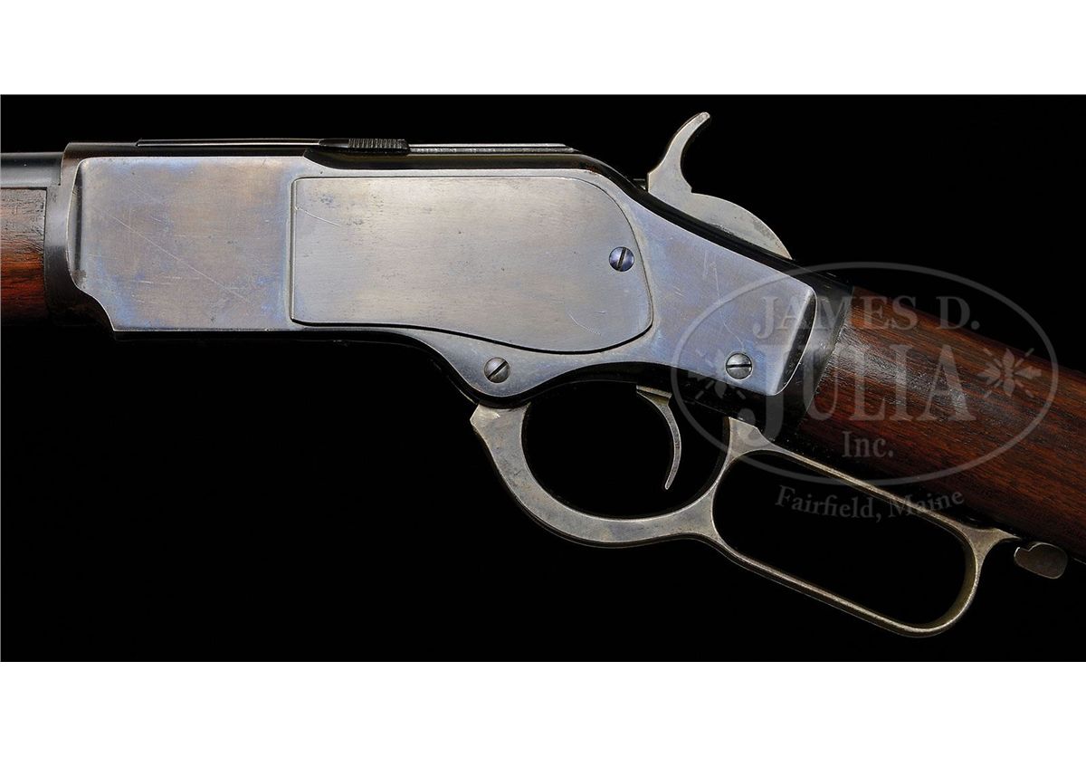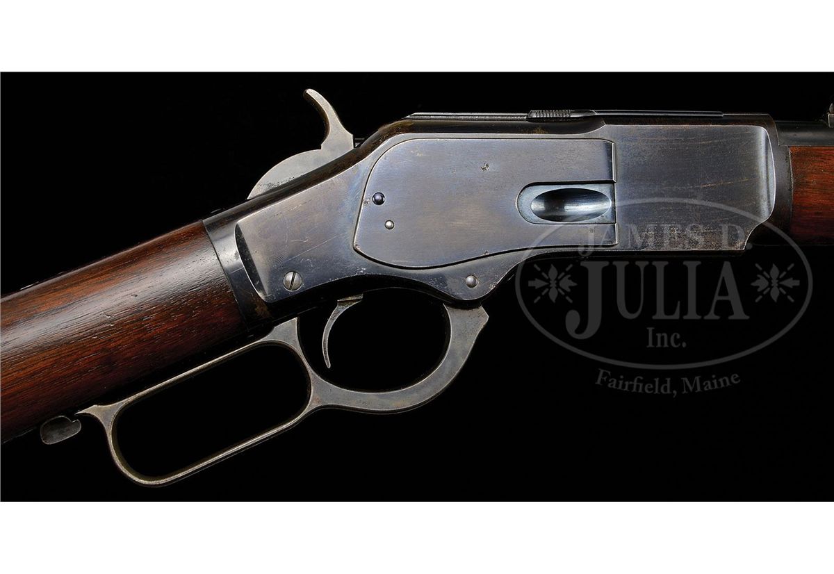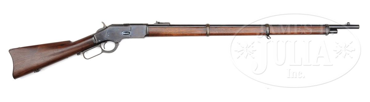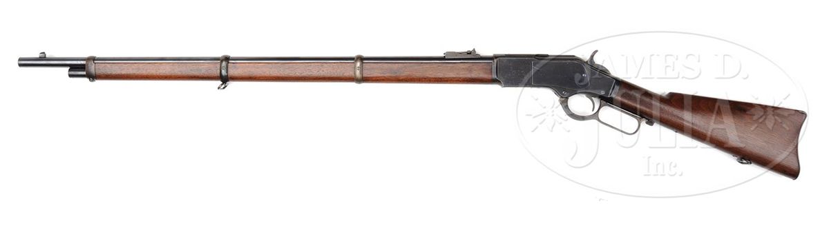 SN 571049. Cal 44 WCF (44-40). Standard 3-band musket with 30" bbl, full magazine, square base front sight/bayonnet lug and 900 yd musket ladder rear sight. Mounted with very nicely figured, uncheckered, straight grain American walnut with straight stock & carbine/musket buttplate with trap. There were about 721,000 Model 1873 firearms produced and according to the referenced publication only 5% were muskets. Extrapolation of those figures shows that there were only about 36,000 muskets produced. CONDITION: Extremely fine. Bbl & magazine tube contain 98-99% strong orig blue and the receiver 88-90% glossy orig blue with the loss areas flaked, not worn, to a light patina with some light candy striping. Lever retains most of its orig case colors, strong on the sides, turning silver on the outer faces. Hammer retains brilliant case colors. Wood is sound with a couple of very minor storage & handling nicks and retains virtually all of its brilliant oil finish. Loading gate retains about all of its bright fire blue. Mechanics are crisp, brilliant shiny bore. Appears to be unfired. 4-47828 JR117