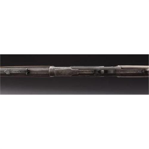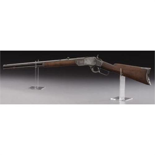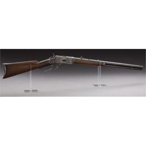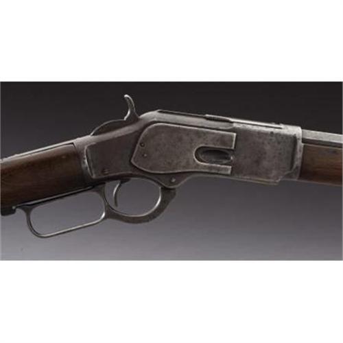 <B>WINCHESTER MODEL 1873 RIFLE</B></I> - Serial number 446637B, circa 1893. 24” octagon barrel in .44-40 calibre. All metal features as standard for this model. Legible barrel address. Action is very hard to operate. Initials “HKVB” have been scratched into bottom face of brass cartridge lifter.<BR><BR><B>Condition:</B></I>All metal surfaces have an uncleaned grey to brown coloration with scattered staining. Front sight is missing. Stock is an old weathered replacement with a coat of varnish applied. Forend is original with a 3” sliver of wood missing on the forward section.<BR><BR><b>Shipping:</b> Bats, Clubs, Sticks, Swords, Rif (<a target="_blank" href="http://www.heritageauctions.com/common/shipping.php">view shipping information</a>)