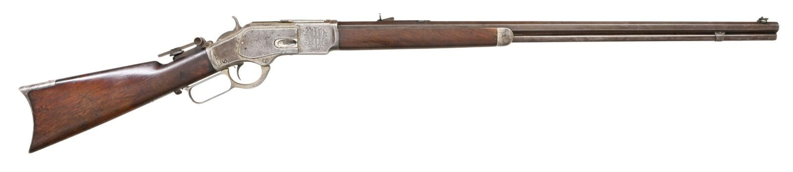 RIFLE. Cal. 32 WCF. S# 214273B. Bbl. 28" octagon, 4" longer than standard. Combination front sight, sporting rear sight w/ Vernier tang sight. Full length mag. 3rd model action & trim are nickel finished. Right side of frame has initials that may read "WHI". Single set trigger. Walnut forearm & straight grip stock w/ nickel finished crescent steel buttplate. UNATTACHED ACCESSORIES: Cody Firearms Museum records check detailing the following information, "Rifle. Caliber/Gauge: 32. Bbl Shape: Octagon. Length: 28. Trigger: Set. Nickel trims & receiver. Date Inspected: 7-26-1886. Date Shipped: 7-27-1886. Order #: 8117". CONDITION: bbl. & mag. tube have faded to a light brown patina. Action, buttplate & forearm cap retain 30% nickel finish w/ balance fading to brown. Wood has age darkened worn finish showing numerous scratches, marks & dents. Properly functioning set trigger. Dark pitted bore w/ partially intact rifling. (01-24192/DS). ANTIQUE. $3500-5000.