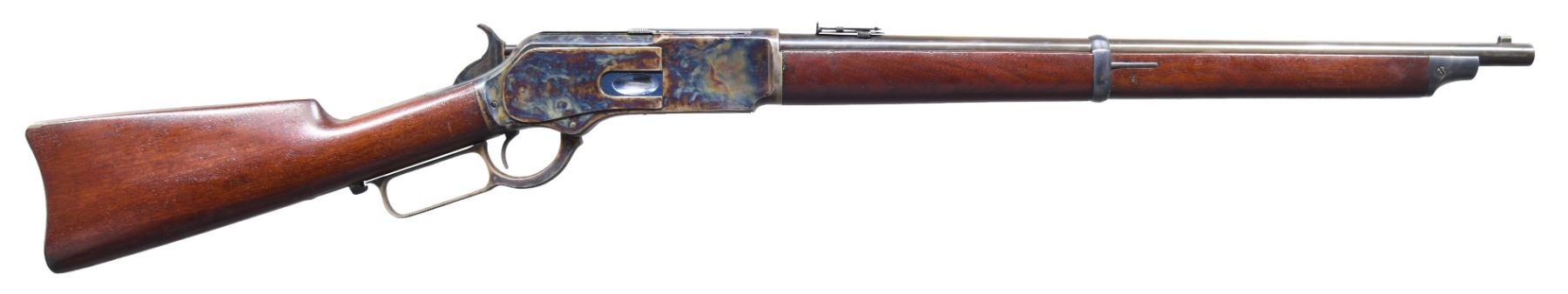 Cal. 45-75. S#. 62430. Bbl. 22" round carbine style. Barley corn front w/ carbine leaf rear sight. Blue finished bbl w/ case colored action & steel carbine buttplate. Action has saddle ring on left side having an added leather wrapping. Full length band fastened walnut forend w/ steel nose cap. Walnut carbine stock. UNATTACHED ACCESORIES: Cody Firearms Records check. "Type: Carbine / Caliber 45/45 - (typing mistake cal. is 45-75) / Case hardened / Received in warehouse on November 04, 1890 / Shipped from warehouse on November 06, 18980, Order number 20442". CONDITION: nicely restored carbine. bbl. blue is fading to brown. Action & buttplate have 90% re-case colored finish. Lightly refinished stocks show a few scratches & marks. Lightly pitted bore has intact rifling. (01-26813/DS). ANTIQUE. $3,000-5,000.