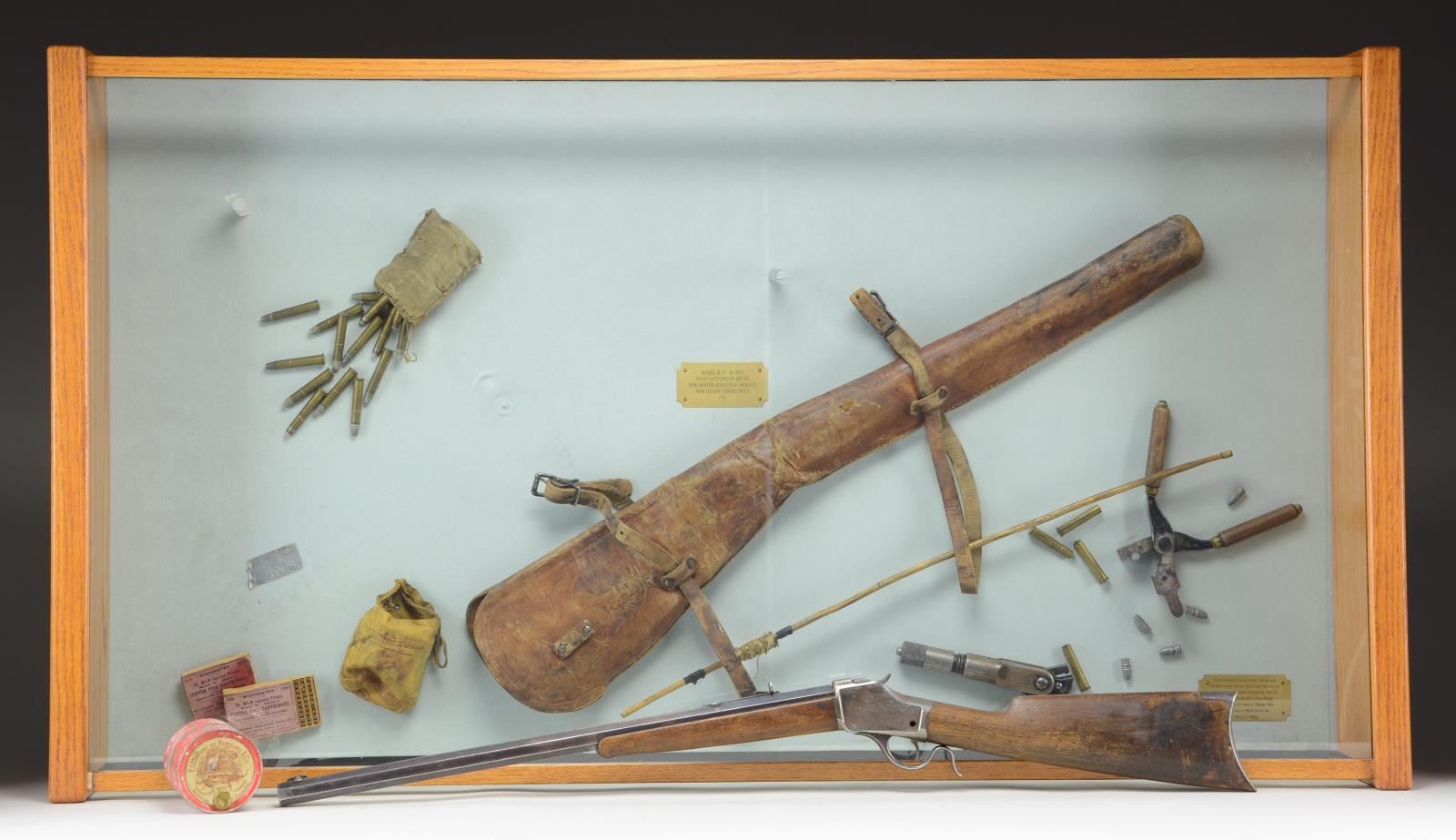 W/ ACCESSORIES IN DISPLAY CASE. Cal. 38-55. S# 76775. Bbl. 23 7/8". Model 1885 Low Wall single shot rifle mfg. by Winchester in 1896. Octagonal bbl. is marked w/ Winchester's address over the top flat, w/ the cal. designation marked on the bbl. at the breech. Dovetailed German silver blade front sight w/ dovetailed semi-buckhorn rear sight. Plain wood straight grip buttstock w/ schnabel tip forend. Buttstock exhibits 2 screw holes beneath the buttplate, which were used to mount the rifle within the case. Left side frame screw is no longer present, as it was removed & replaced with a contemporary screw that helped affix the rifle to the display case. Rifle is accompanied by a display case alongside several accessories including several rds. of ammunition, vintage primers, reloading equipment, projectiles, & several brass cases. Case exhibits a plaque on the interior that reads "Senator Galloway of Grand Junction, Colorado gave this rifle to George Swenton (Red George) who was one of the survivors of the Battle of Grand Lake. When he died in 1916 he left the rifle to Walter Eldridge who in turn left it to Maurice L. Eldridge. When he passed away in 1986 he left the rifle to Maurice D. Eldridge.". CONDITION: frame, lever, hammer, & buttplate exhibit a mottled gray patina. Bbl. exhibits wear overall w/ worn areas showing through to gray patina. Bore is bright, exhibiting strong rifling throughout. Wood furniture shows some marks from handling & storage, but otherwise remains sturdy & serviceable. (THIS IS AN OVERSIZED ITEM AND CANNOT BE SHIPPED. THIS ITEM WILL REQUIRE PICK UP OR A THIRD PARTY SHIPPING SERVICE). PROVENANCE: from the Lifelong Collection of Glen E. Mattox. (01-22575/MLW). ANTIQUE. $250-500.