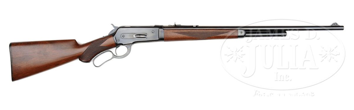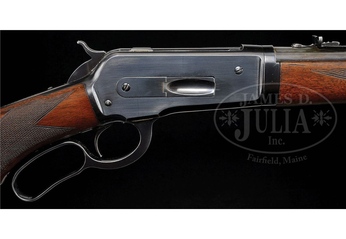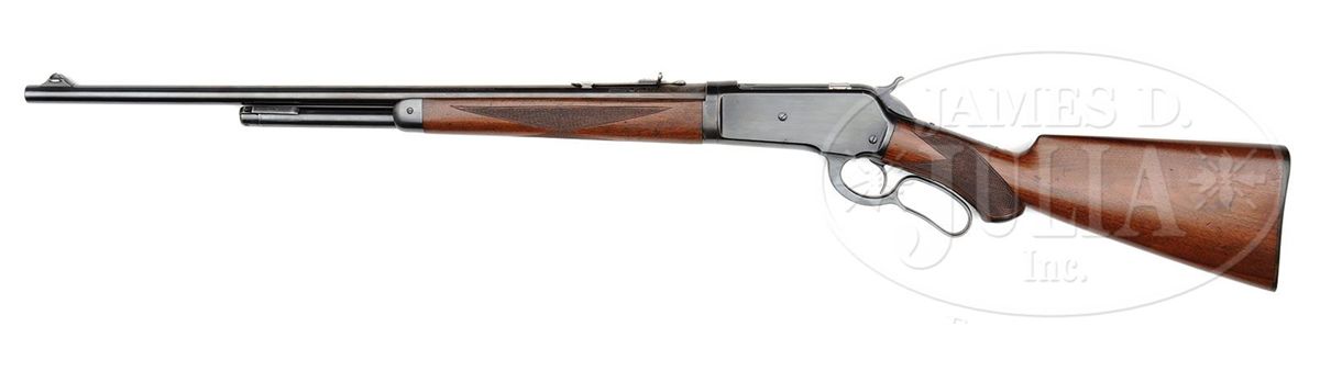 SN 154204. Cal. 33 WCF. Late special order deluxe rifle with 24" tapered, rnd light-weight bbl, 2/3 magazine, ramp mounted Lyman ivory bead hunting front sight and flat top rear sight. Mounted with slab-sawed American walnut with H-style checkered forearm and capped pistol gripped stock that has Winchester hard rubber buttplate. Left side of lower tang, under the wood is marked with the assembly number "352". Top tang channel of the buttstock has the assembly number "31". CONDITION: Fine. Overall retains about all of a fine professionally restored finish to the receiver, forend cap, take down ring, lever & hammer. Bbl and magazine tube retain most of their fine restored finish with a wear spot over the chamber area. Wood is sound with a few light nicks and scratches and retains about all of an extremely fine professionally restored finish showing moderate diamond point wear. Mechanics are crisp. Strong bore with sharp rifling, dark in the grooves. 4-49730 JR423