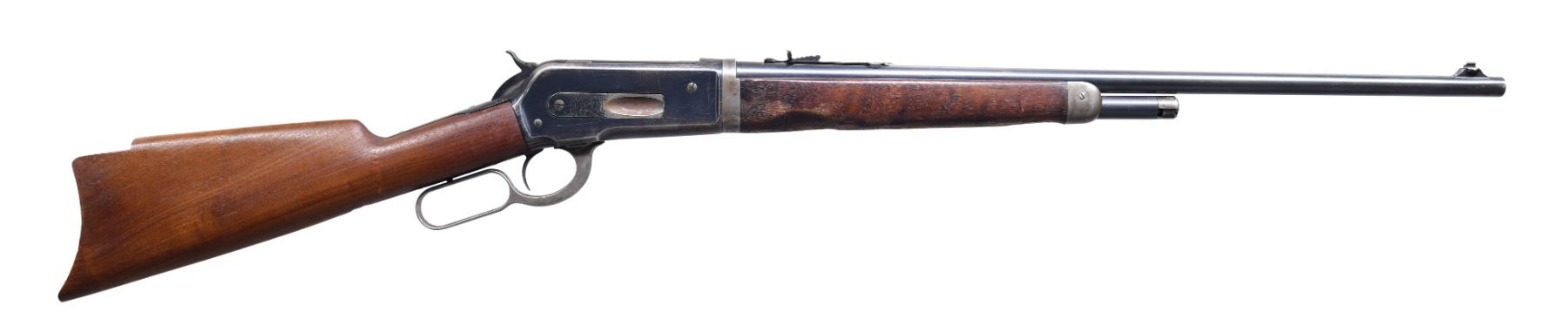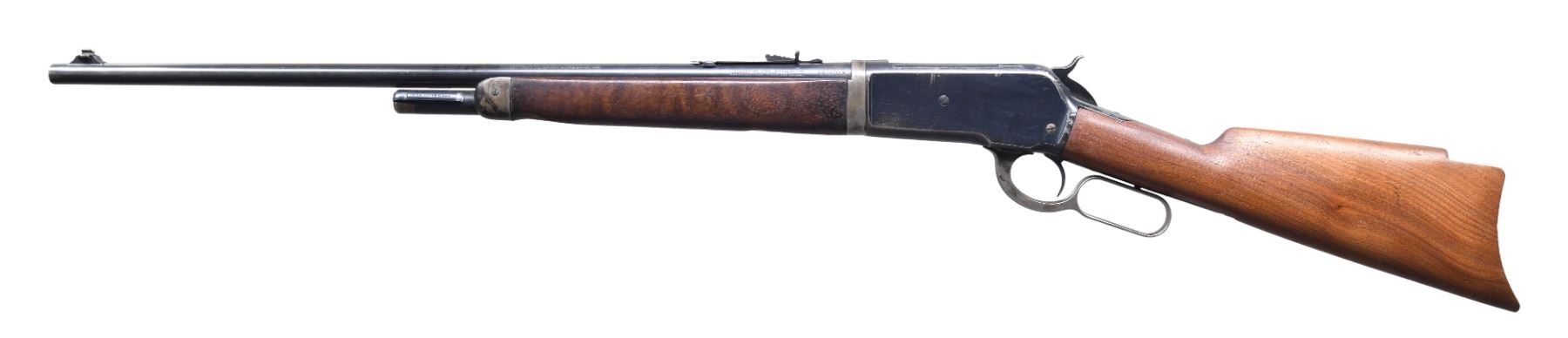 LEVER ACTION RIFLE. Cal. 33 WCF. S# 156015. Bbl. 24" tapered round of takedown style. Half length takedown mag. Ramp mounted replacement white bead front sight. Sporting rear sight is altered to resemble flat type style. Blue finished w/ case colored lever. Original walnut forearm shows deep gouges along bottom & right sides. Poorly fit replacement straight grip stock cut for crescent steel buttplate, buttplate is not present. Mfg. 1918. CONDITION: 70% lightly faded blue showing carry & edge wear. Lever retains traces of case colors. Forearm has worn finish showing gouges. Stock is partially sanded w/ a light coat of finish showing handling marks. Good mechanics. Bore retains sound rifling. (25-1479/DS). CURIO. $1,000-1,500.