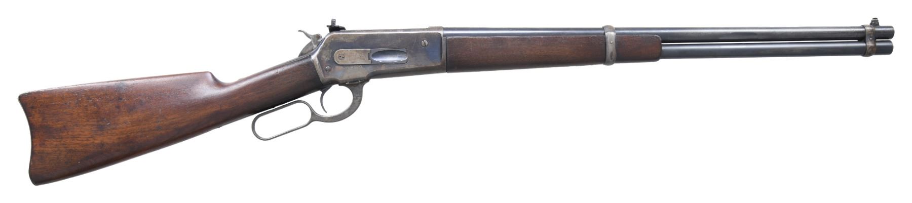 Cal. 50 EX (50-110). S# 148095. Bbl. 22" round. Pinned blade front sight w/ brazed bead & Lyman No. 21 "Climbin Lyman" receiver sight. Full length mag. Blued finish w/ case colored hammer & lever. Walnut carbine forearm & straight grip stock w/ steel carbine buttplate. Mfg. 1909. CONDITION: bbl. & mag. tube retain 80% lightly faded blue. Receiver retains 50% dull blue w/ balance flaking to brown. Hammer & lever have lightly visible case colors. Original wood finish shows light wear w/ scratches & marks, having a series of dents on the left side of the forearm. Bore is generally bright retaining strong rifling. (25-1313/DS). CURIO. $5,000-8,000.