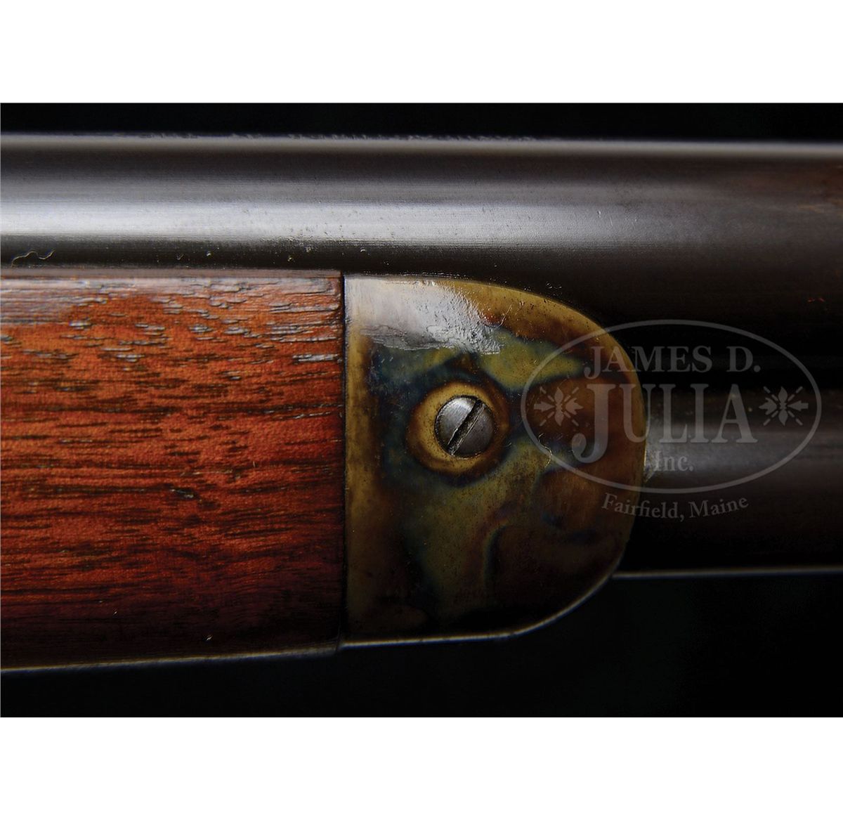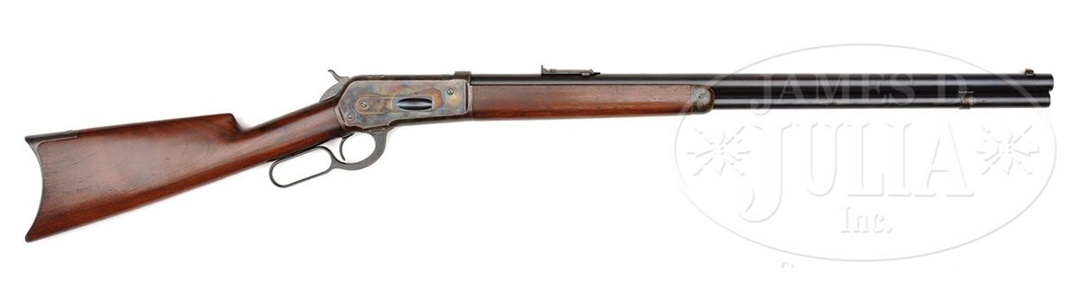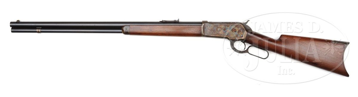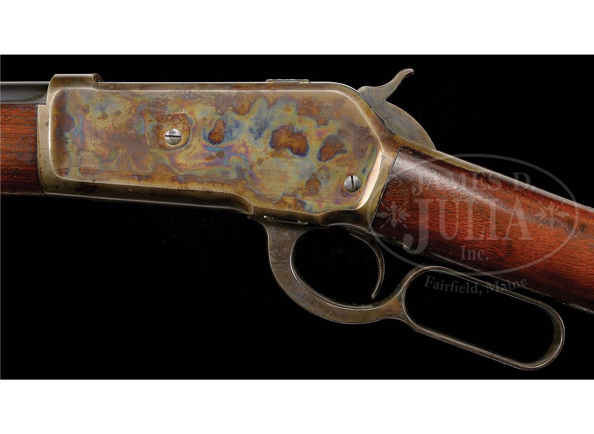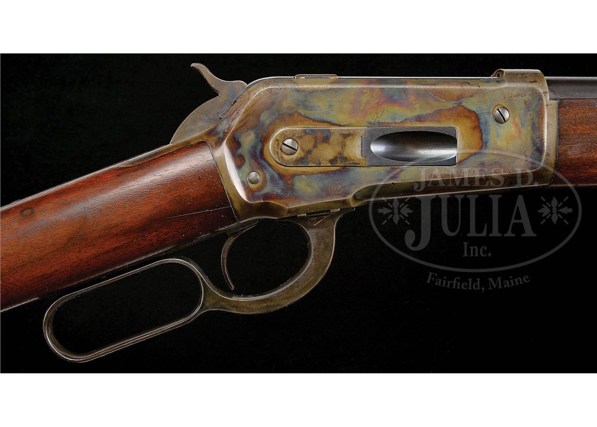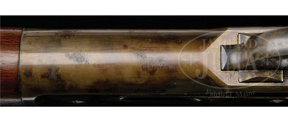 SN 49843. Cal. 45-70. Standard grade rifle with 26" rnd bbl, full magazine, half nickel front sight and "1886" marked ladder rear sight. Mounted with uncheckered, very nicely figured American walnut with straight stock & crescent buttplate. This rifle was produced in 1891 when the west was still a little wild and most business & transportation was still conducted from the back of a horse or wagon and hunting was a way of life. Firearms of that era were exposed to the elements and saw hard service and are rarely found today with high orig finish. CONDITION: Very fine. Bbl & magazine tube retain about 98% strong orig blue with a small scrape and a couple of spots of rust on the bbl; receiver retains brilliant case colors on sides with some surface spotting on left side, strong & bright over the top and lightly to moderately faded on bottom; bottom also has a few small scattered spots of fine pitting; lever retains brilliant case colors and the hammer strong, dark colors; forend cap retains about all of its brilliant orig case colors; buttplate is mostly faded to a silver/brown patina. Stock has a hairline on right wrist, otherwise wood is sound with a very few, very scattered tiny nicks and retains virtually all of its crisp, orig factory finish. Mechanics are crisp, brilliant shiny bore with a couple of small spots near the middle, may be unfired. 4-49504 JR404