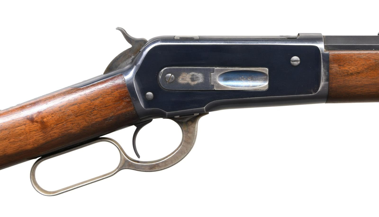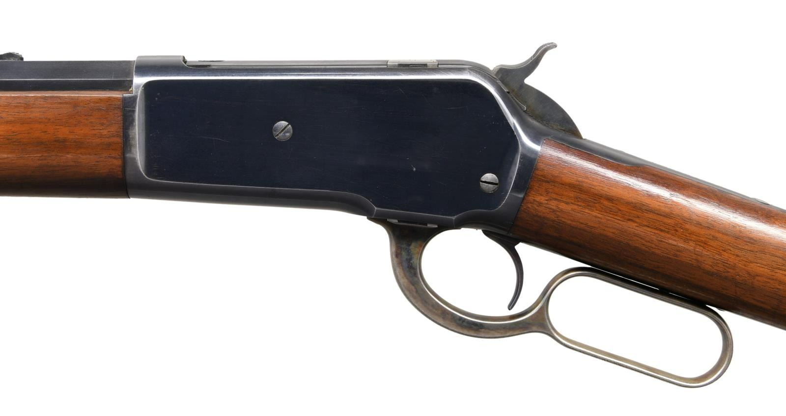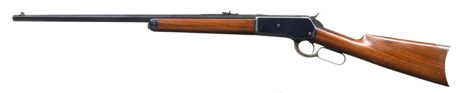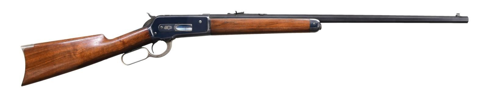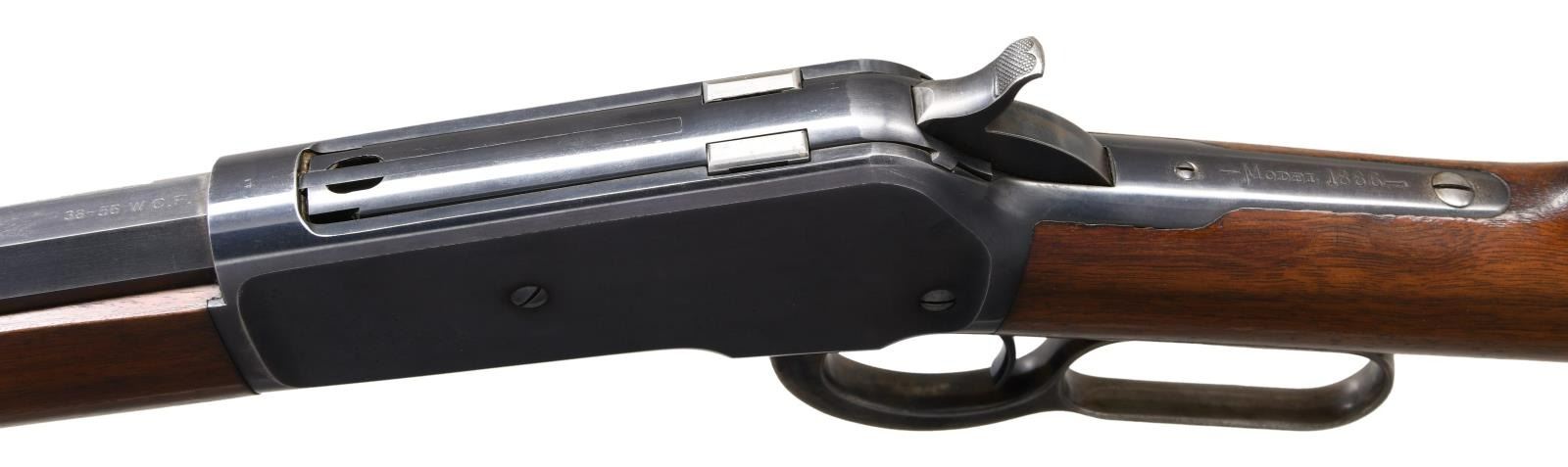 Cal. 38-56 WCF. S# 103001. Bbl. 26" octagon. Lyman white bead front sight w/ elevator adj. sporting rear sight altered to flat top style. Button mag. Blue finish w/ case colored hammer & lever. Walnut forearm & straight grip stock w/ crescent steel buttplate. Mfg. 1895. CONDITION: bbl. & action retain over 90% original blue showing carry & edge wear. Hammer retains 90% dark case colors. Lever retains good case colors on sides w/ silvering in carry areas. Buttplate case colors have faded to silver/gray. Original wood finish shows light scratches & marks. Bright near excellent bore. (01-25238/DS). ANTIQUE. $5,000-8,000.