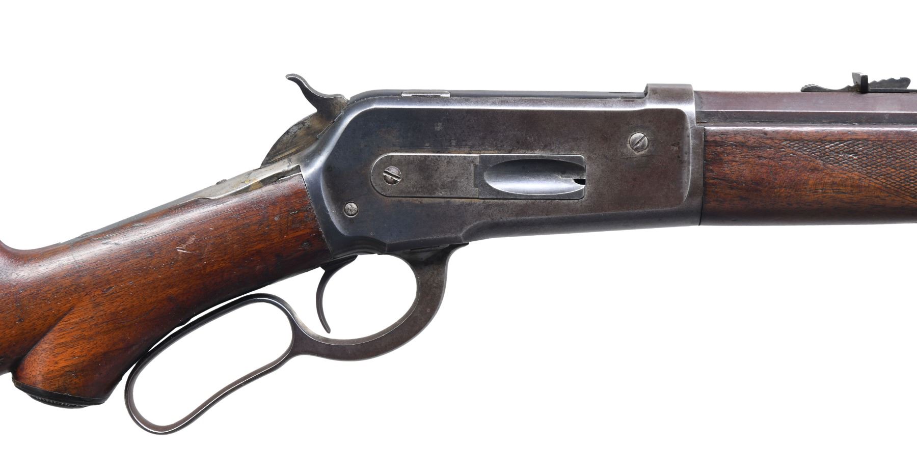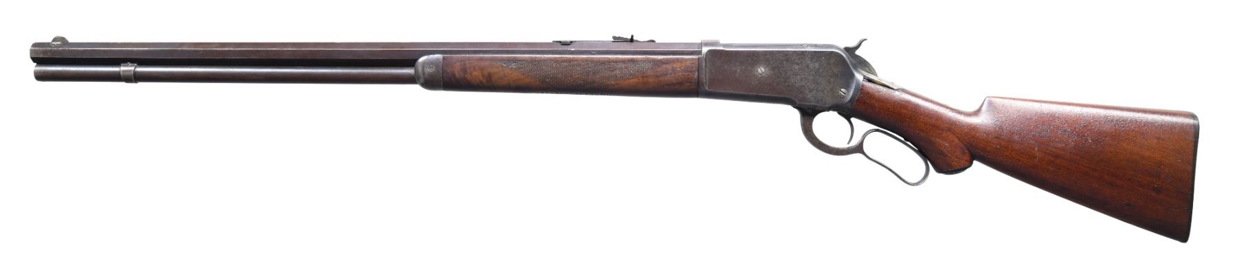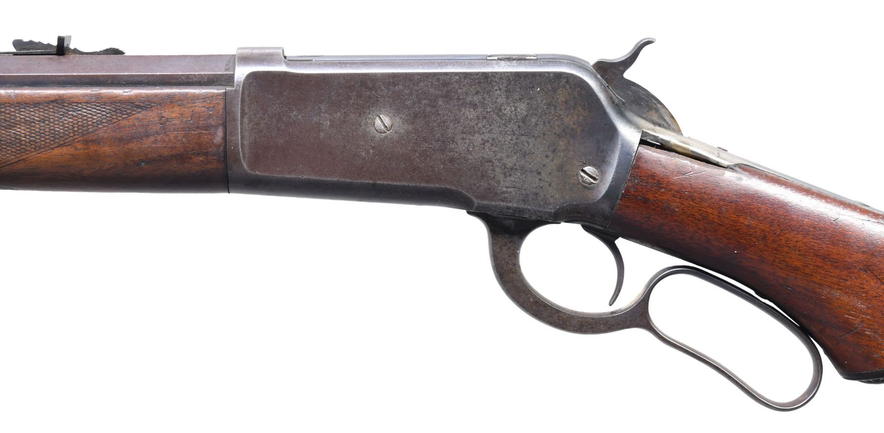 Cal. 38-56 WCF. NSN due to replacement lower tang. Bbl. 26" octagon. Lyman no.4 hunting front sight w/ flat top sporting rear sight. Full length mag. Forearm of fancy walnut has style H checkering. Hard rubber capped pistol grip stock w/ hard rubber shotgun buttplate is a replacement as is un-serial numbered lower tang. CONDITION: metal finish has largely faded to gray. Forearm has worn original finish & checkering showing scratches & marks w/ a chip along bbl. channel on right side. Stock has worn finish showing scratches & marks w/ large chips on either side of top tang. Top tang has been broken & brazed. Dark lightly pitted bore w/ intact rifling. (25-1483/DS). CURIO. $1,500-2,500.