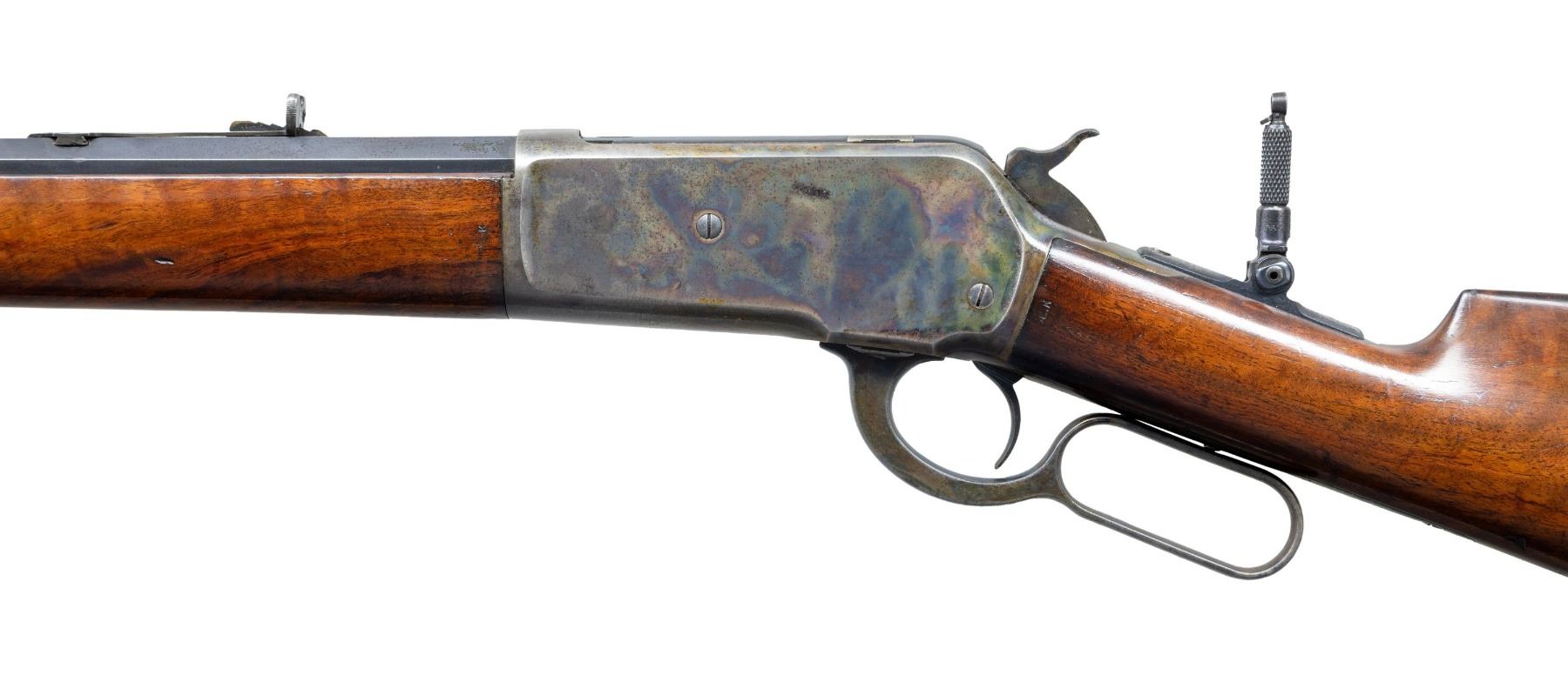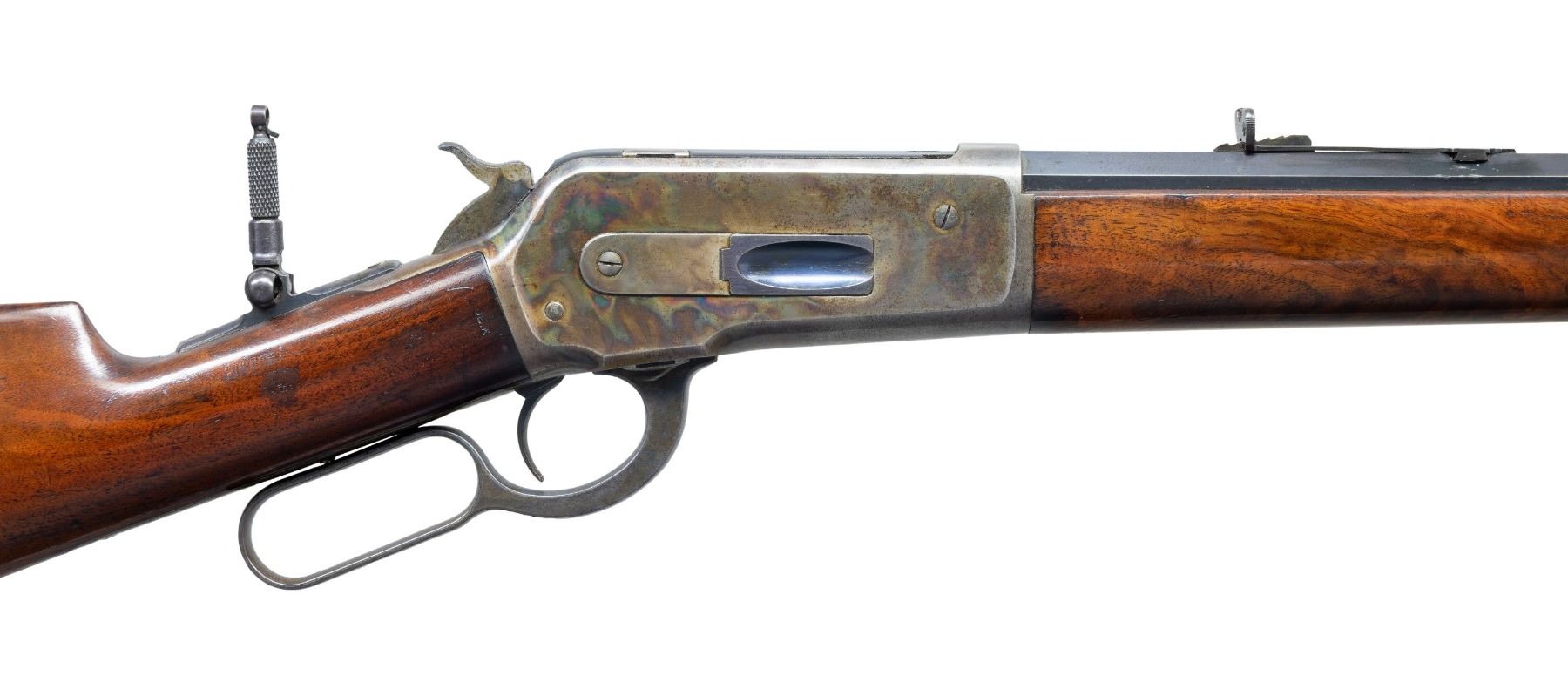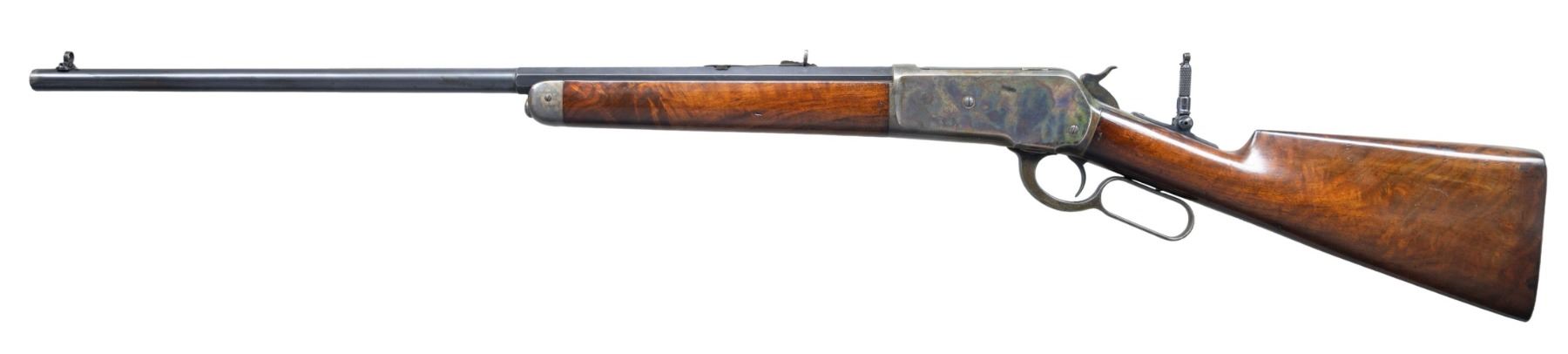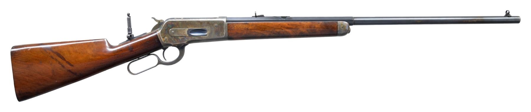 Cal. 45-70. S# 107047. Bbl. 26" octagon to rnd. Combination front, sporting rear sight, with Lyman combination tang sight. Left side of action has hand scratched initial "W". Button mag. Case colored action and fittings. Forearm and straight grip stock with steel shotgun buttplate of extra finish walnut. Left inside of lower tang is has assembly # "939RB". Top tang channel of stock is stamped "25". Both sides of the wrist behind the action have stamped marks "DE.K". Left side also has 3 light marks that appear to be intentionally cut notches. UNATTACHED ACCESSORIES: Winchester factory letter dated "June 6, 1983" from William L. Porter stating: "rifle/ 45/70/ 1/2 octagon barrel/ plain trigger/ 1/2 magazine/ shotgun butt/ rubber buttplate/ Received in warehouse on 11, 1896/ Shipped from warehouse on August 12, 1896.". CONDITION: bbl. retains 75% lightly faded blue showing carry and edge wear with spots handling marks, and light pitting. Action retains 70% lightly faded case colors showing scattered dark spotting. Original wood finish has areas of finish loss with scattered scratches and marks. Sound mechanics. Very good bright bore. PROVENANCE: The Esteemed Norm Greenberg Collection. (01-27718/DS). ANTIQUE. $3,000-5,000.
