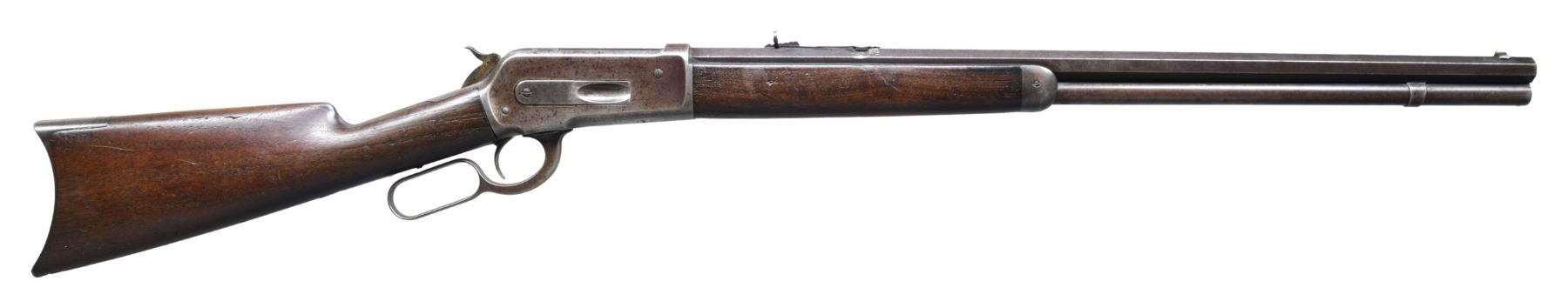 Cal. 45-70. S# 31421. Bbl. 26" octagon, with sporting sights. Full length mag. Original finish was blue, with case colored action. Walnut forearm and straight grip stock, with crescent steel buttplate. Mfg. in 1889. CONDITION: metal finish has faded to mottled brown, showing small dents and marks, with spotted surface corrosion and very light pitting. Wood has age darkened worn appearance, showing scratches, marks, and dents. Toe of stock has a carved marking that appears to be the initial "H". Sound action. Upper and lower tang screws are replacements. Dark pitted bore, with partially intact rifling. (01-27145/DS). $2,000-3,000.