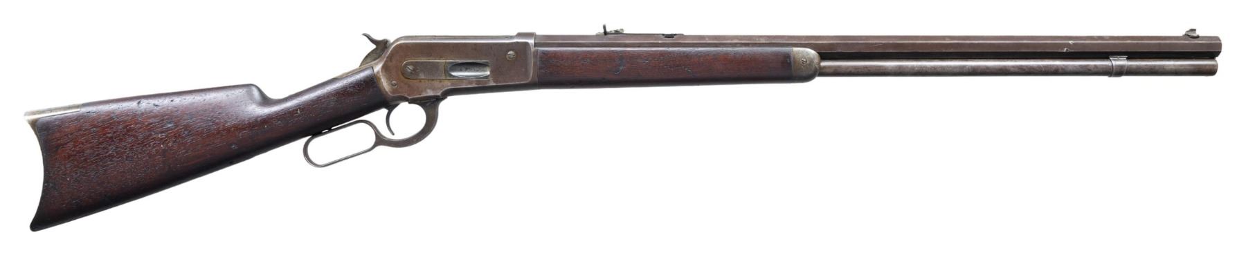 Cal. 40-65 WCF. S# 72607. Bbl. 26" octagon. Lyman front sight with broken bead and flat top sporting rear sight. Full length mag. Blue and case colored finish. Walnut forearm and pistol grip stock, with crescent steel buttplate. Mfg. in 1892. CONDITION: metal finish has faded to mottled gray/brown, showing dents and handling marks, with spotted surface corrosion. Mag. tube has small dents, 6" and 12" from the muzzle. Wood has age darkened worn appearance, showing scratches and marks. Sound action. Bore retains generally sound rifling, showing spots of pitting. PROVENANCE: Estate of Russell Dickerman. (01-27112/DS). ANTIQUE. $1,500-2,250.