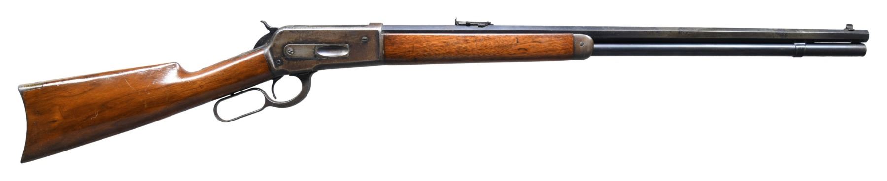 Cal. 45-70. S# 152698A. Bbl. 26" octagon. Sporting front sight, with graduated leaf rear sight. Full length mag. Blue finish with case colored hammer and lever. Walnut forearm and straight grip stock, with crescent steel buttplate. Mfg. in 1912. CONDITION: bbl. and mag. tube retain 70% lightly faded blue, showing spots of pitting. Action has some blue in protected areas, with balance fading to gray, showing surface corrosion and spots of pitting. Hammer and lever retain traces of case colors. Crescent steel buttplate is pitted. Stock and forearm have added finish over scratches and marks. Sound action. Very good bright bore. (25-2443/DS). CURIO. $2,500-3,500.