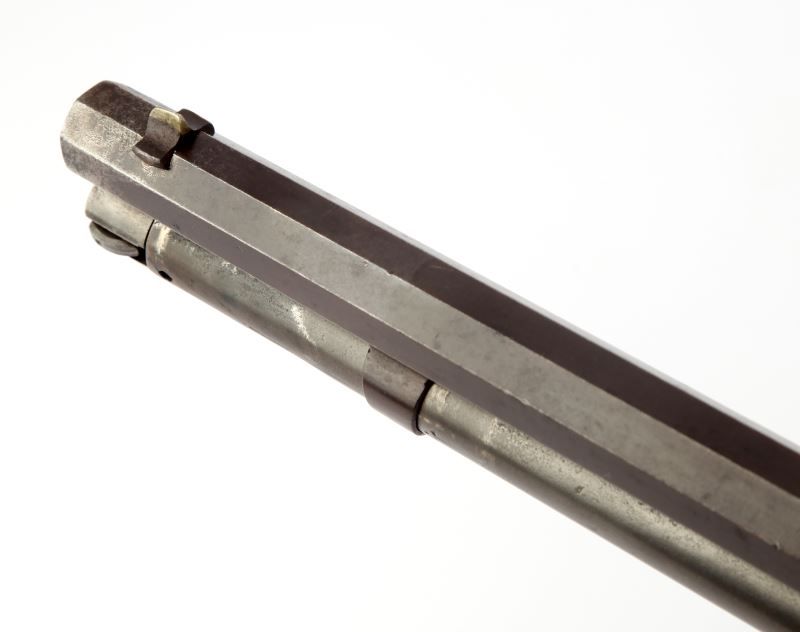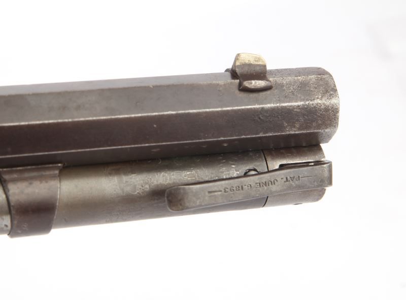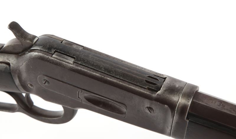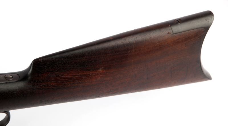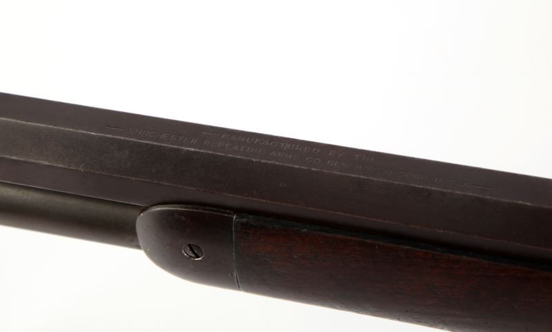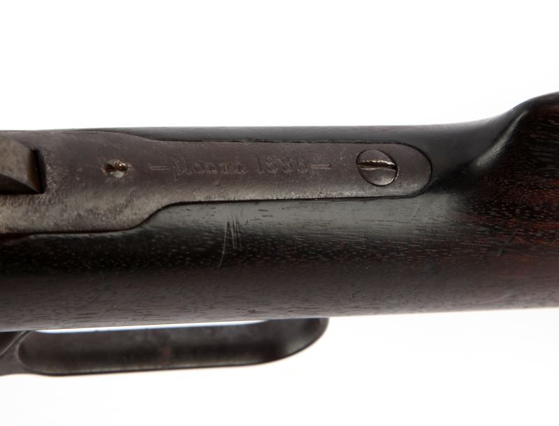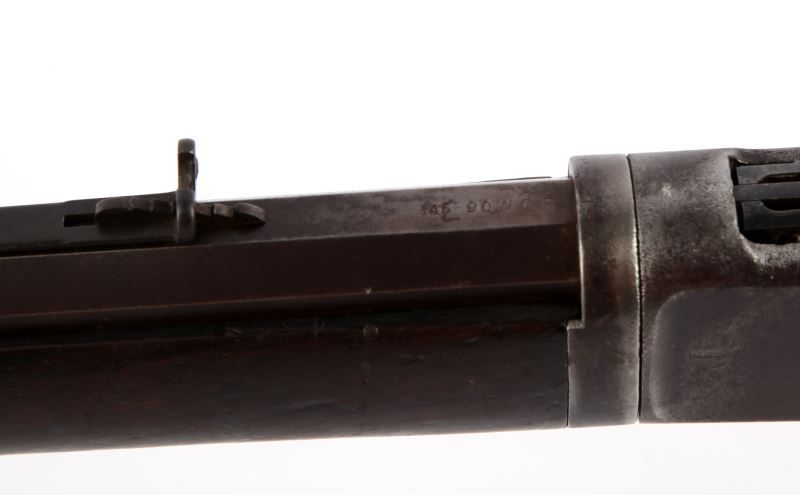 Winchester Model 1886 lever action rifle with octagon barrel, chambered in .40-90 WCF. Serial number indicated manufacture in 1894. Barrel measures 26 inches, with two line Winchester address on top, and ".40-90 WCF" by receiver. Two line patent dates, as well as serial number located under lever on lower tang. "MODEL 1886" stamped on upper tang. Bore is remarkably bright and clean, with grooves remaining well defined. Plum patina covers most metal surfaces, with long ago cleaned pitting on top of receiver and tang. Fore end and stock remain very good, retaining crescent steel butt plate. Wood shows expected wear under dark handling patina, but no cracks or integrity problems. Overall very good condition for the age. Caliber: .45-90 Serial #: 91093