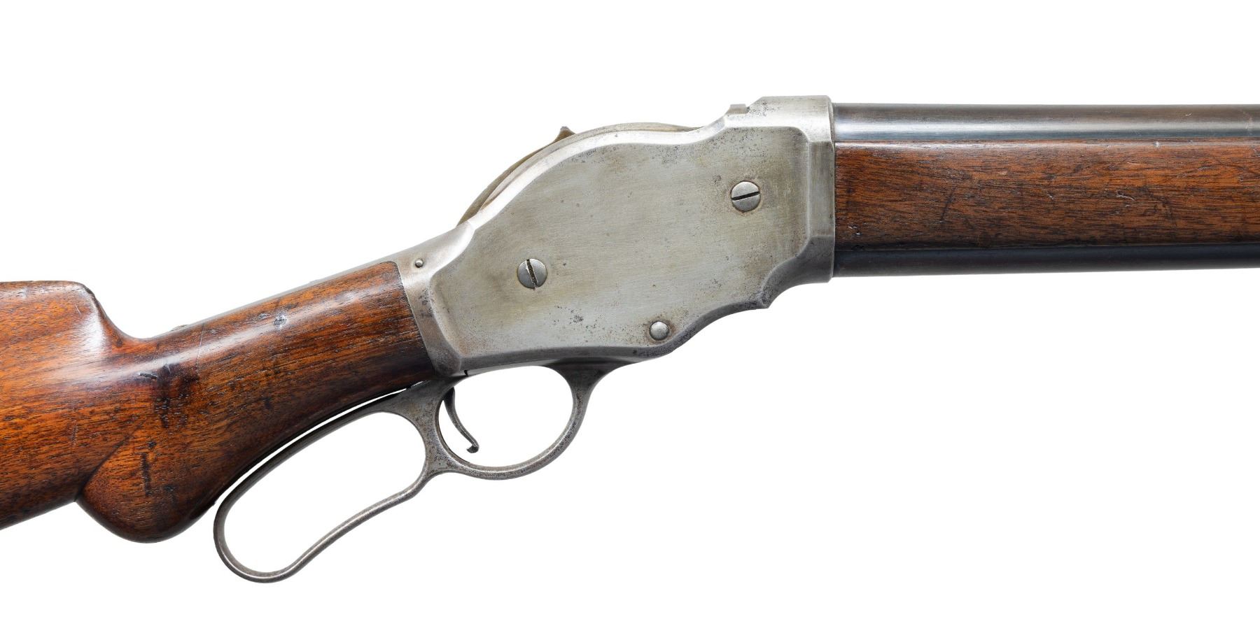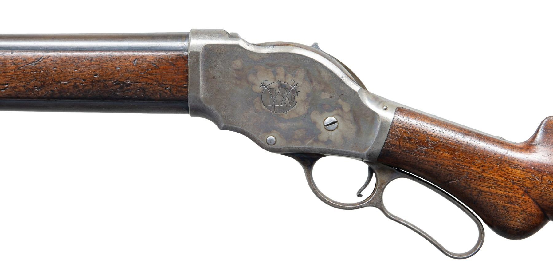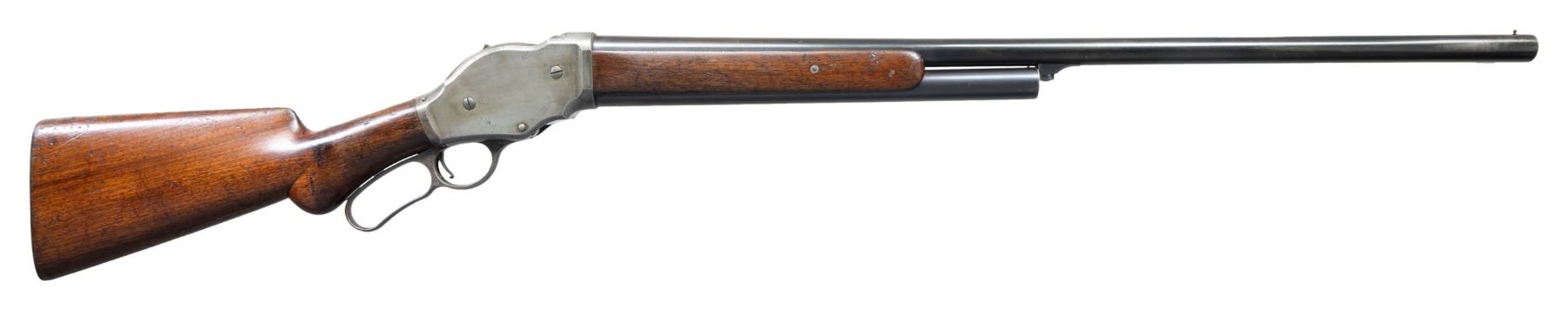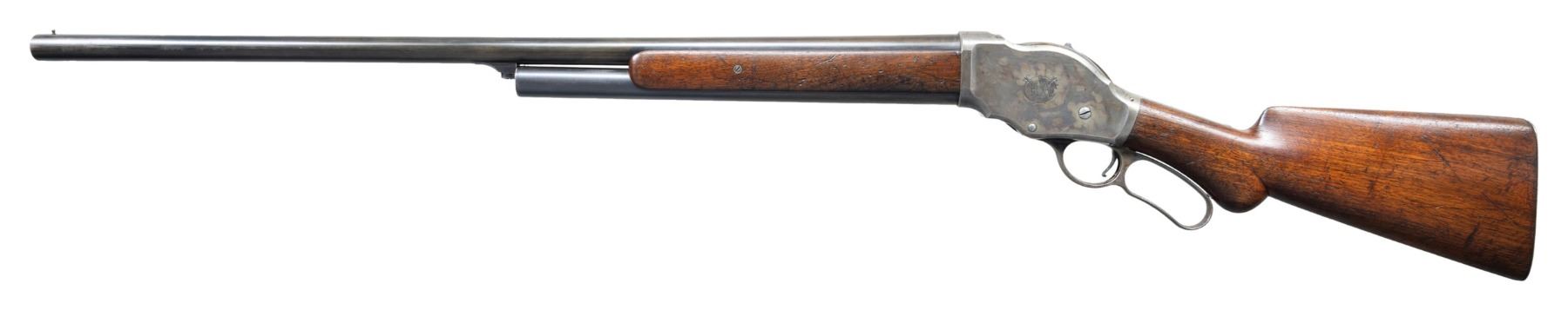 Cal. 12 GA, 2 5/8". S# 8017. Bbl. 30" plain with steel bead sight. Half length tubular mag. Case colored action. 2-panel walnut forearm and rnd. knob stock with checkered steel shotgun buttplate. Mfg. in 1888, second year of production. UNATTACHED ACCESSORIES: handwritten index card showing shipping information supplied by Cody Firearms Museum indicating warehouse receipt and date shipped as 1/26/88. CONDITION: bbl. and mag. tube have over 70% lightly faded blue. Action retains light but pleasing visible case colors on the left side and breechblock. The right side has largely faded to gray and shows small dark spots. Wood finish shows wear with numerous scratches, dents, and marks. Sound mechanics. Bore is generally bright showing scattered spots of very light pitting. PROVENANCE: The Esteemed Norm Greenberg Collection. (01-27710/DS). ANTIQUE. $800-1,200.
