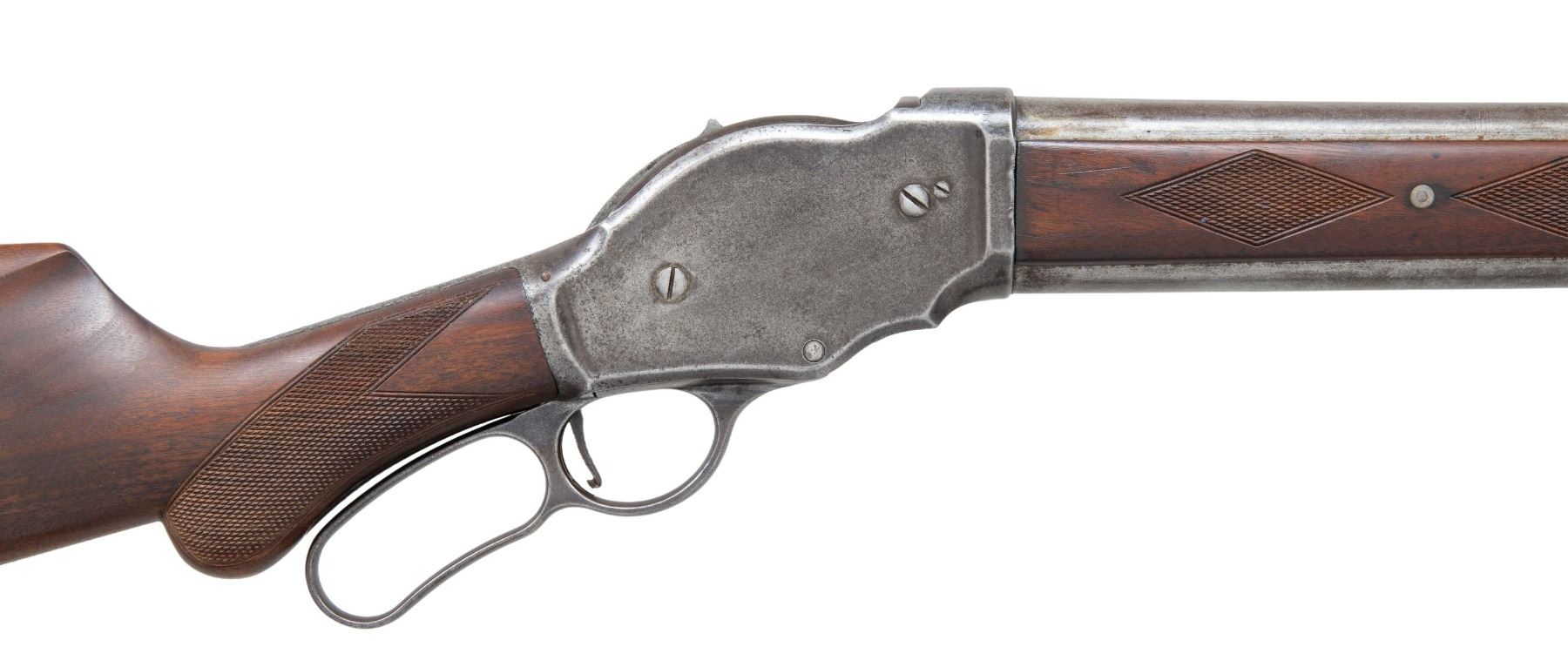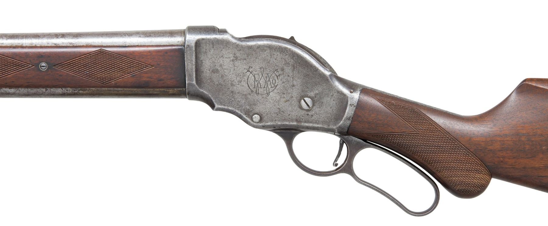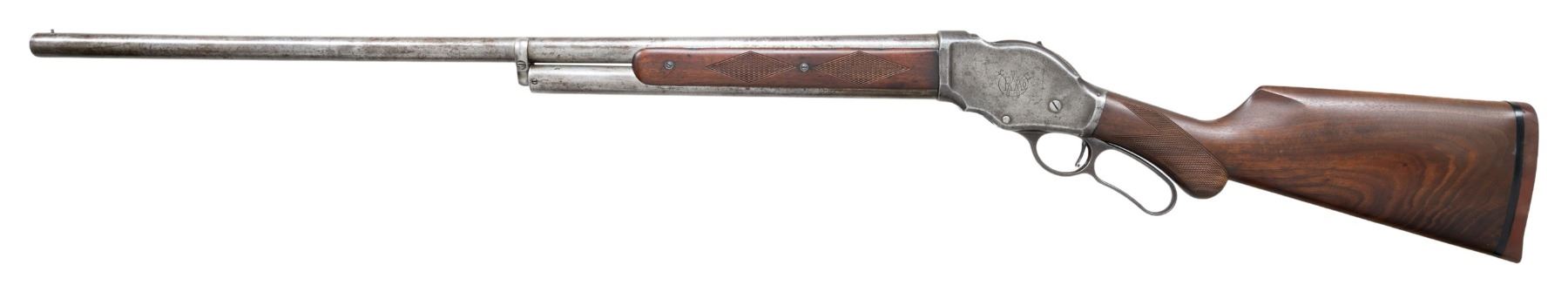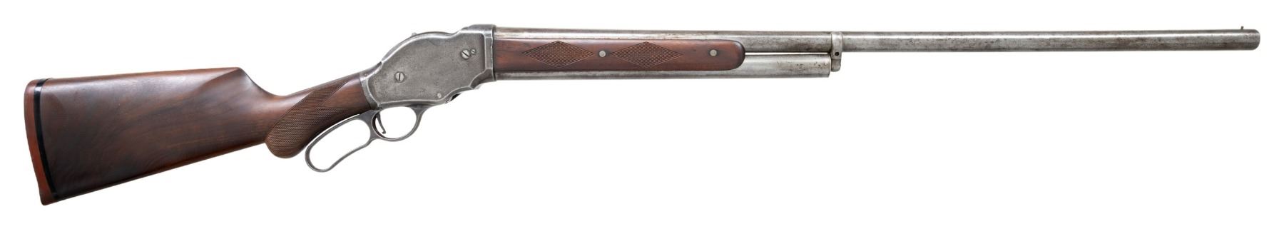Cal. 12 5/8" GA, 2 7/8". S# 46295. Bbl. 32" plain with fixed Full choke and brass bead. Tubular mag. Left side of receiver has "WRA" monogram. 2-piece walnut forearm panels have added checkering. Replacement round knob walnut stock with hand checkering. LOP: 14 5/8" over a Winchester solid red pad with a patent date of June 6th 1922. Mfg. in 1892. CONDITION: metal has faded to gray showing general very light pitting. Refinished forearms show light marks. Replacement stock has good satin finish showing small handling marks. Functioning mechanics. Pitted bore. (01-28147/DS). ANTIQUE. $700-1,000.